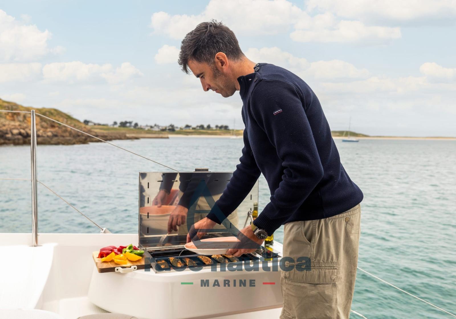 Auvents dans les cabines, Kit d’amarrage + 6 défenses, Grand-voile à corne de latte complète, Lazy Jack, Winch électrique 1000 Watts, Antenne VHF en tête de mât pré-câblée, Double butée pour dégaine de ris 2 et 3, Prise interne 12v, Prise externe étanche 12v, Douche de pont (eau chaude), Pompes de cale retardatrices, Lazy Bag, Housse de gouvernail, Treuil électrique avec drisse de grand-voile, Lumières intérieures de courtoisie, Eau de mer sous pression, Pack Audio Fusion Bluethoot 4HP, 220V Secteur principal avec chargeur, Chargeur convertisseur 2000W/ 220V 50Hz secteur, 2 moteurs Yanmar 40HPCoussins extérieurs PVC Beige/Noir helios, Coussins intérieurs PVC Nature, Stores extérieurs sur les fenêtres de la dînette, Extension de la table de cockpit en teck, Coussins extérieurs dont FLY, Ailes de tableau arrière, taquets d’amarrage arrière supplémentaires, Barbecue à gaz, Main courante sur l’échelle, Table de salon convertible en lit, Double poste de pilotage VHF AIS, Pack de croisière GARMIN 2, 4 WC électriques en grande tasse, Batterie auxiliaire AGM supplémentaire, Bout-dehors et équipement pour Gennaker, Commande de treuil supplémentaire avec compteur de chaîne, Antifouling, Amorce Epoxy, Treuil de bossoir électrique, Chaîne + ancre 20KG.