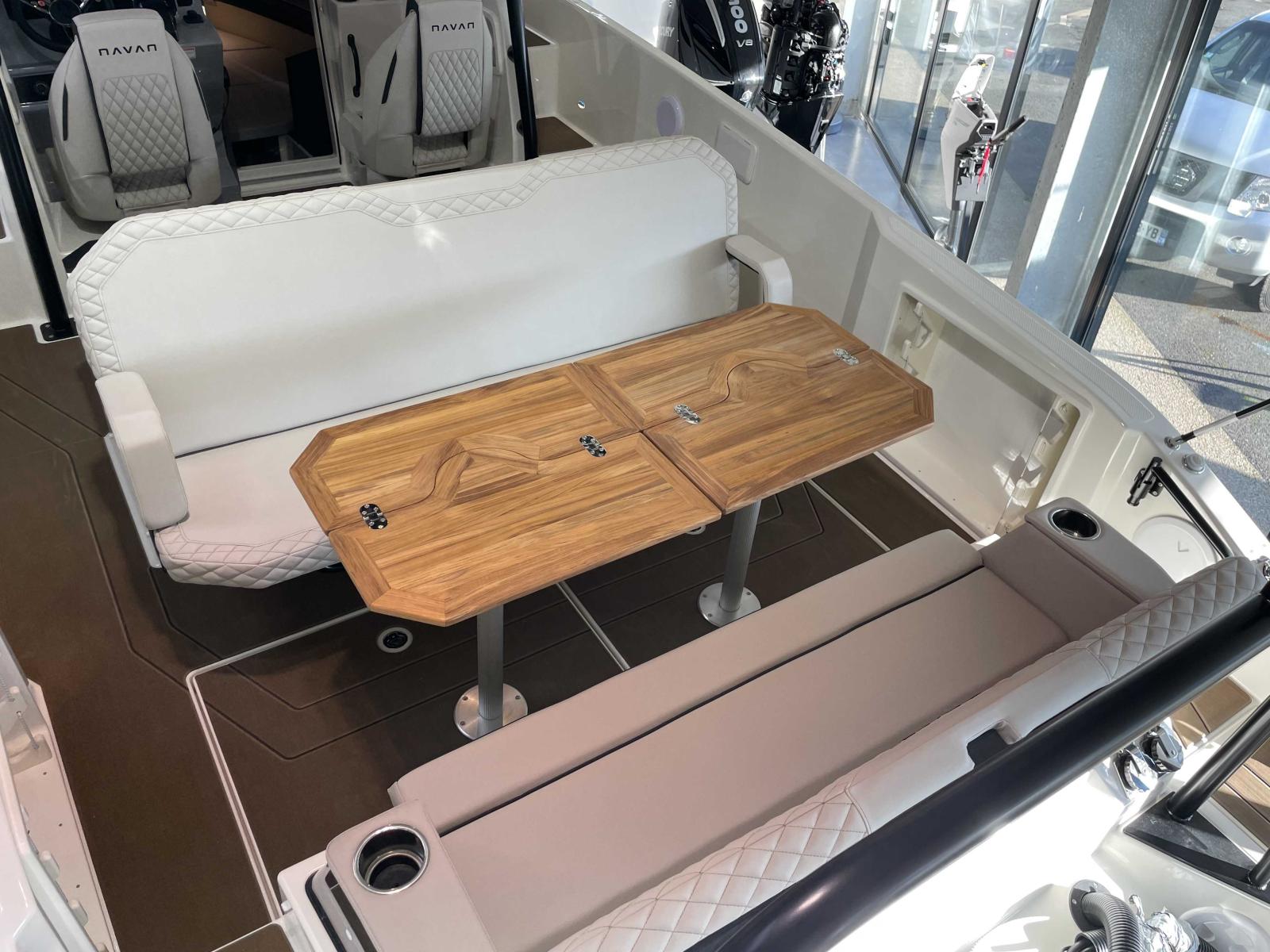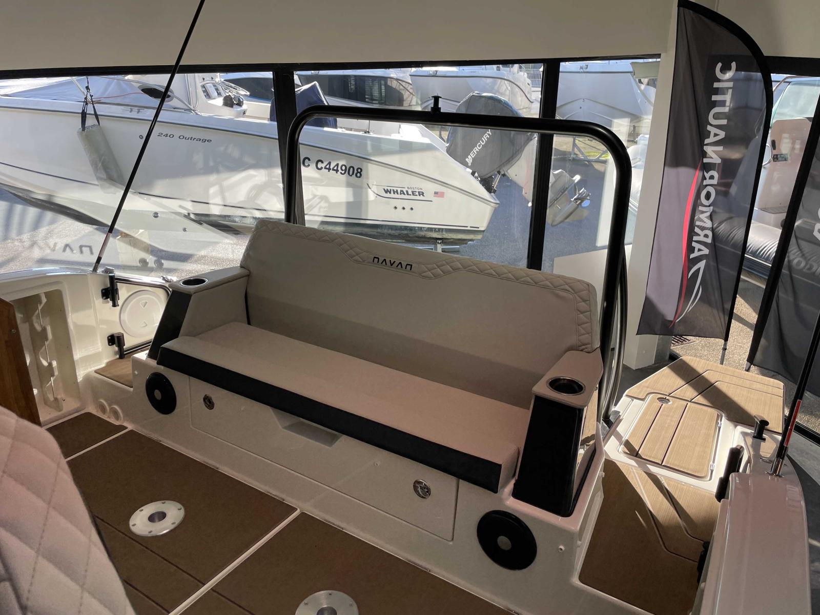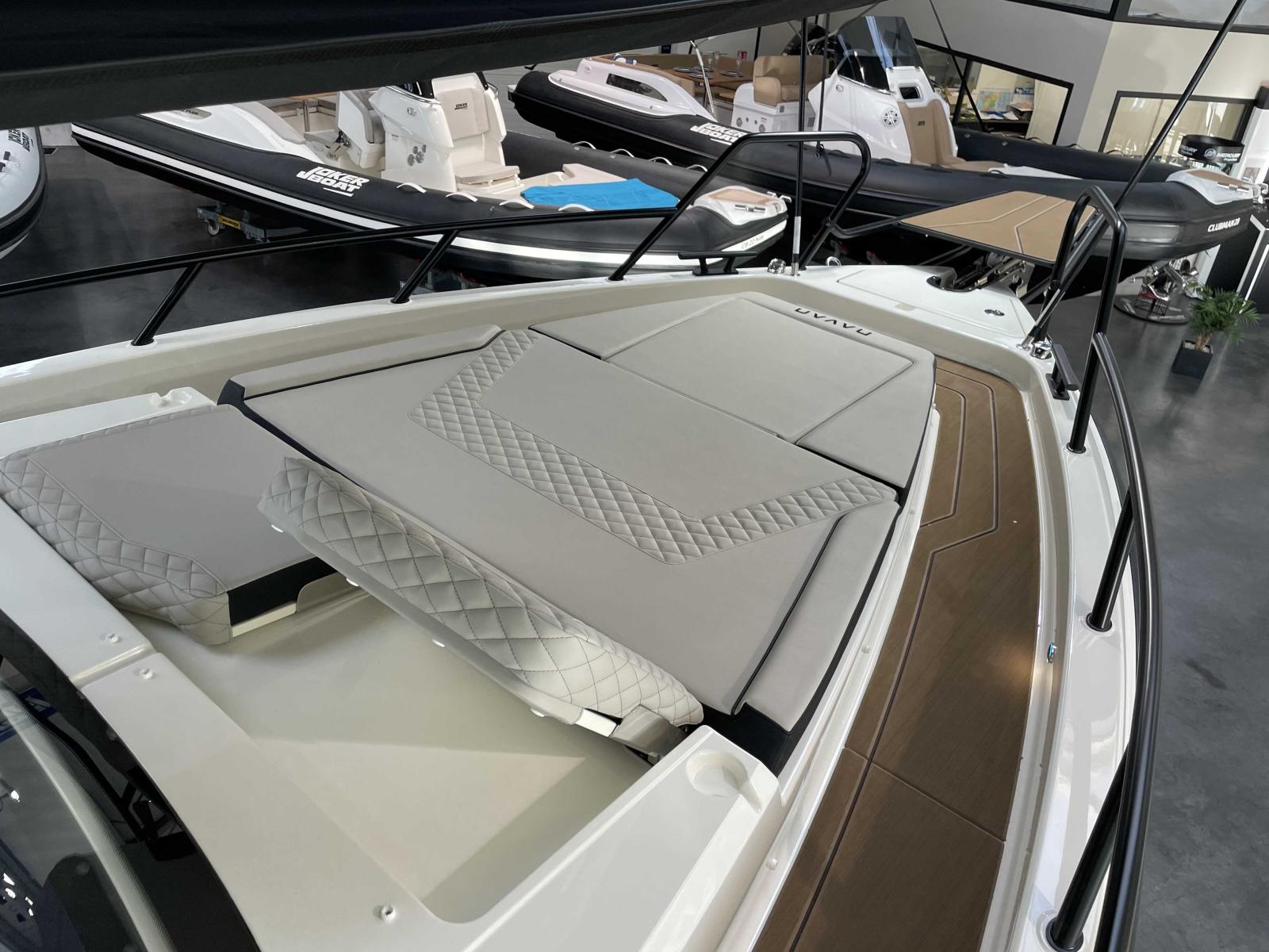 Tauds assises cockpit, cuisine de cockpit, tableau de bord, assise pilote et co-pilote et bain de soleil avant.