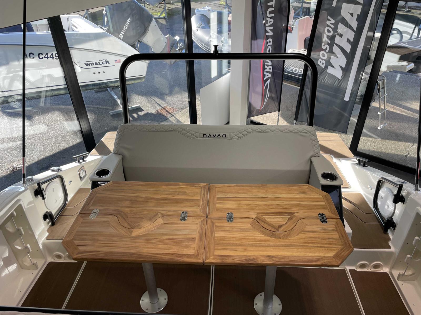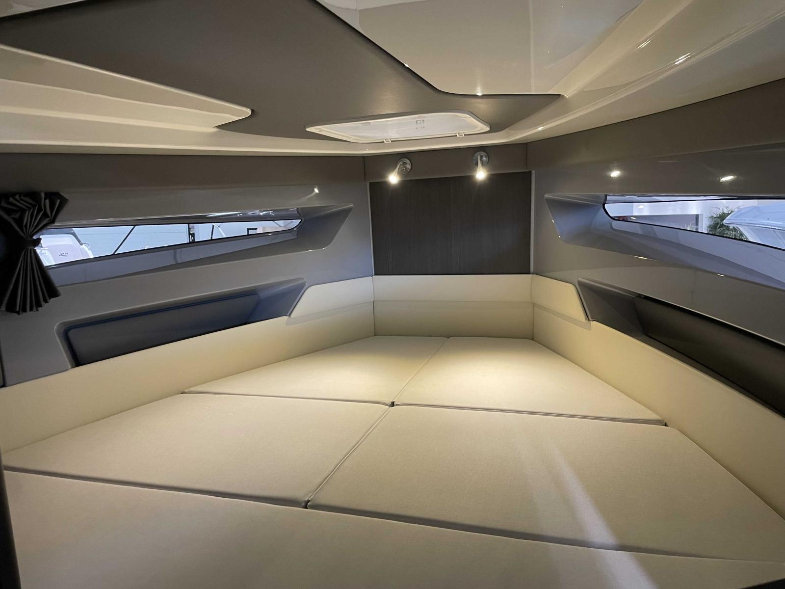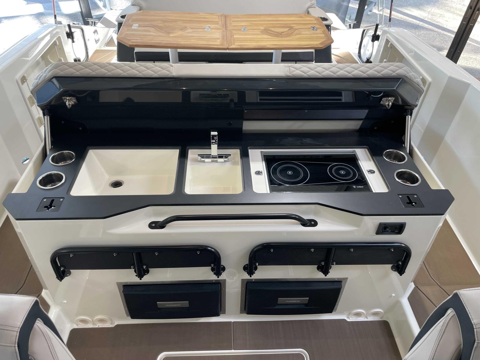 Tauds assises cockpit, cuisine de cockpit, tableau de bord, assise pilote et co-pilote et bain de soleil avant.