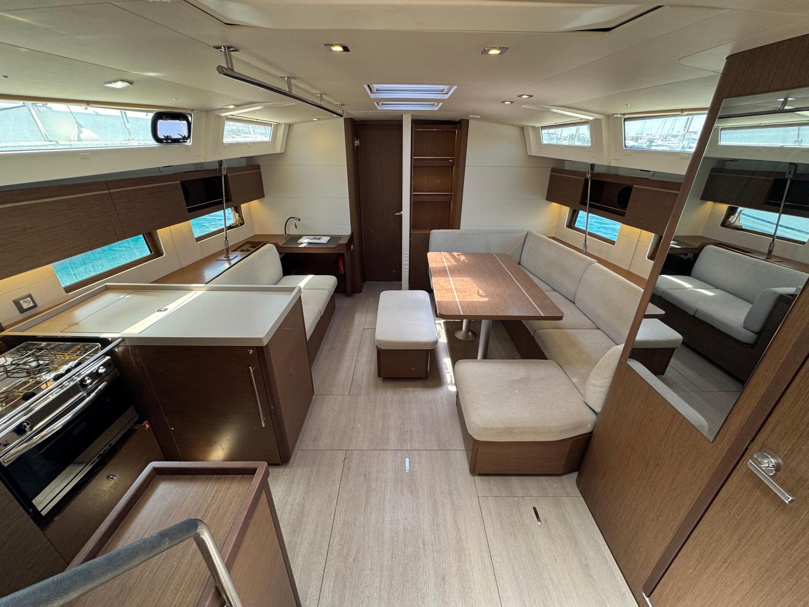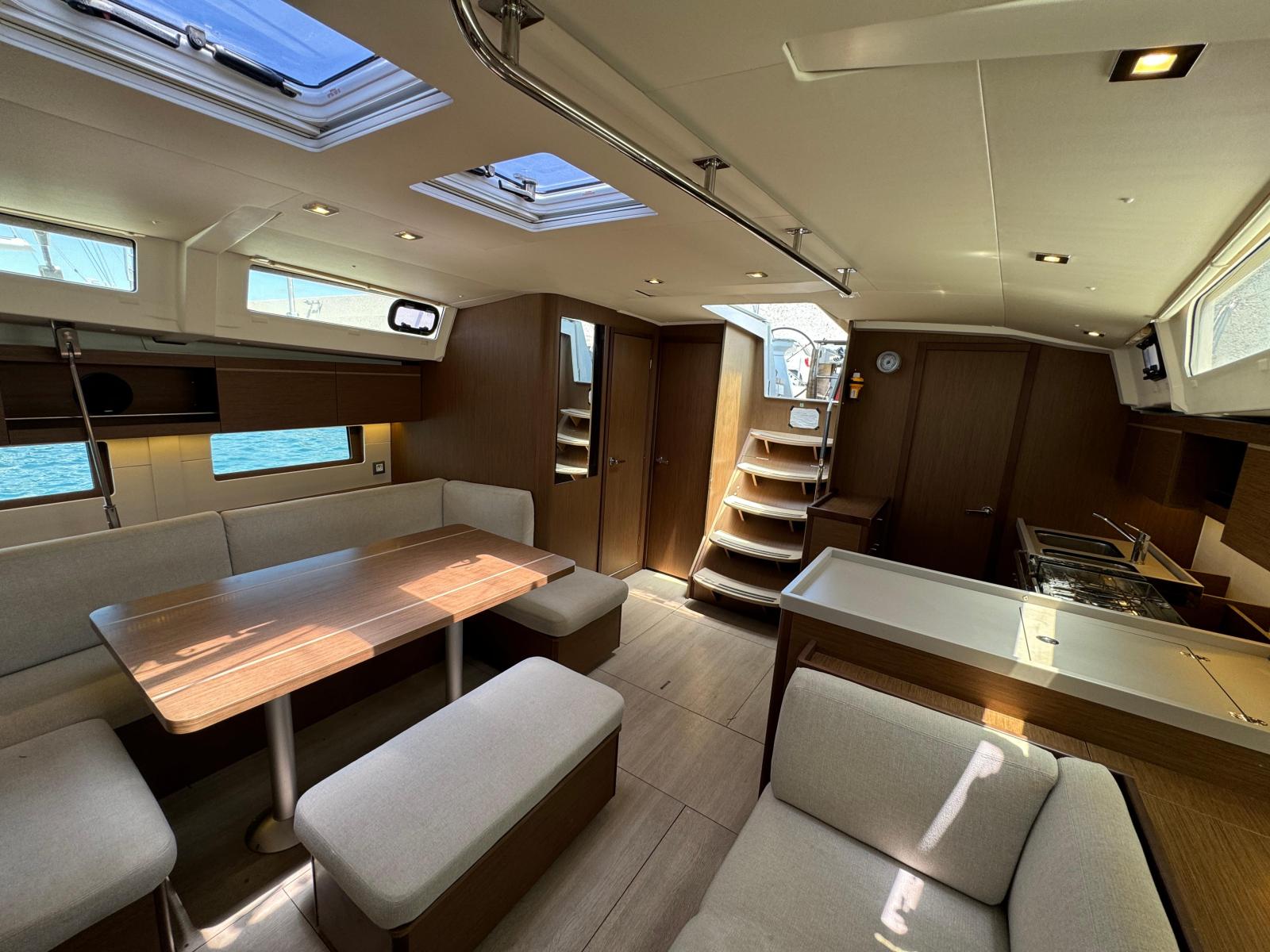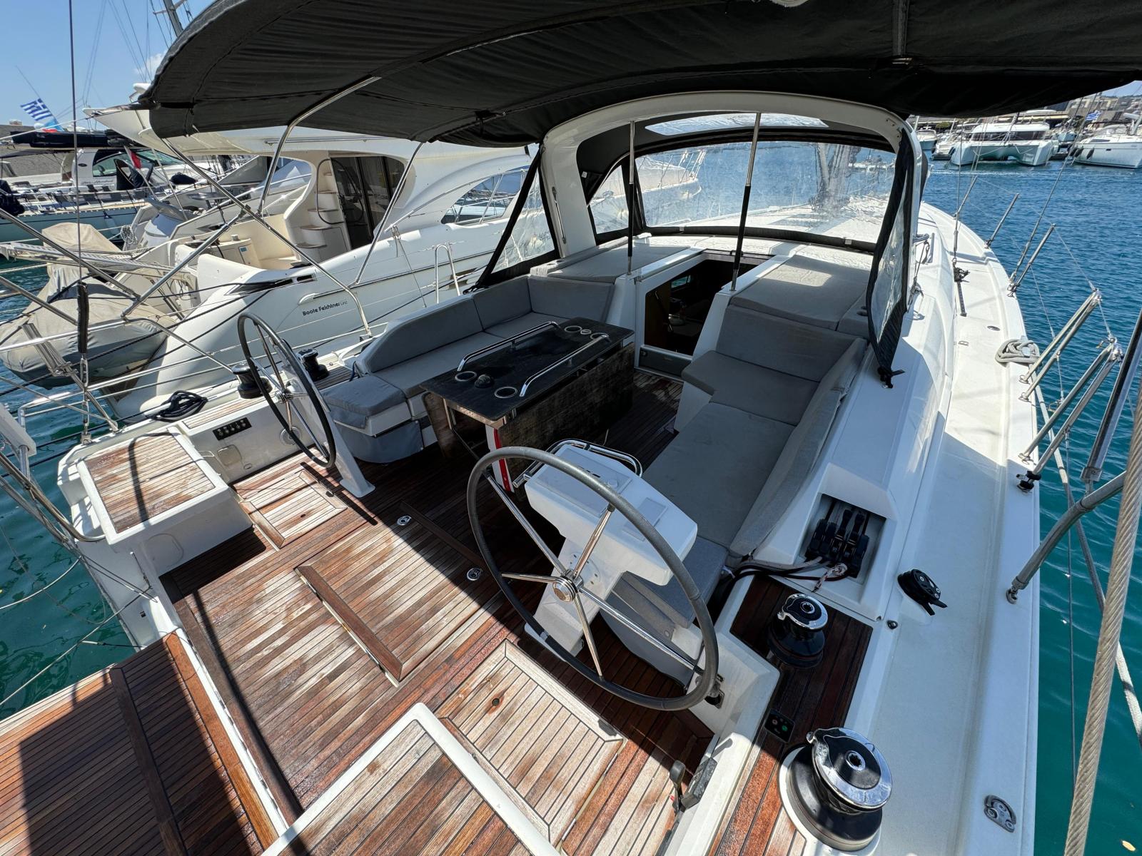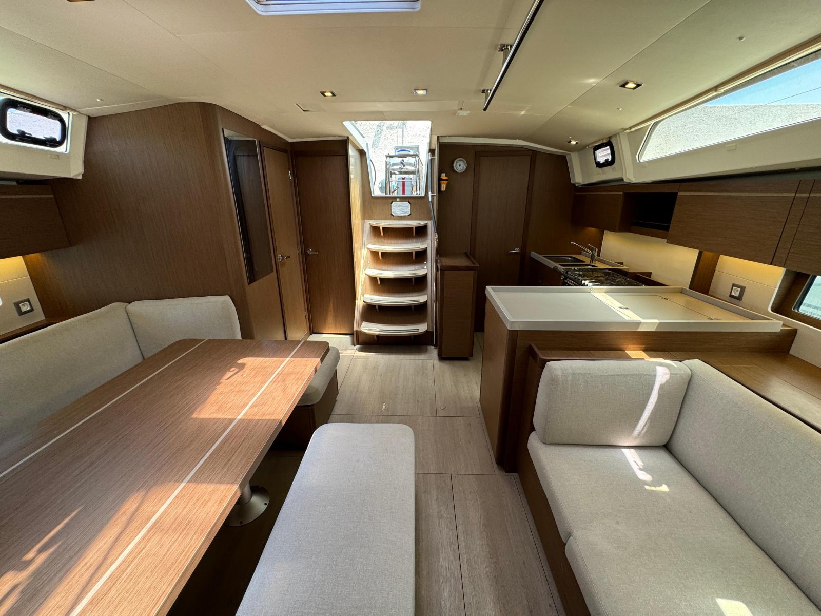 Description fournie par le constructeurThe Oceanis 46 boasts all the features of a large cruising yacht, with a rare balance between elegance, usable space and performance. Her stepped hull opens up an incredible amount of space inside and yet her seakeeping performance is still impressive. A large number of clever customizable fittings make her easy to sail and pleasantly comfortable. The Oceanis 46.1 is based on a Finot-Conq plan, keeping the distinctive stepped hull of the 51.1. Apart from her performance at sea and the huge amount of space that set this boat apart, this architecture makes optimal use of the cockpit beam. An incredibly efficient deck plan makes her wonderfully safe and easy to use. The furling mast, self-tailing jib and all the halyards and sheets brought back to a single winch at each of the helm stations, make manoeuvring simple when short-handed sailing.