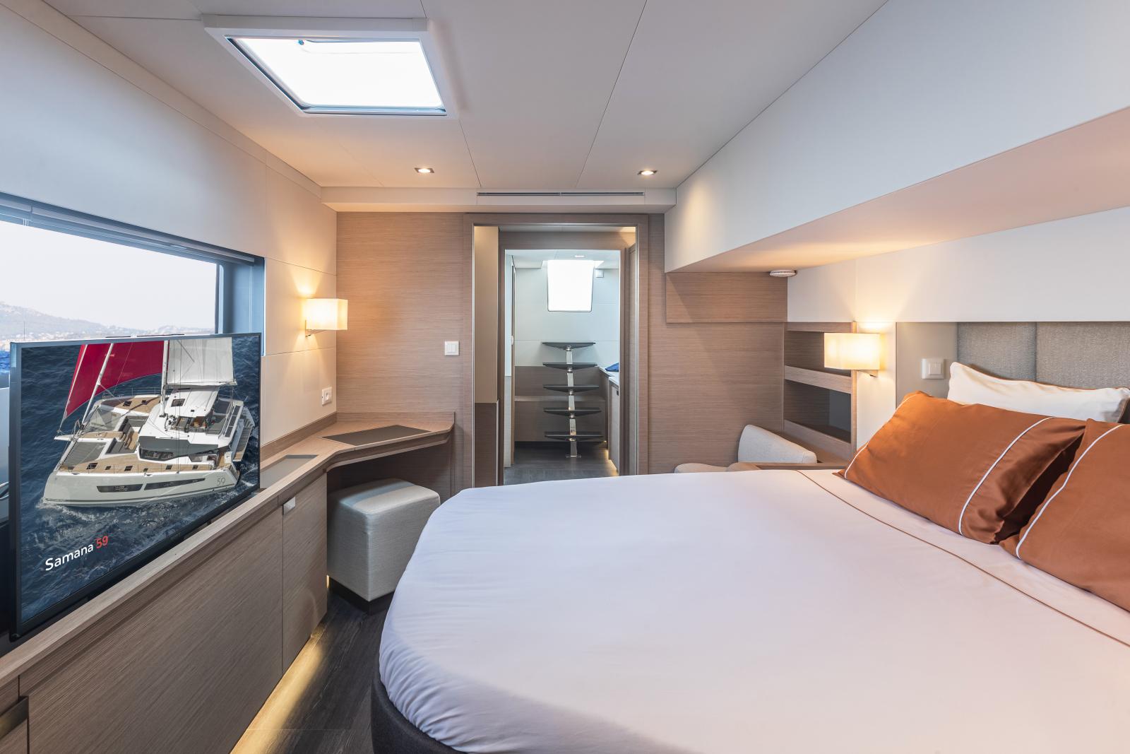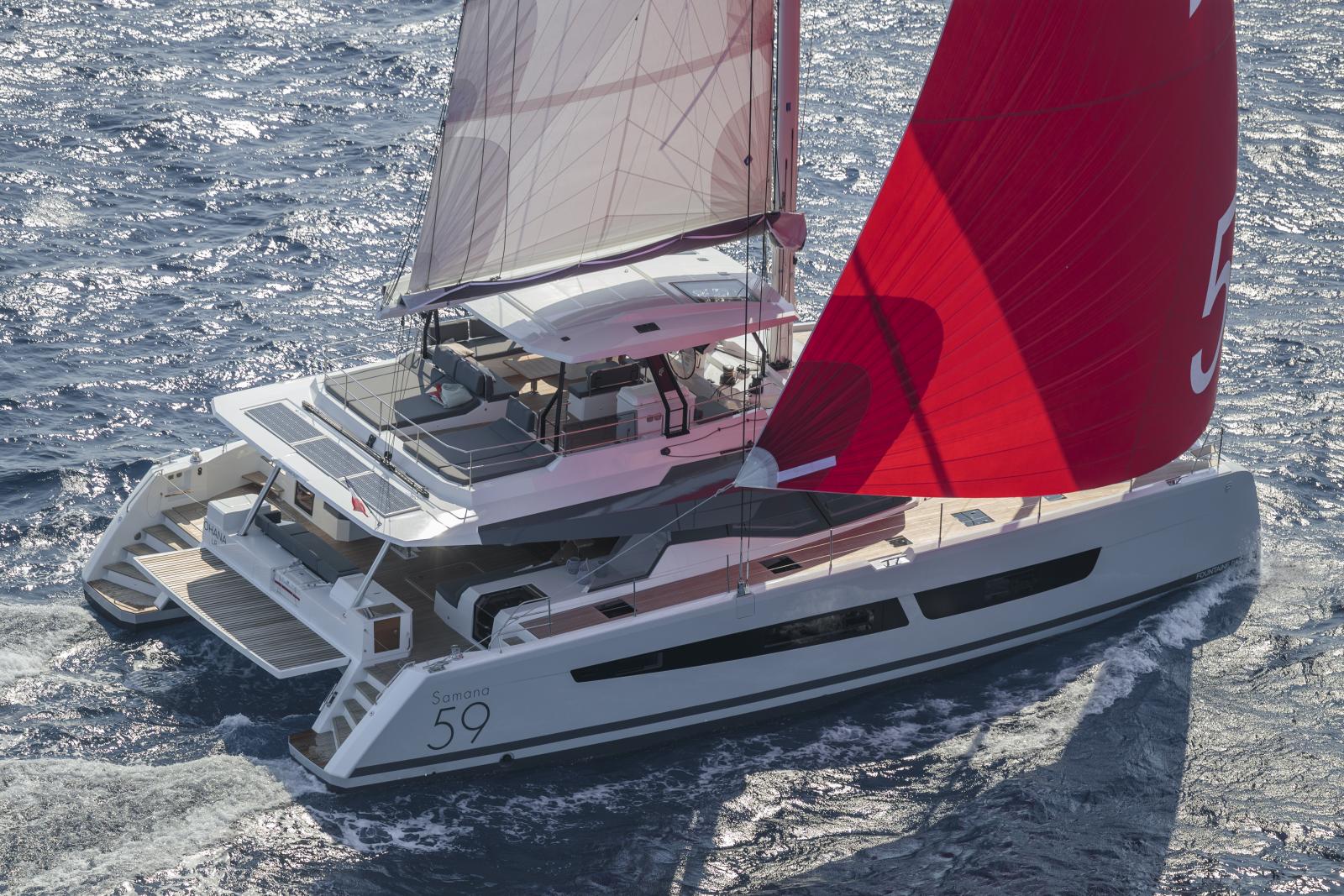 Possédant le plus grand flybridge dans sa catégorie, le SAMANA 59 est avant tout un voilier de propriétaires, qui veulent étonner leurs invités. Avec sa longueur de 18,78m, le SAMANA 59 est un catamaran qui offre une vraie liberté, tant dans le dessin des espaces que dans leur aménagement. Les espaces de réception ont été particulièrement bien dotés, partant du principe que ses propriétaires seront ravis d’y accueillir famille, amis ou encore compagnons de route rencontrés au mouillage. Sa versatilité au niveau des coques, allant de 4 à 6 cabines, ou encore son incroyable flybridge, véritable terrasse sur l’eau, en font un bateau très plaisant à vivre au quotidien. Que ce soit au mouillage ou sur une traversée océanique, ou plus encore.