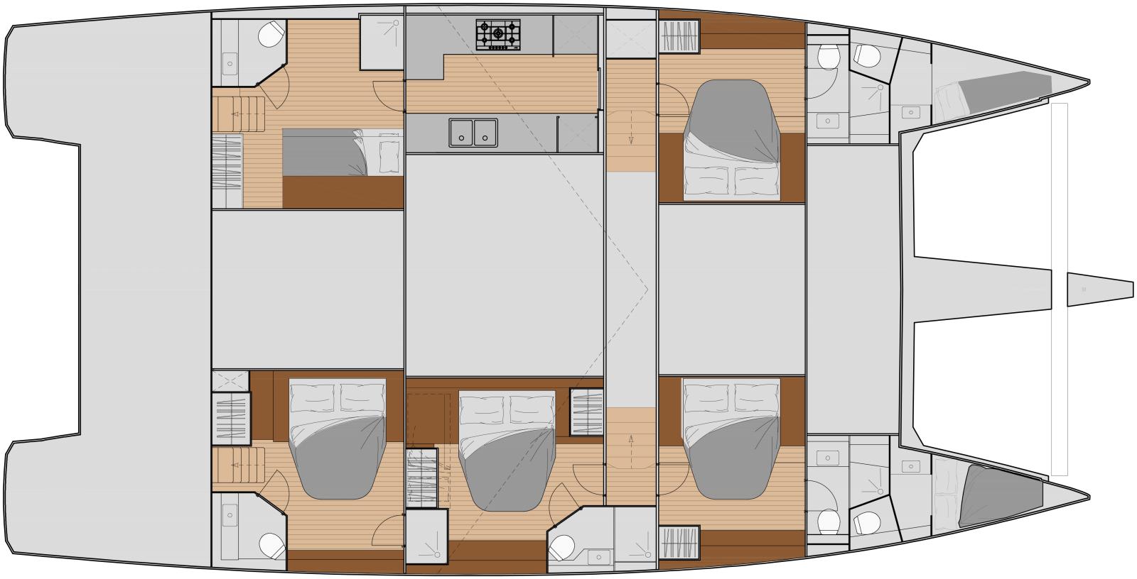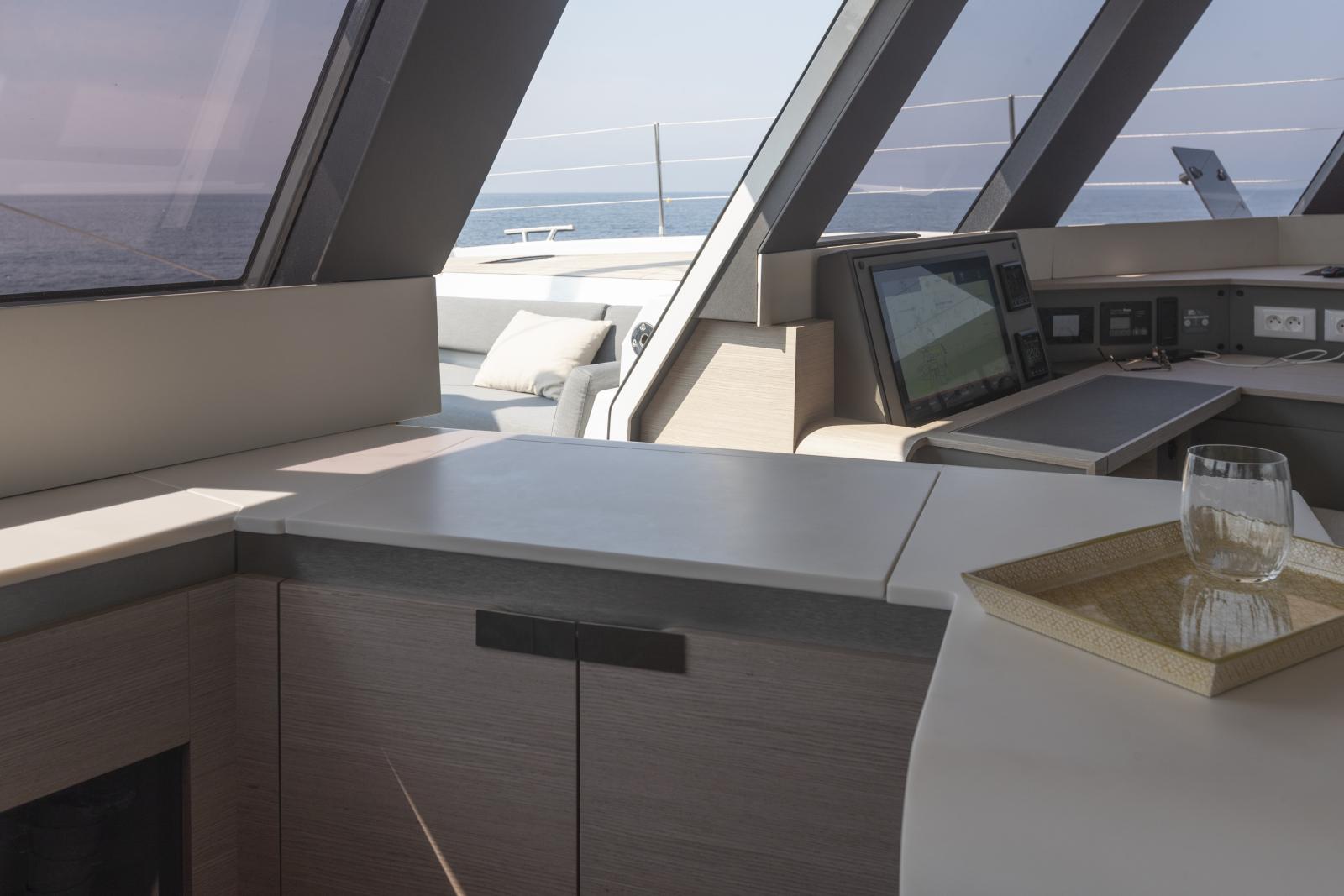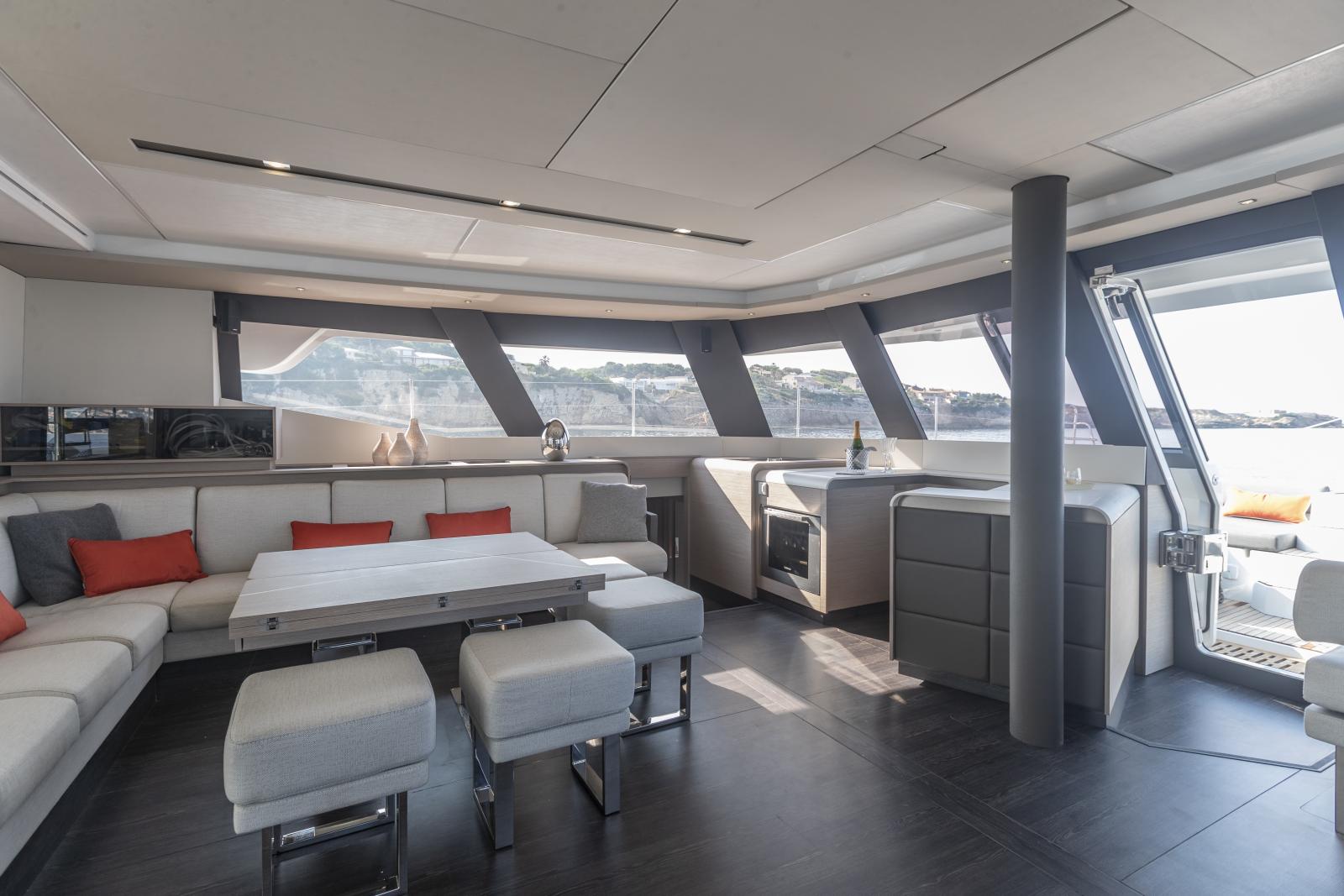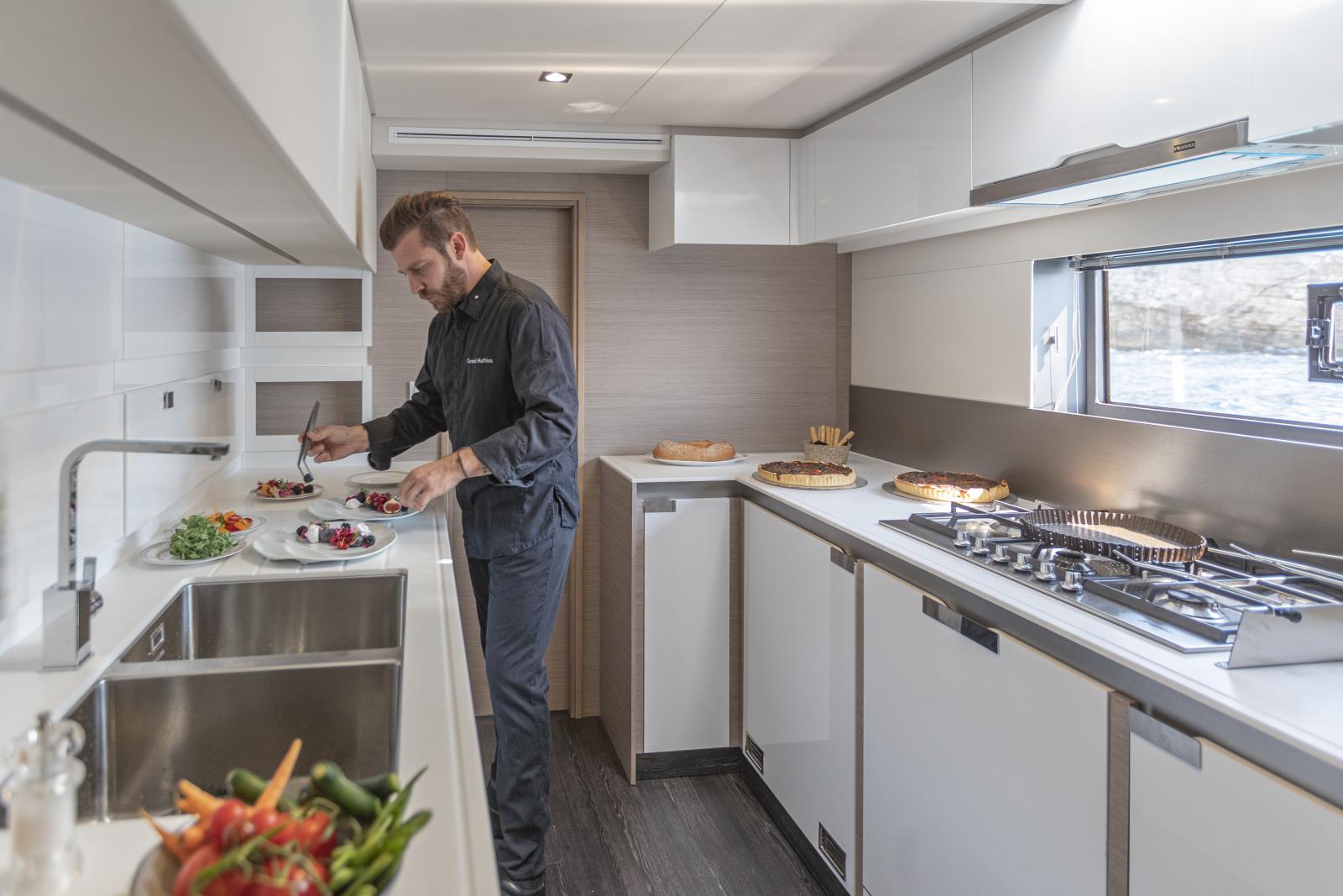 Fidèle à sa vocation d’hospitalité, ce catamaran de luxe propose deux emplacements de cuisine : une version classique formant un point de rencontre autour d’un îlot central, et une version escamotée dans la coque bâbord, à proximité des cabines de l’équipage, avec un accès direct dans le carré destiné au service.