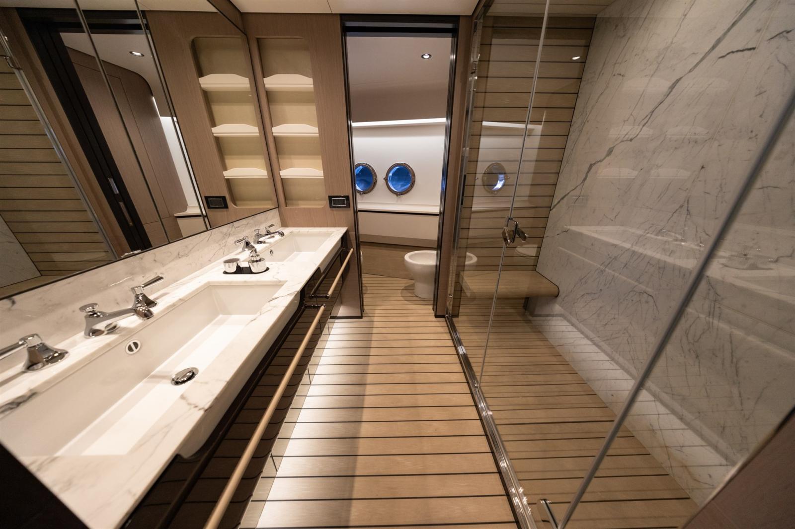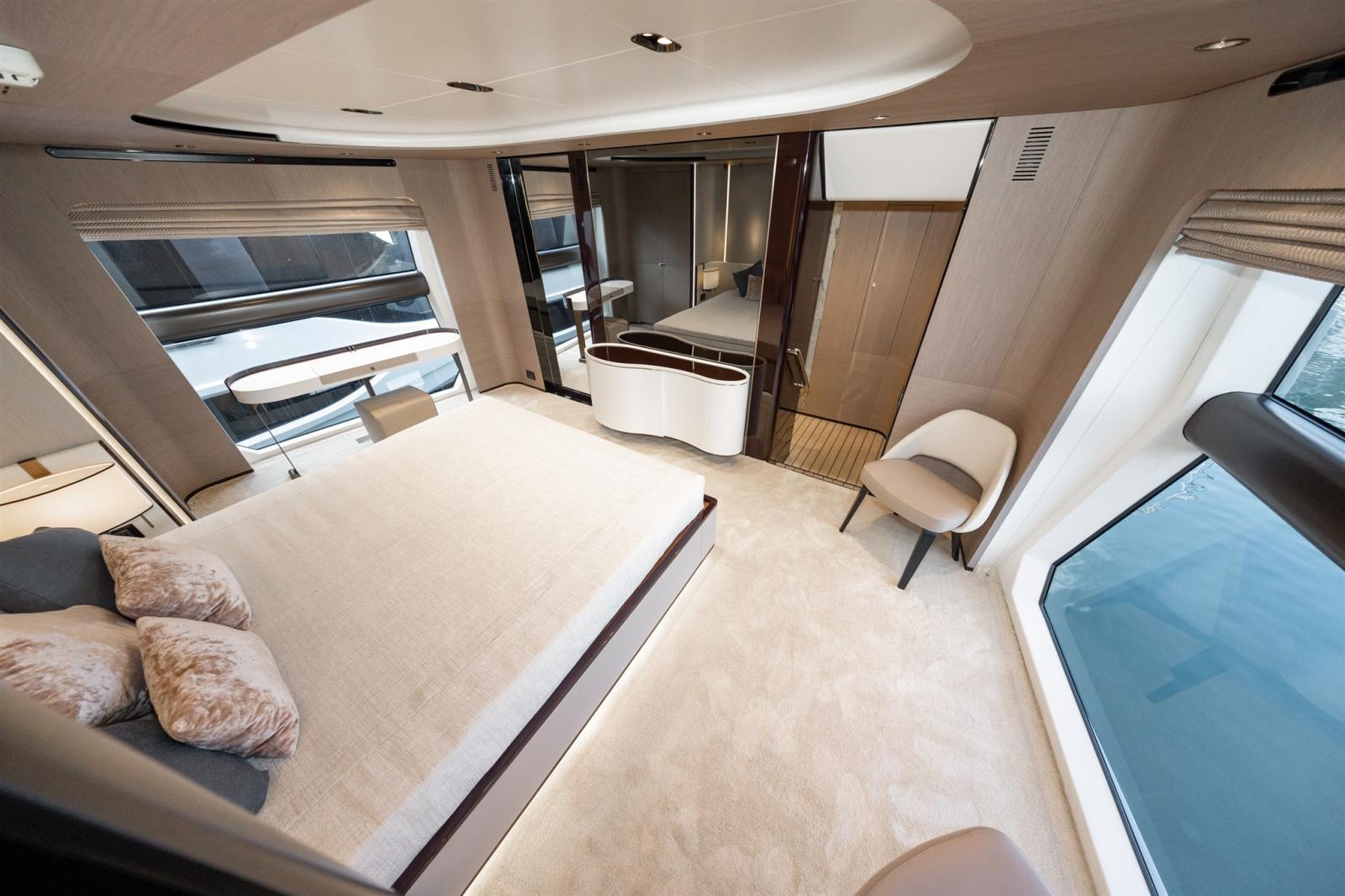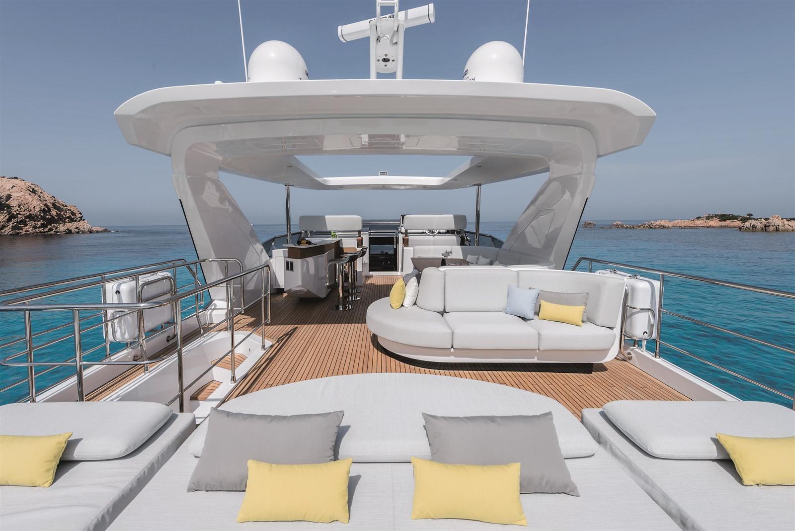 Conçue par Stefano Righini, la Grande 27M est dotée d’une superstructure en fibre de carbone, assurant une conduite légère et ultra-stable. Le spacieux flybridge, le club de plage et le salon du pont avant offrent un cadre idéal pour la détente et le divertissement, tandis que la généreuse suite principale sur le pont principal offre une retraite privée avec des finitions opulentes.