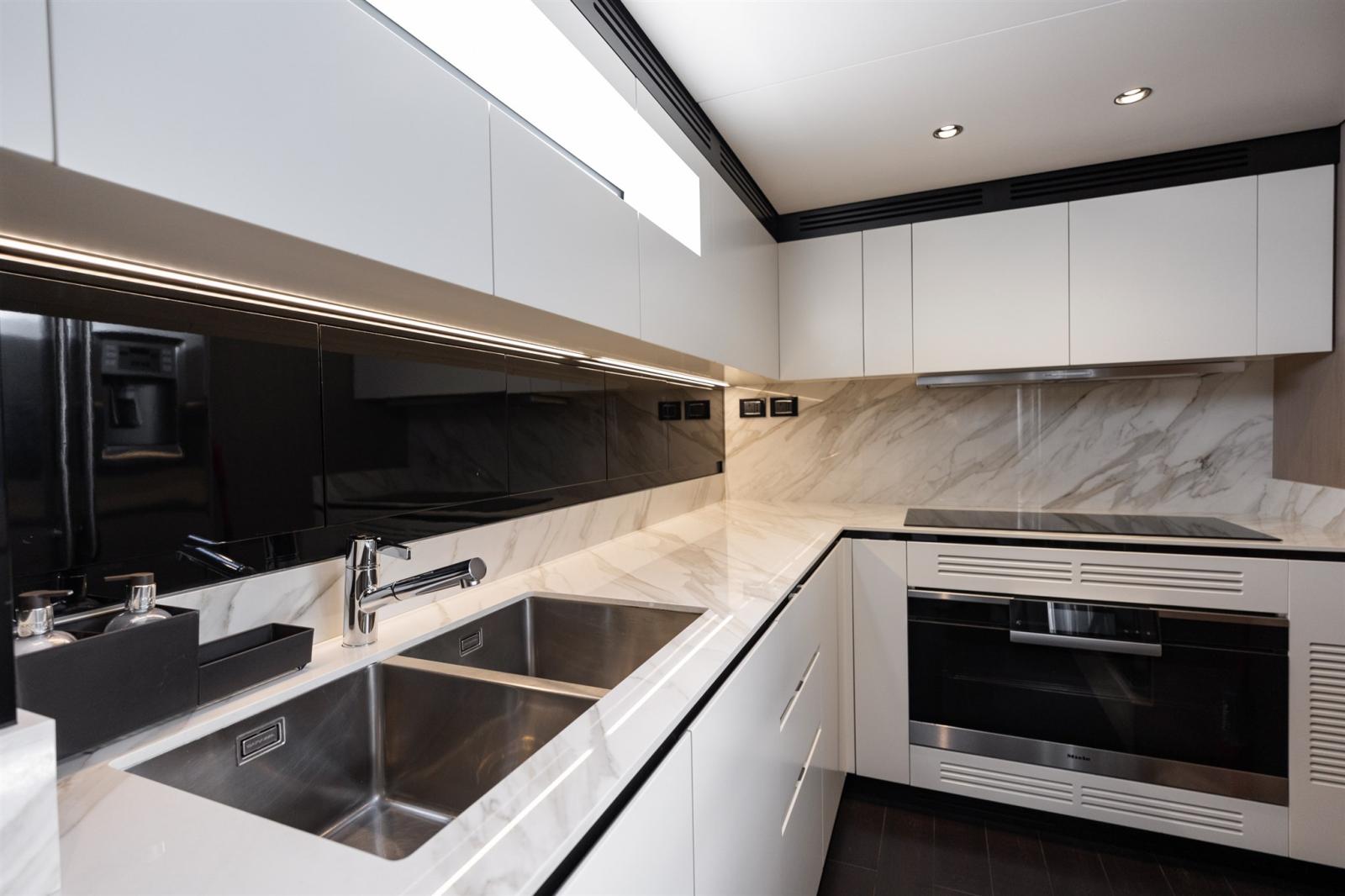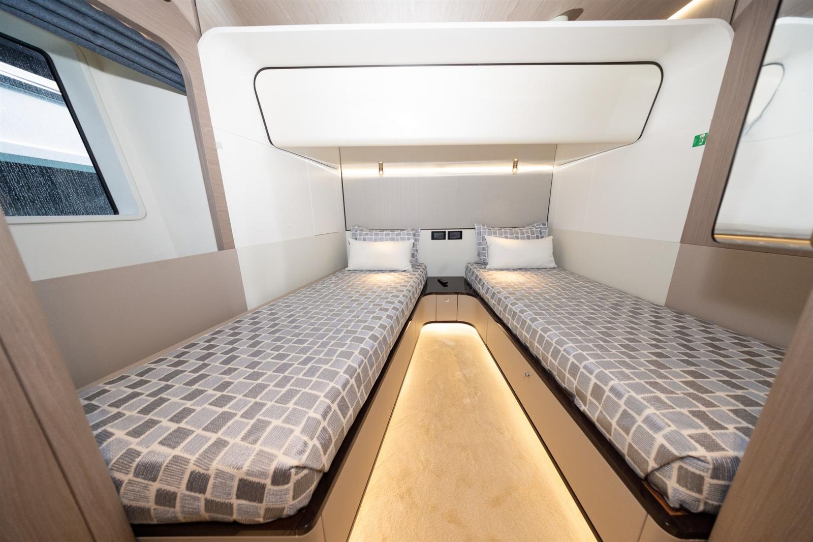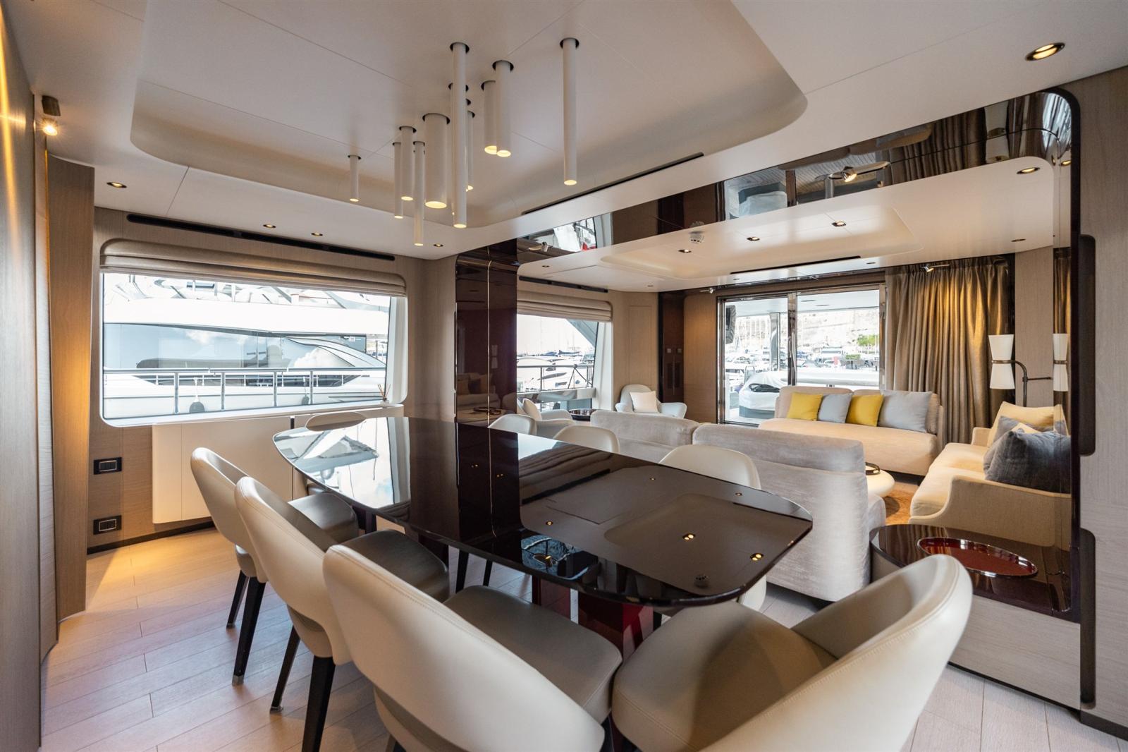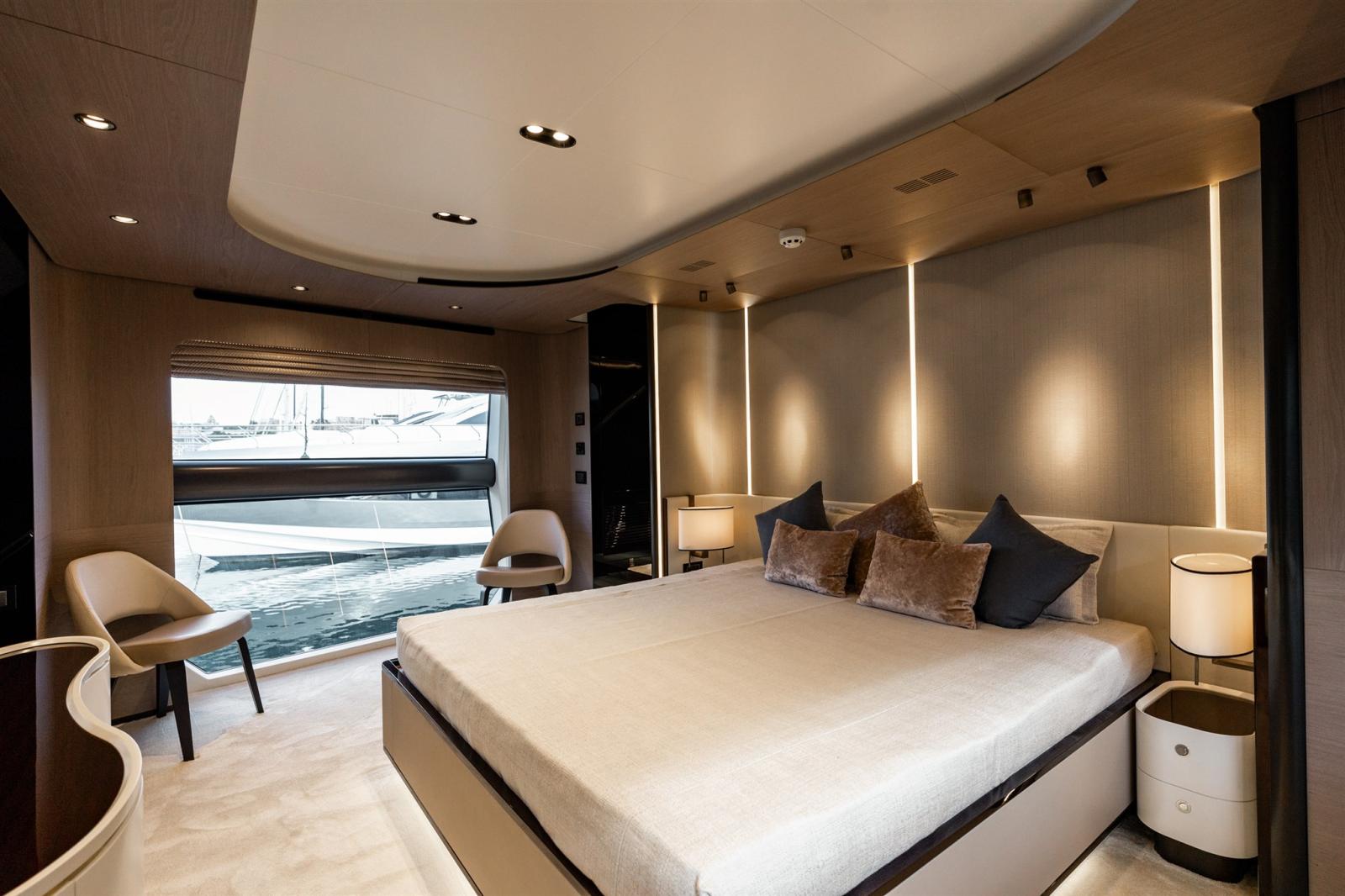 Conçue par Stefano Righini, la Grande 27M est dotée d’une superstructure en fibre de carbone, assurant une conduite légère et ultra-stable. Le spacieux flybridge, le club de plage et le salon du pont avant offrent un cadre idéal pour la détente et le divertissement, tandis que la généreuse suite principale sur le pont principal offre une retraite privée avec des finitions opulentes.