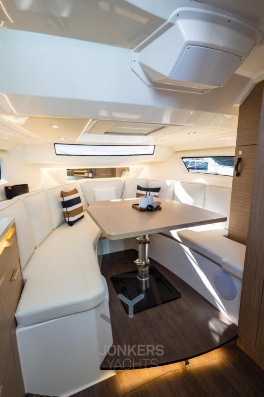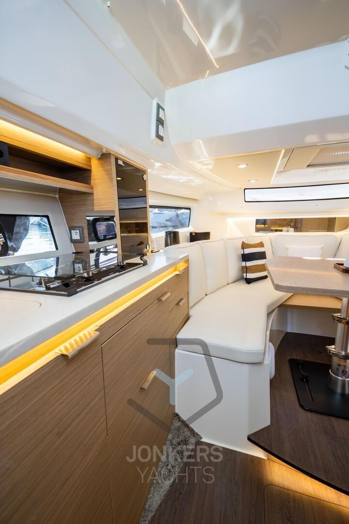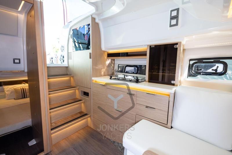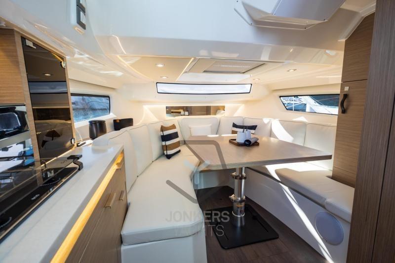 Le Cap Camarat 10.5 WA vous invite à prolonger vos escales sur l’eau dans le plus grand confort. Parfaitement intégré dans le profil du bateau, le T-top en option vous permet, avec l’ajout d’un taud de soleil à l’arrière, de dîner à l’ombre. La cuisine extérieure, adossée aux sièges du poste de barre, comprend un frigo, un grill électrique, un brûleur à gaz, des rangements, ou encore un vivier pour retenir la prise du jour. En bas, équipé en option de la climatisation, l’intérieur spacieux et confortable dispose également d’une deuxième cabine séparée à l’arrière. À l’avant, le coin petit-déjeuner traditionnel se transforme en couchette en V avec rideau de séparation. Ce bateau de jour a tout pour vous donner un avant-goût de la croisière et des nuits en mer.
