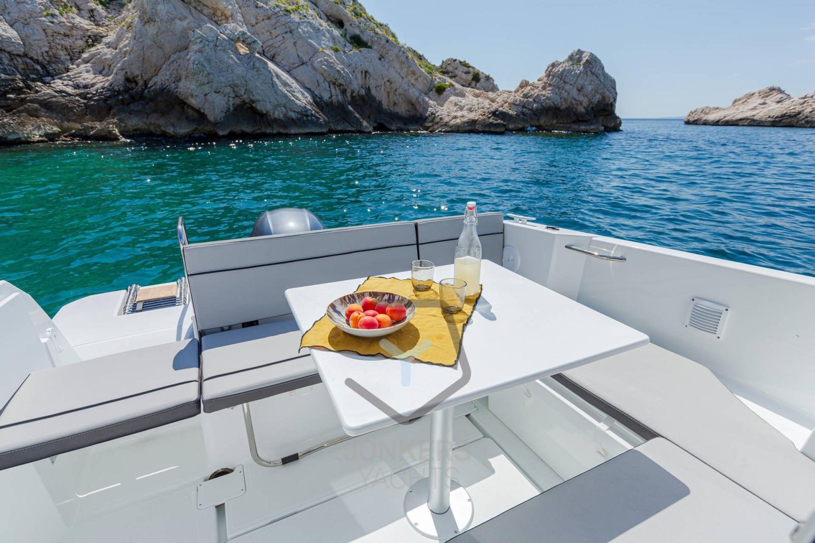 Profitez de moments de partage en famille et entre amis dans son spacieux et accueillant salon de cockpit en U, qui se transforme en bain de soleil. La banquette coulissante optimise l’espace à bord pour un maximum de confort. Le généreux pont arrière plat permet un accès facile à l’eau.