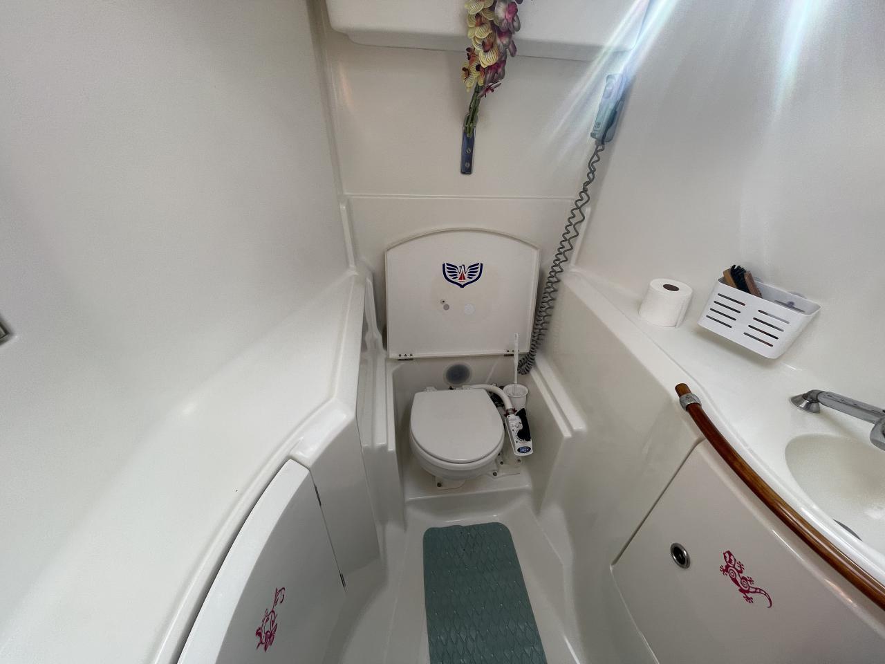 Une grande cabine double avant avec sa salle d’eau avec toilette et douche séparée