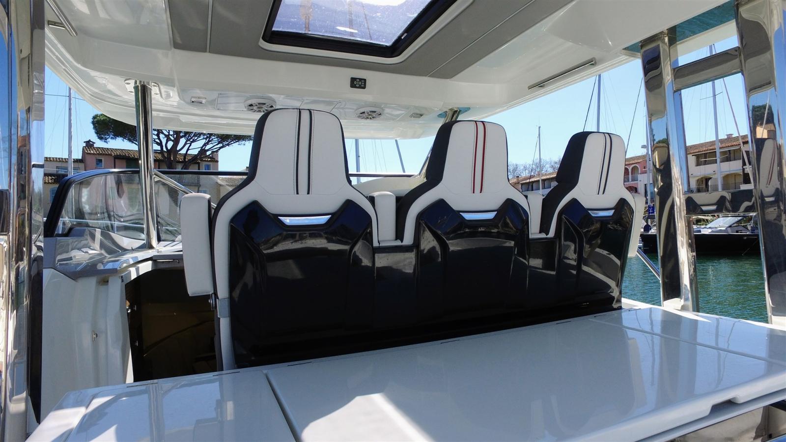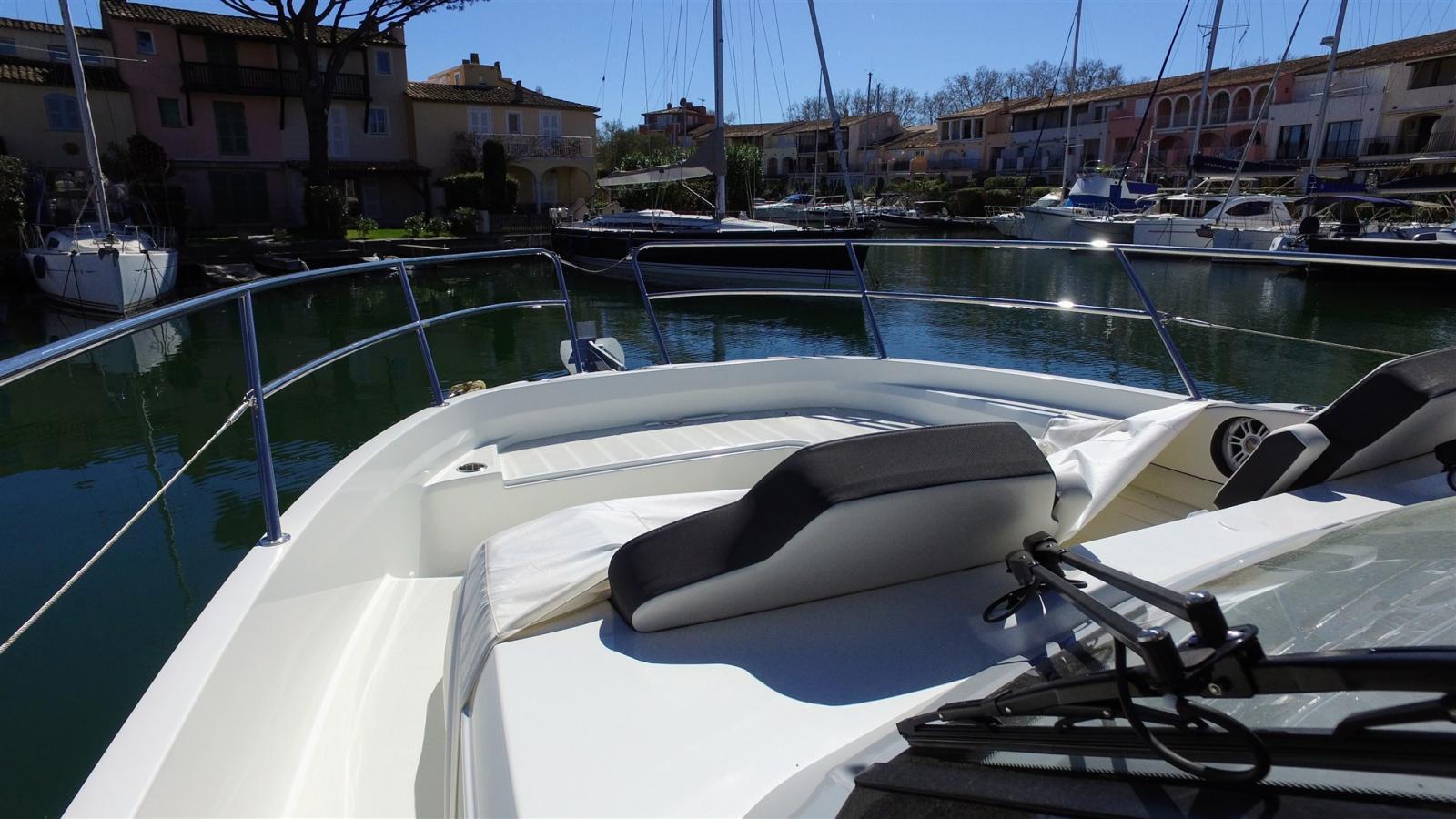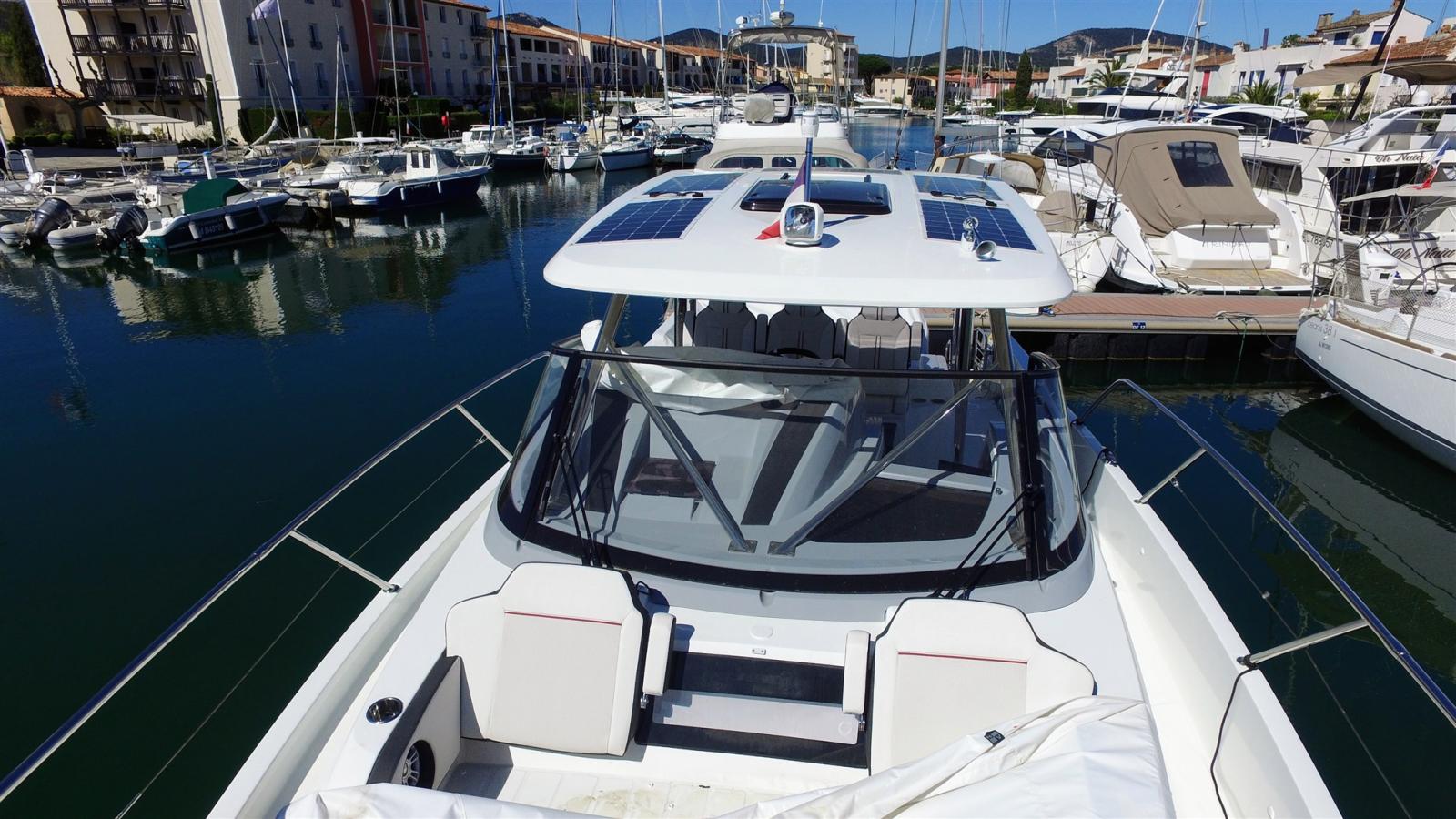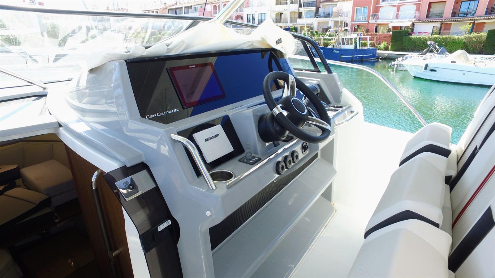 Alarme moteur, Ancre (16kg 28m de chaine de 10 et 40m de cablot - Ancre virtuelle), Eau sous pression, 4 Batteries (lithium), Douche de cockpit, Phares fixes arrière (et avant), Phare de poursuite, Flaps électriques (Lenco), Lavabo dans le cockpit, Éclairage de courtoisie (de cockpit et intérieur), Panneau solaire, Plateforme arrière (et latérale amovible), Pompe de cale automatique, Prise de quai, Connexion eau sous pression à quai, Guindeau électrique, Echelle de bain, table de cockpit (avec bain de soleil et table avant), T-Top (rigide avec parbrise bas).