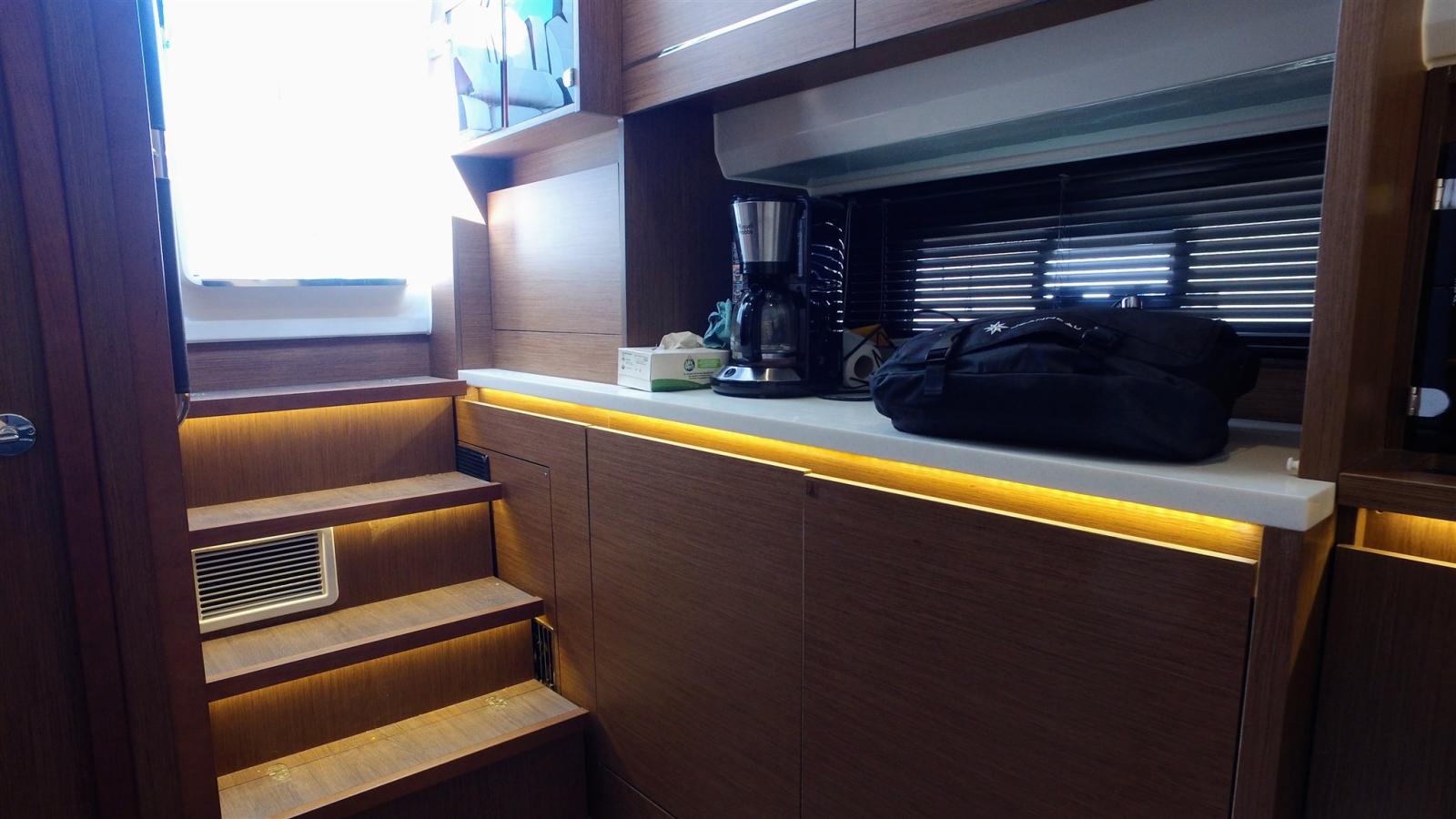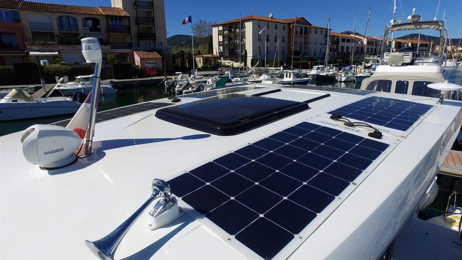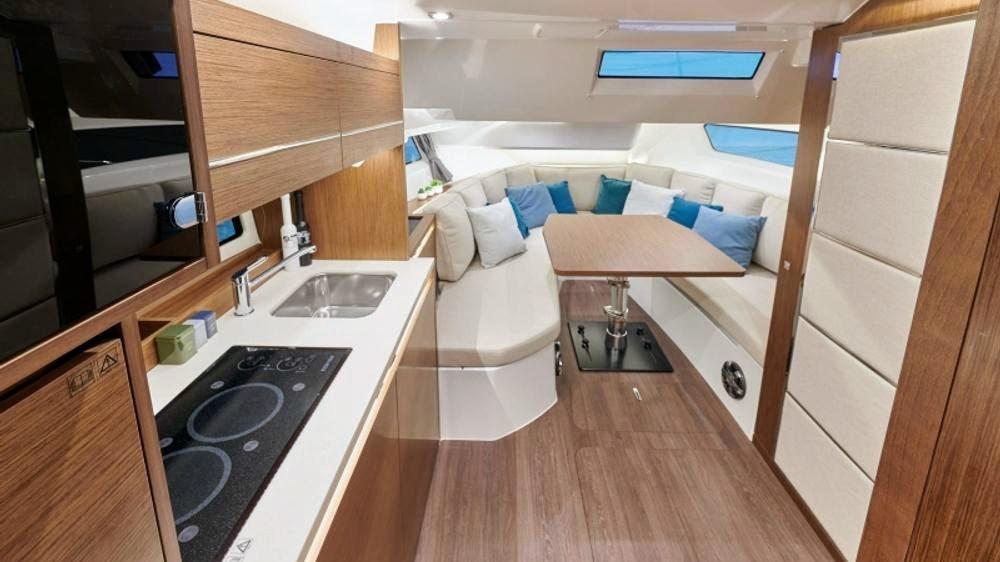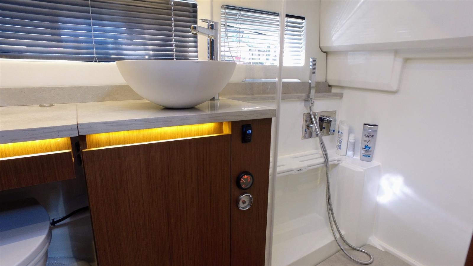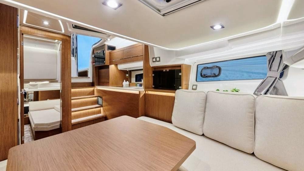 Alarme moteur, Ancre (16kg 28m de chaine de 10 et 40m de cablot - Ancre virtuelle), Eau sous pression, 4 Batteries (lithium), Douche de cockpit, Phares fixes arrière (et avant), Phare de poursuite, Flaps électriques (Lenco), Lavabo dans le cockpit, Éclairage de courtoisie (de cockpit et intérieur), Panneau solaire, Plateforme arrière (et latérale amovible), Pompe de cale automatique, Prise de quai, Connexion eau sous pression à quai, Guindeau électrique, Echelle de bain, table de cockpit (avec bain de soleil et table avant), T-Top (rigide avec parbrise bas).