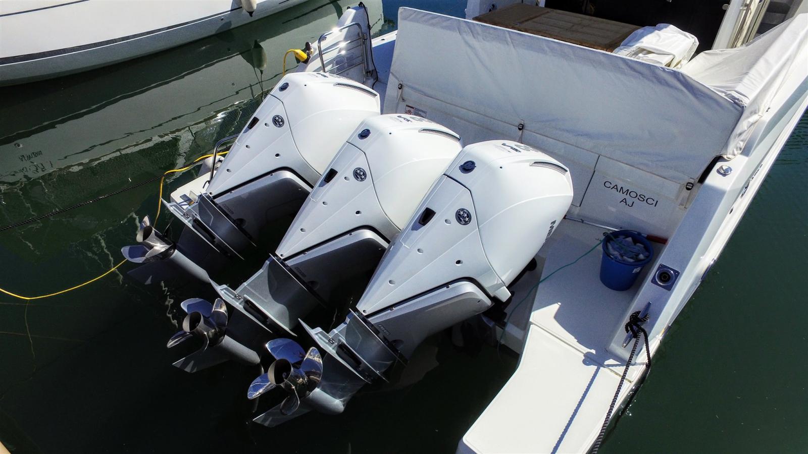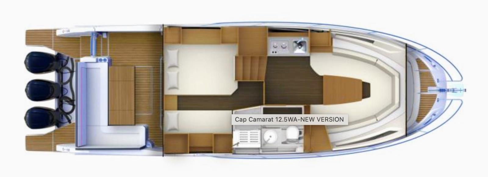 Jeanneau Cap Camarat 12.5 WA – 2023 –: grand Walk Around de 11,95 m en excellent état, motorisé 3 x 300 CV Mercury Verado V8 avec seulement 80 h. Élégant, performant et polyvalent, il accueille jusqu’à 12 personnes. Coque planante robuste, tiroir d’eau 0,82 m, réservoir 1 150 L carburant / 200 L eau. Équipé joystick, pilote auto, plotter GPS Simrad Go12, sonar, VHF, autopropulseur, T‑Top rigide, bain de soleil, plateforme et douche de pont. Confort complet avec air conditionné, WC électrique, cuisine, batteries lithium, panneaux solaires et système audio. Idéal day‑cruiser ou croisière côtière.