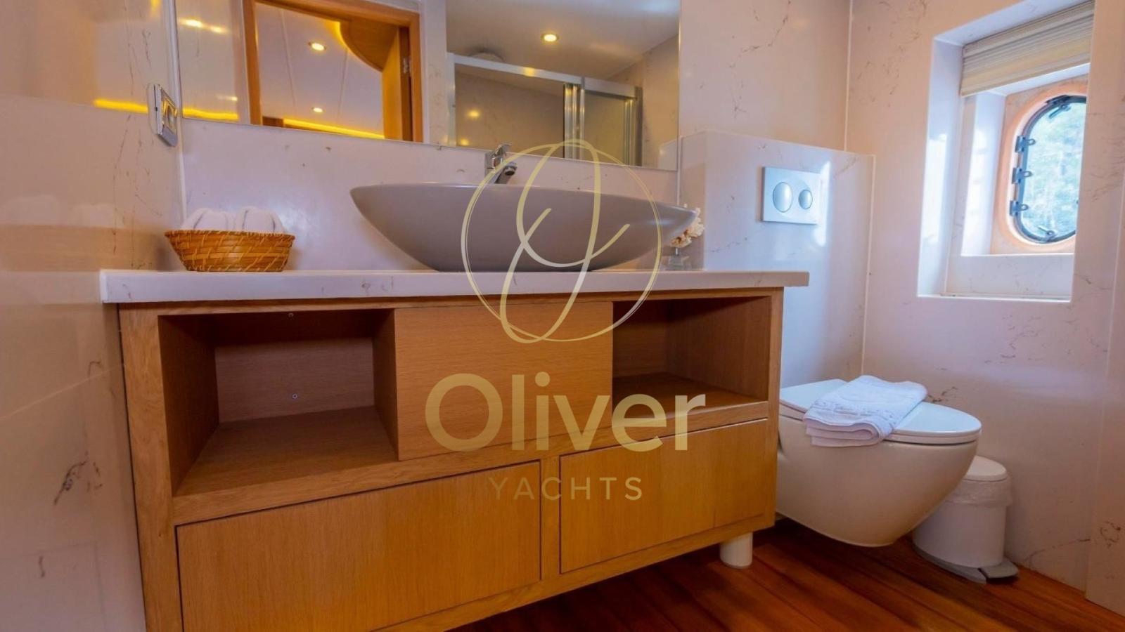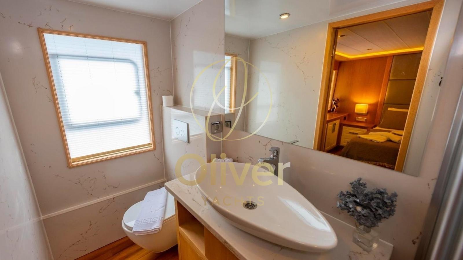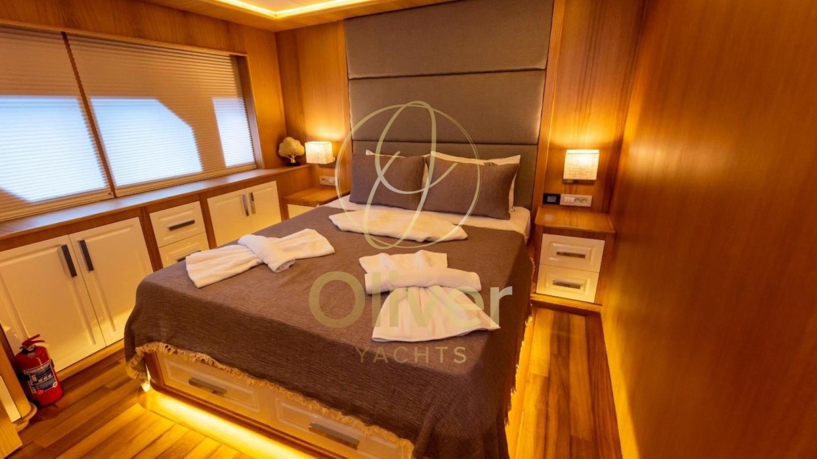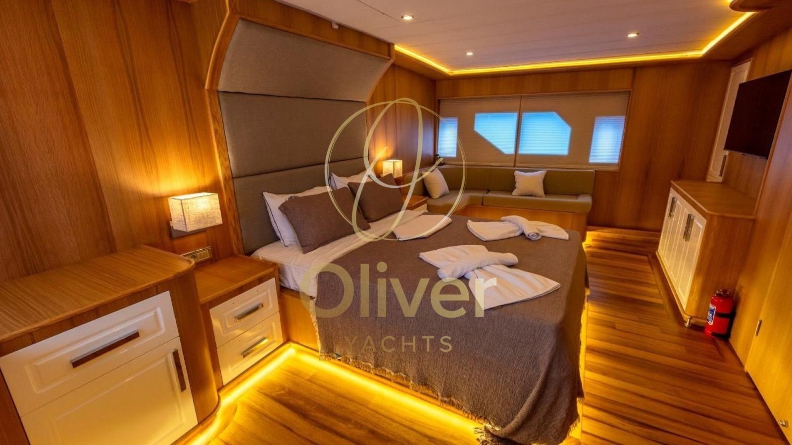Les cinq cabines luxueuses, dont 3 masters et 2 doubles, sont spacieuses et équipées de grandes fenêtres panoramiques qui remplissent les espaces de lumière naturelle, offrant une vue imprenable sur la mer. Chaque cabine est mise en valeur par un système d’éclairage LED doux, créant une atmosphère intime et relaxante. L’ameublement comprend des lits spacieux, des têtes de lit rembourrées et des canapés intégrés, parfaits pour des moments de détente. Les salles de bains privatives, au design contemporain, sont finies avec des surfaces en marbre et comprennent des cabines de douche confortables, des lavabos élégants et des détails de haute qualité.