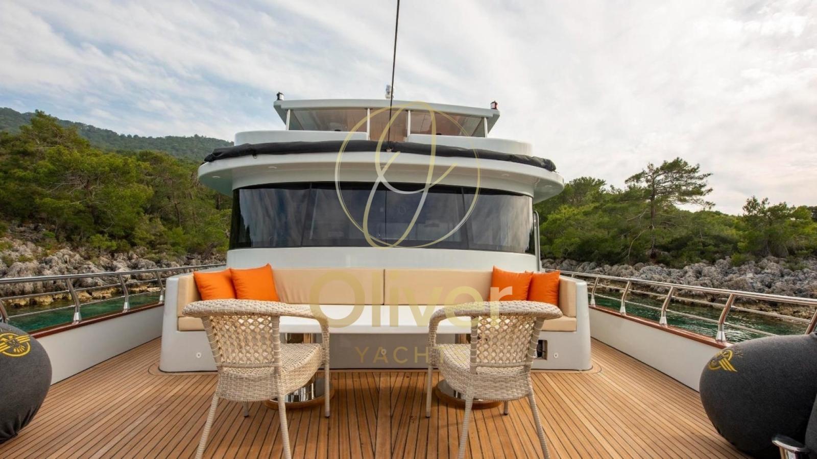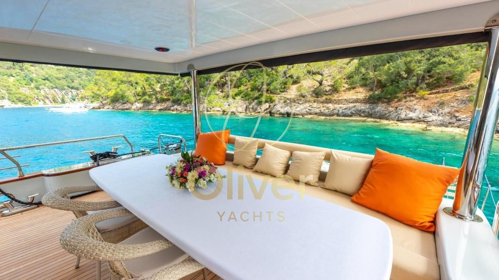 L’extérieur du yacht est tout aussi impressionnant. Le flybridge est équipé d’un bar américain, d’un coin salon et de chaises longues, offrant le cadre idéal pour se détendre au soleil ou prendre un verre au coucher du soleil. La plate-forme arrière, avec une passerelle hydraulique, permet un accès facile à la mer, idéal même pour les clients moins expérimentés. Parmi les activités disponibles, citons la planche à pagaie, le canoë, le ski nautique et les jouets nautiques tels que le ringo.