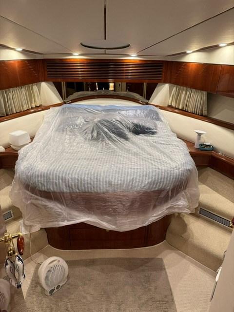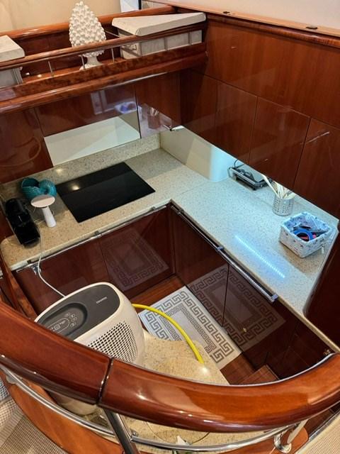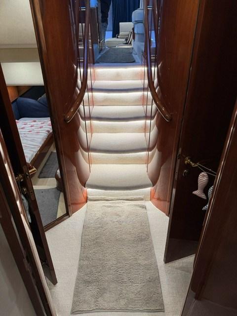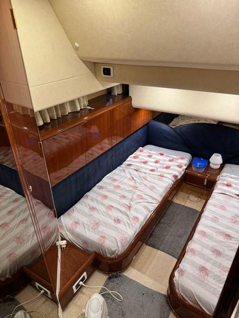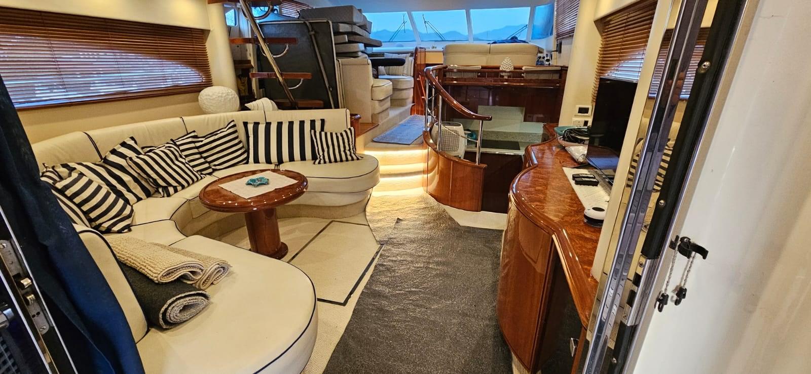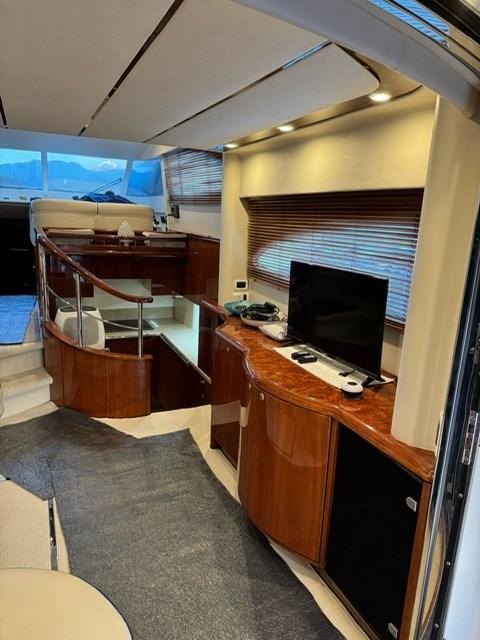 intérieurs en bois de cerisier, canapés en cuir, treuils d’amarrage à l’arrière, teck sur le flybridge, armoire à la volée avec plaque électrique, réfrigérateur et évier, minibar dans le salon, congélateur dans la cuisine.