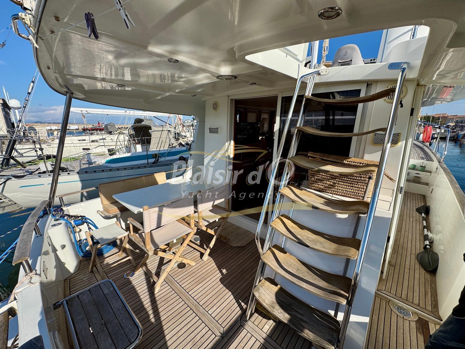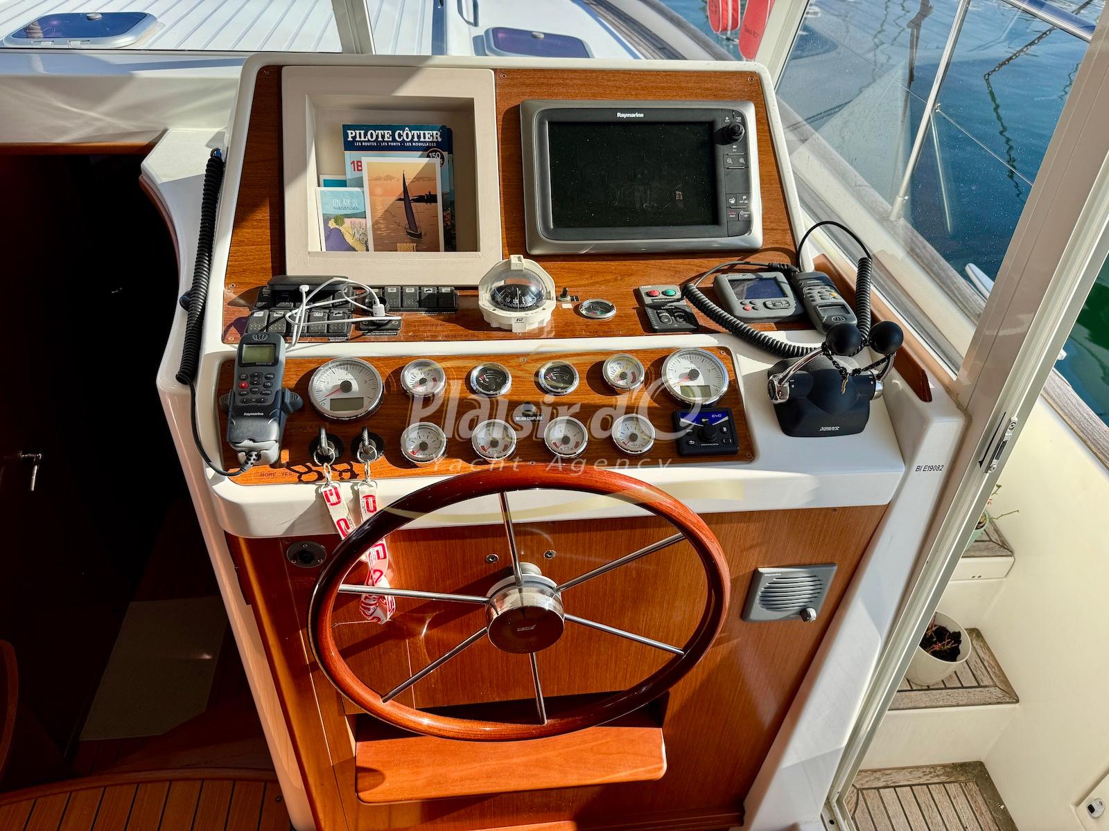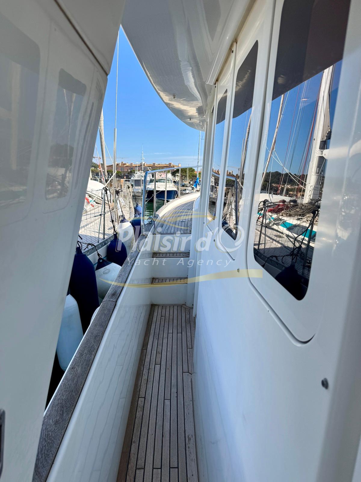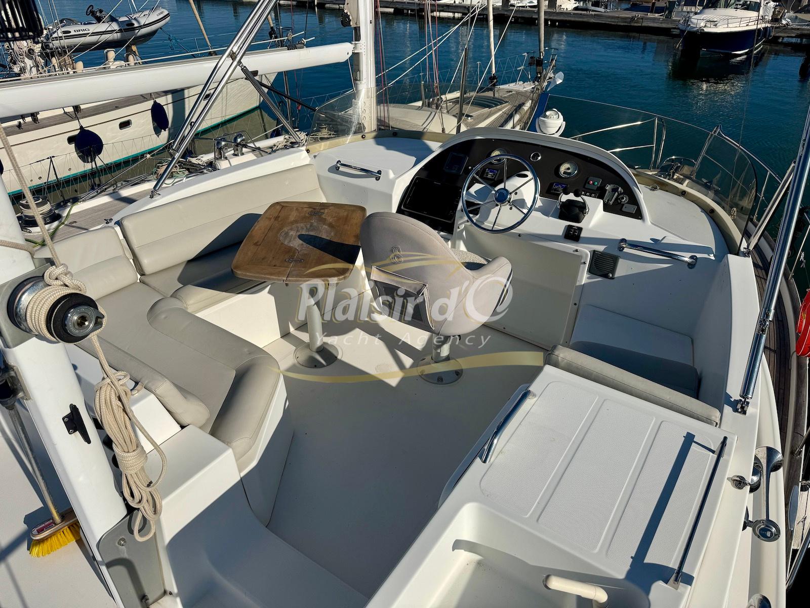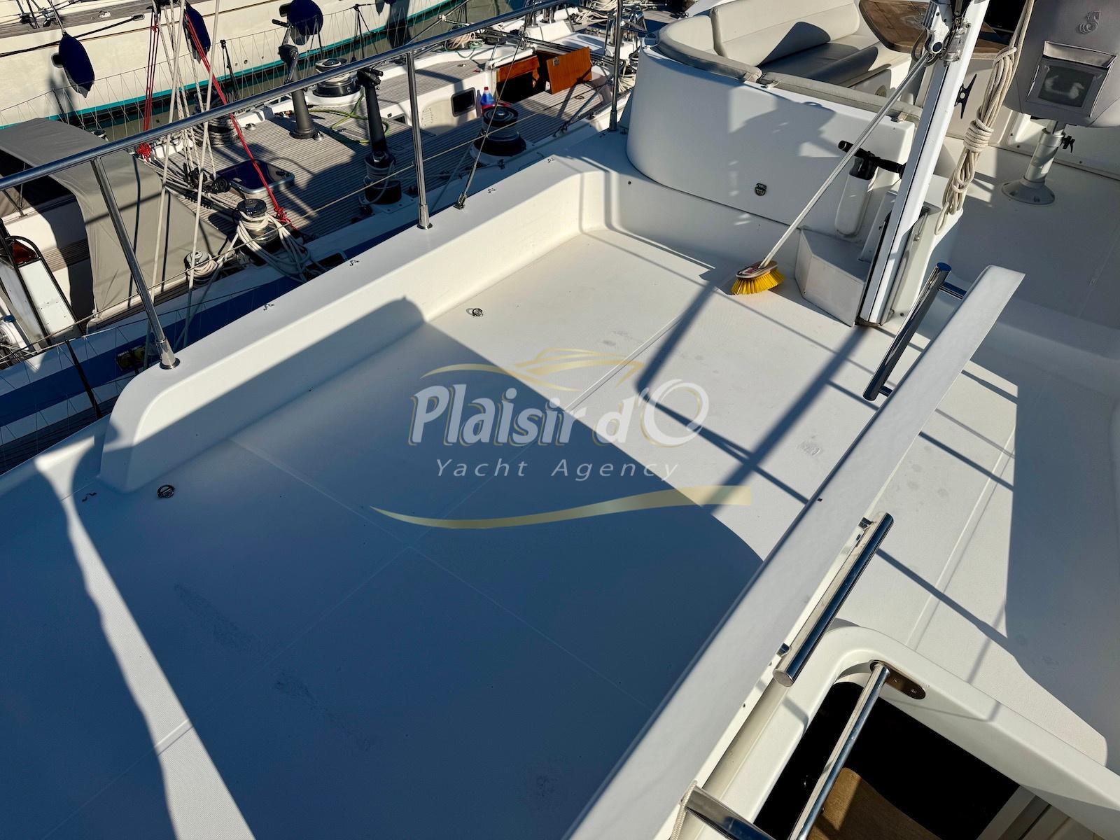 FULL OPTIONS : Climatisation réversible, générateur, passerelle hydraulique, pilote automatique, cockpit teck, GPS/sondeur Raymarine, propulseur d’étrave, VHF, TV, 2 réfrigérateurs, plateforme de bain allongée.