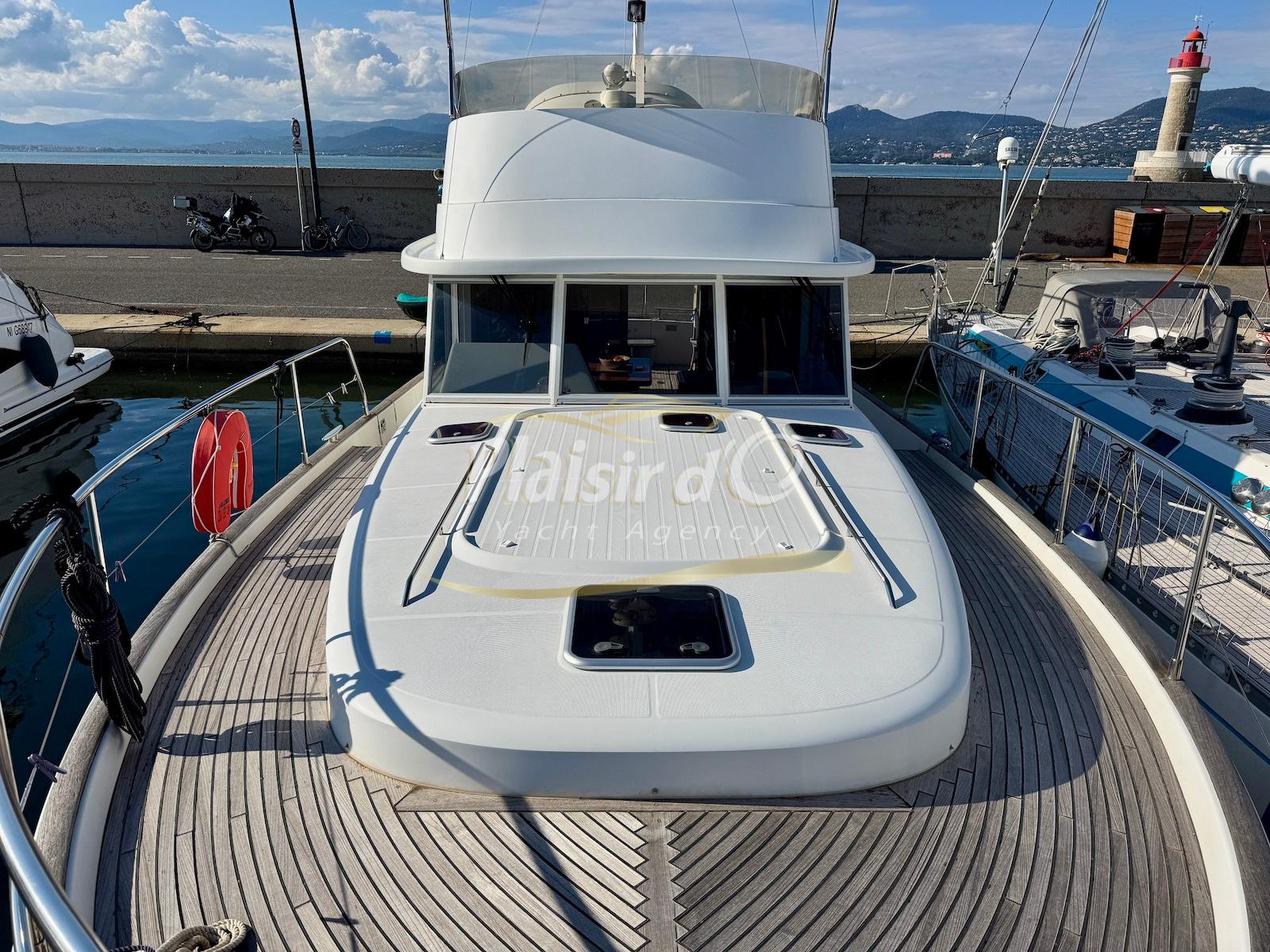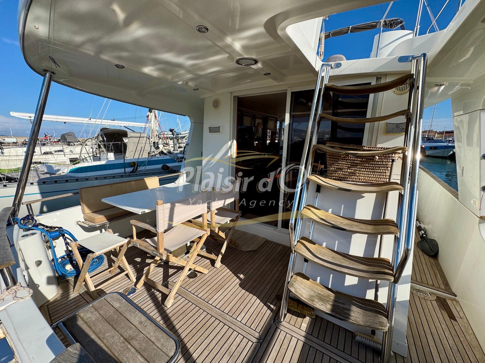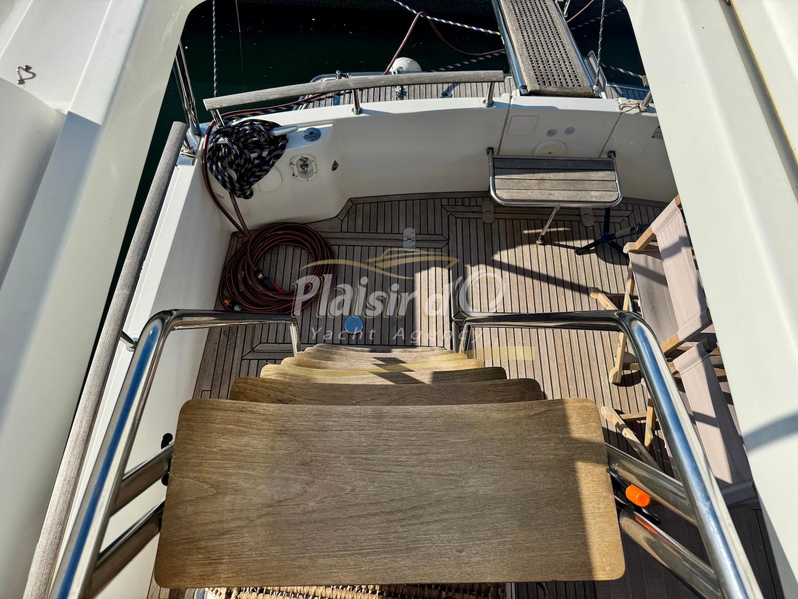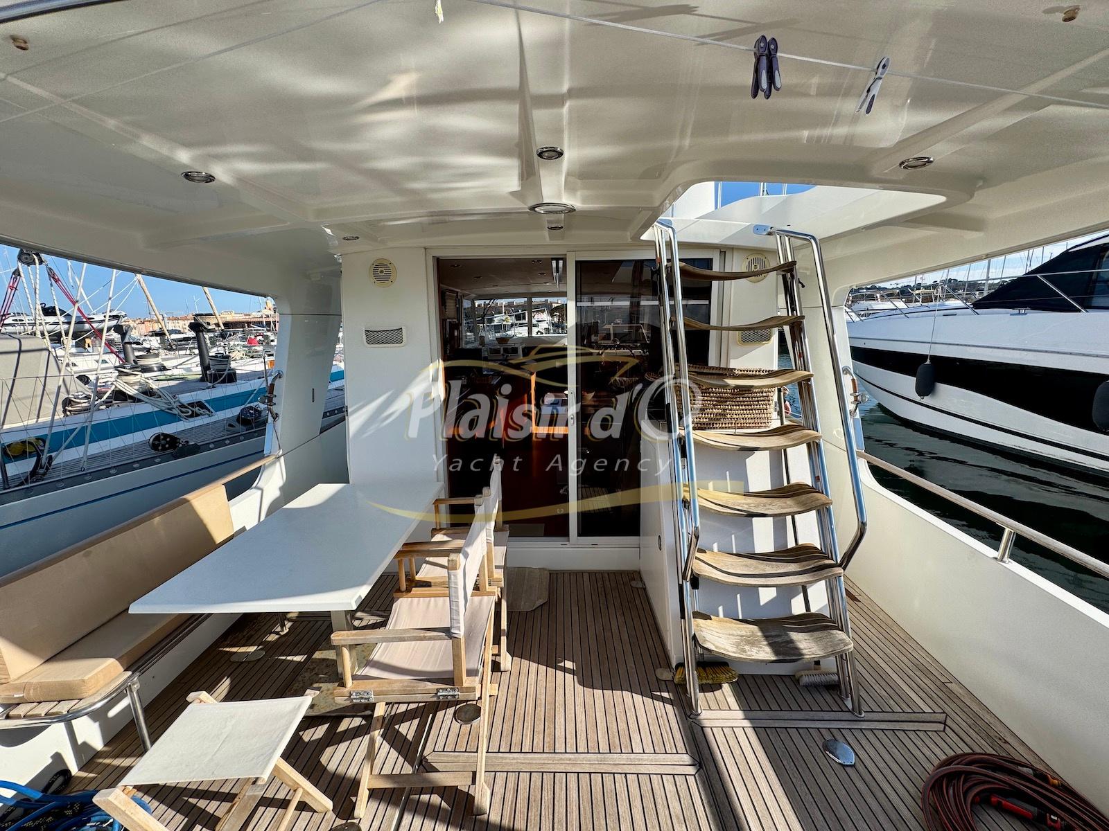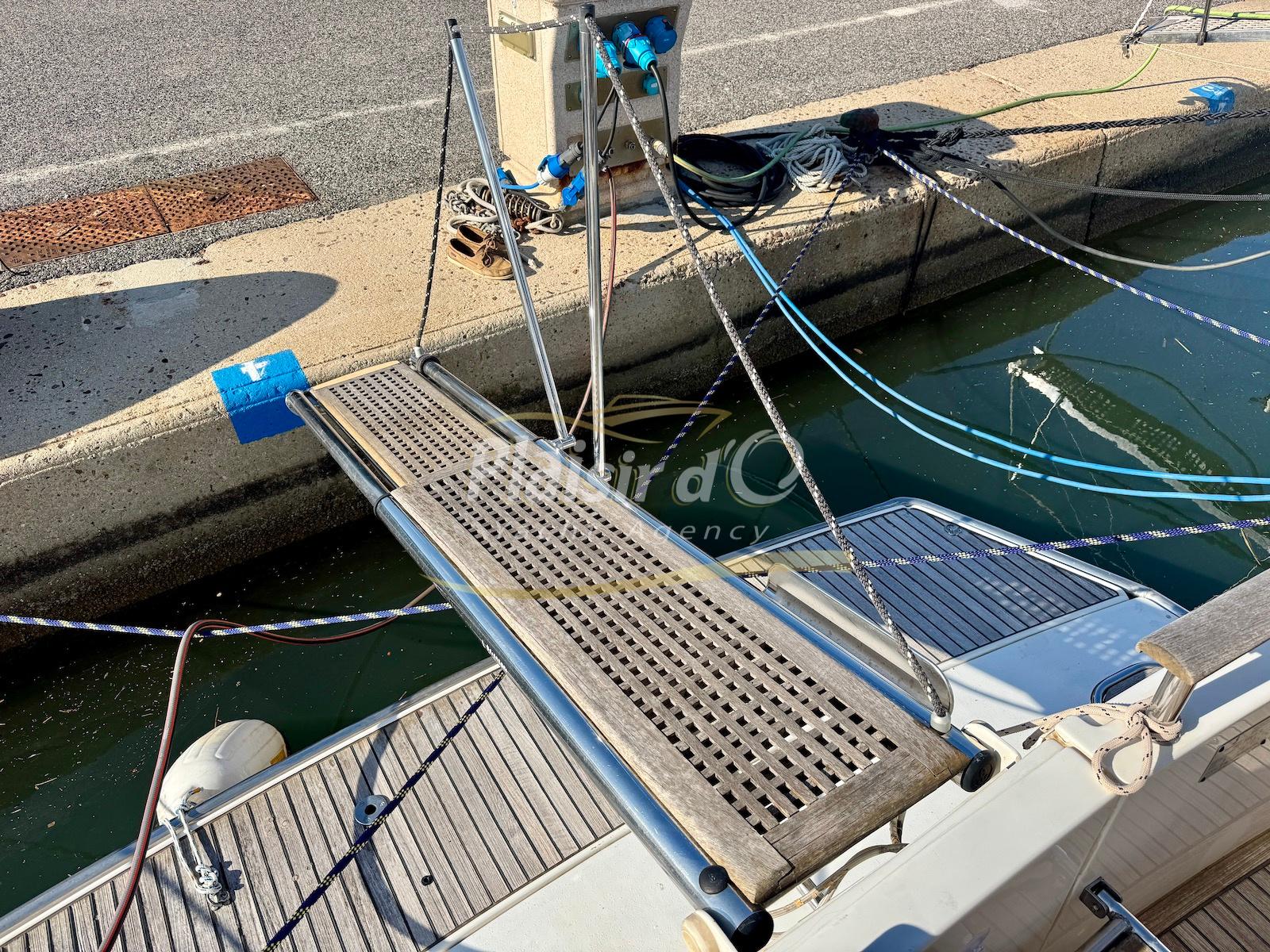 FULL OPTIONS : Climatisation réversible, générateur, passerelle hydraulique, pilote automatique, cockpit teck, GPS/sondeur Raymarine, propulseur d’étrave, VHF, TV, 2 réfrigérateurs, plateforme de bain allongée.
