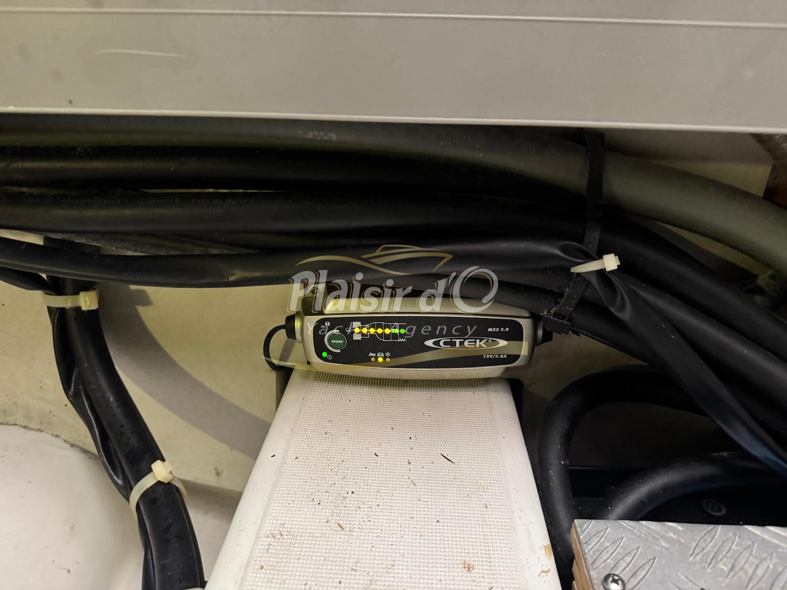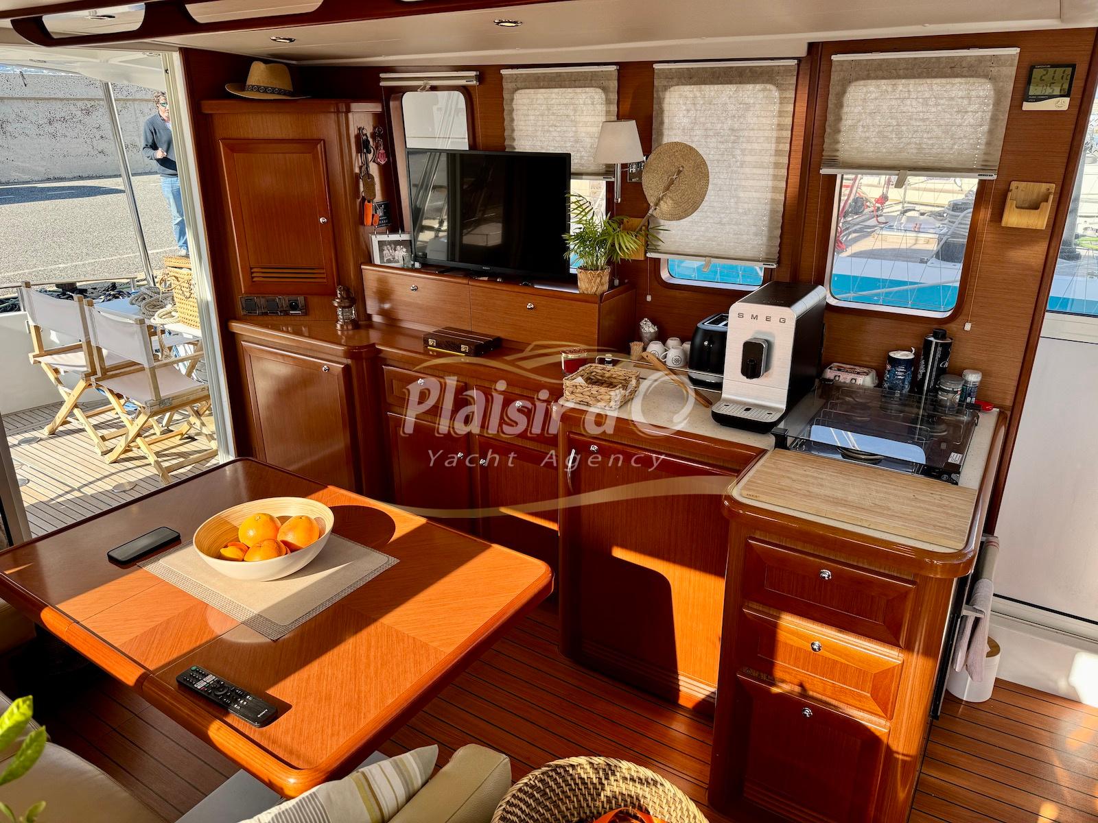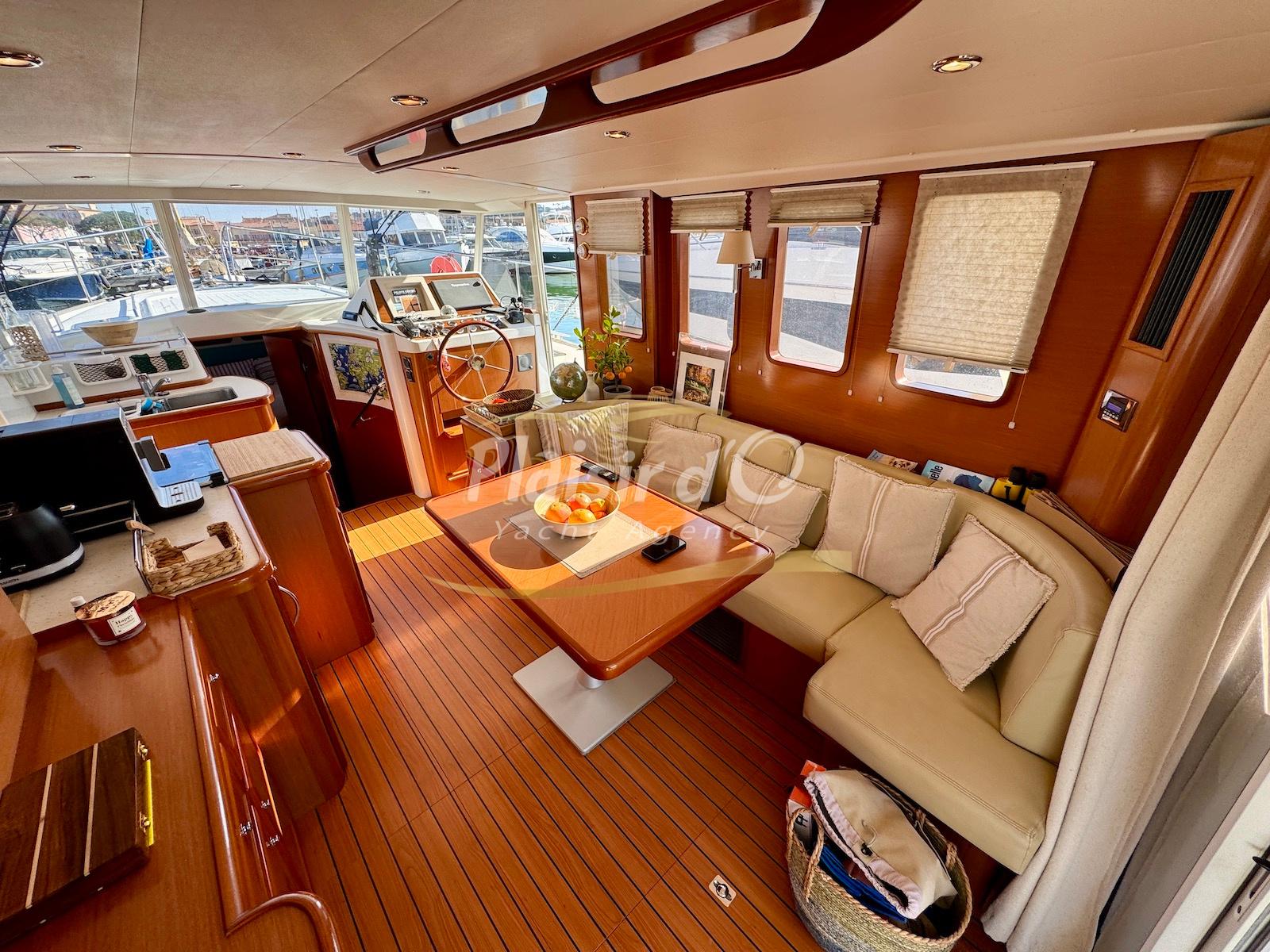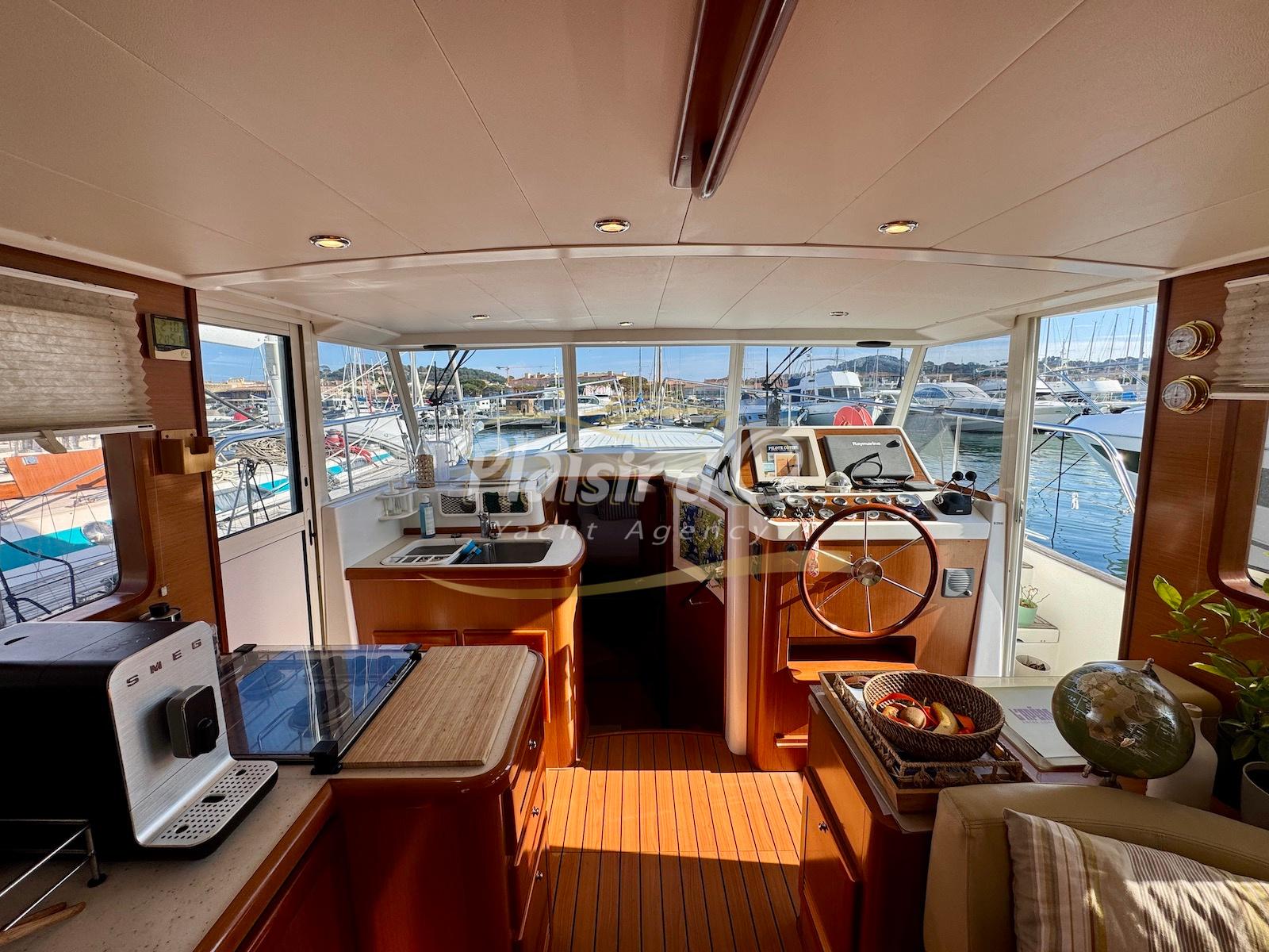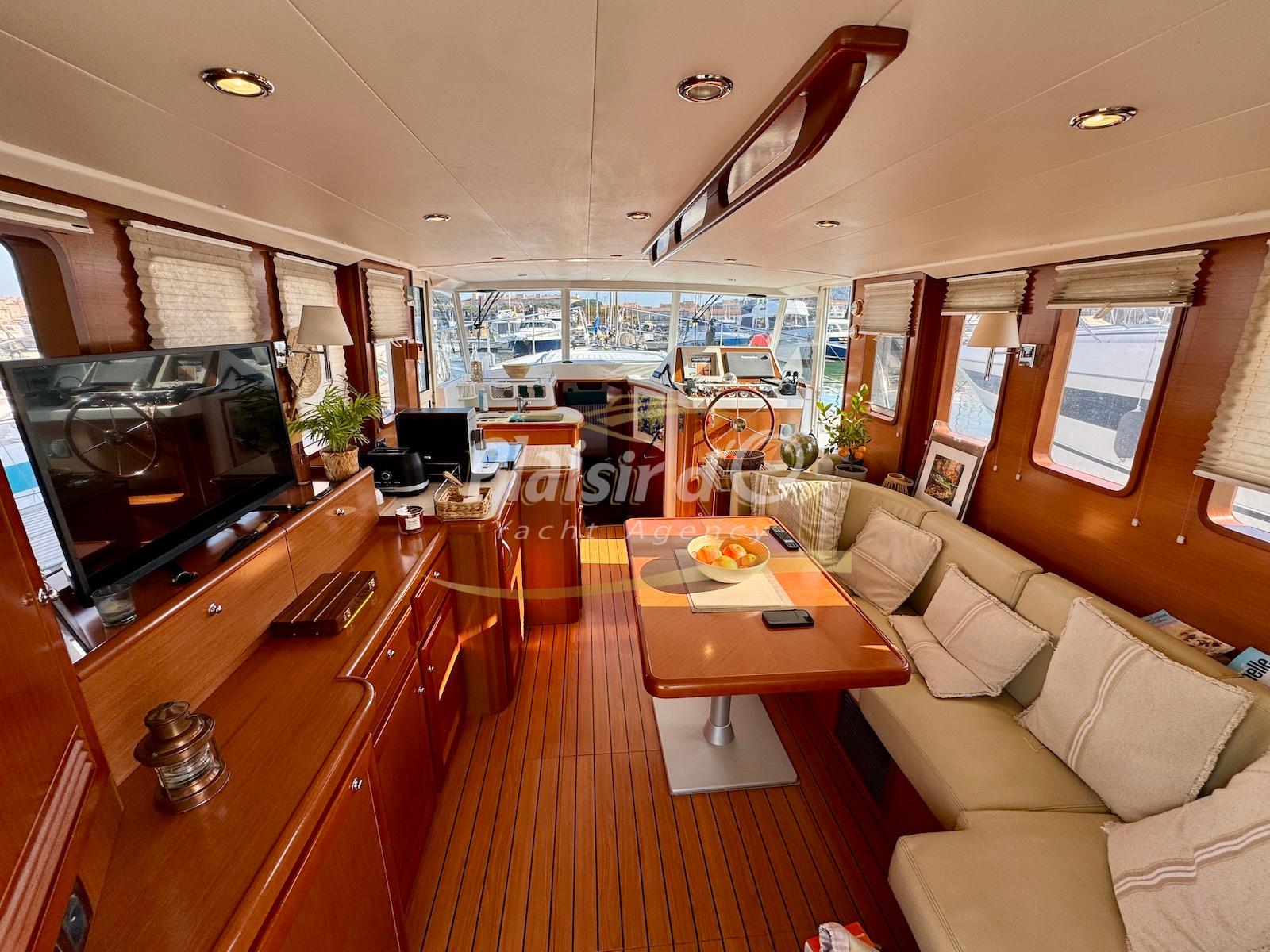 FULL OPTIONS : Climatisation réversible, générateur, passerelle hydraulique, pilote automatique, cockpit teck, GPS/sondeur Raymarine, propulseur d’étrave, VHF, TV, 2 réfrigérateurs, plateforme de bain allongée.
