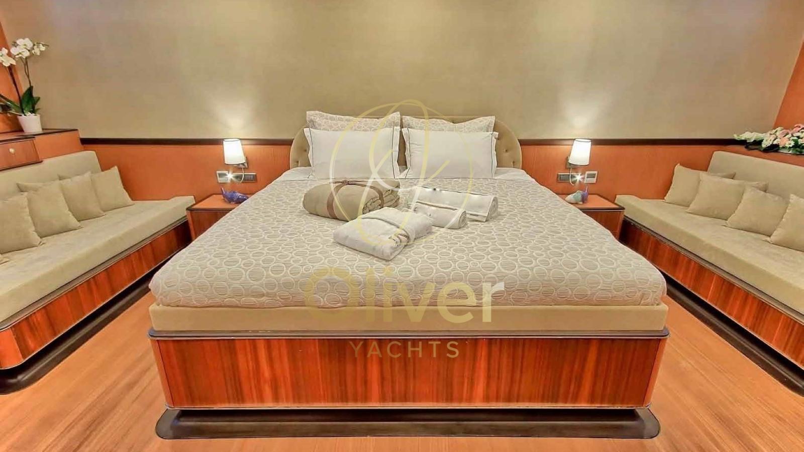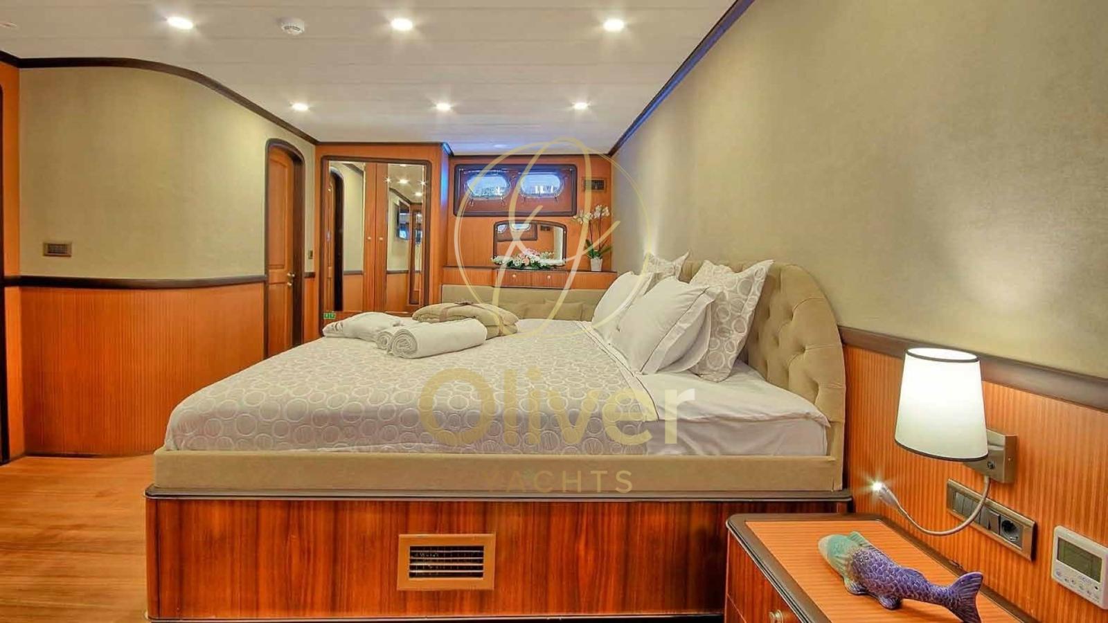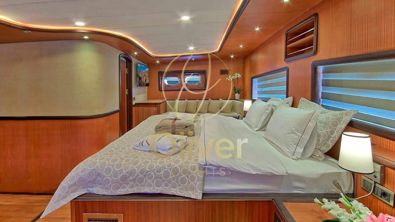 Les intérieurs sont conçus avec des finitions de haute qualité, en utilisant du bois précieux et des détails sophistiqués. La goélette dispose de huit cabines luxueuses, dont une Master, une VIP quatre Doubles et deux Triples, toutes avec salle de bain privée et climatisation.