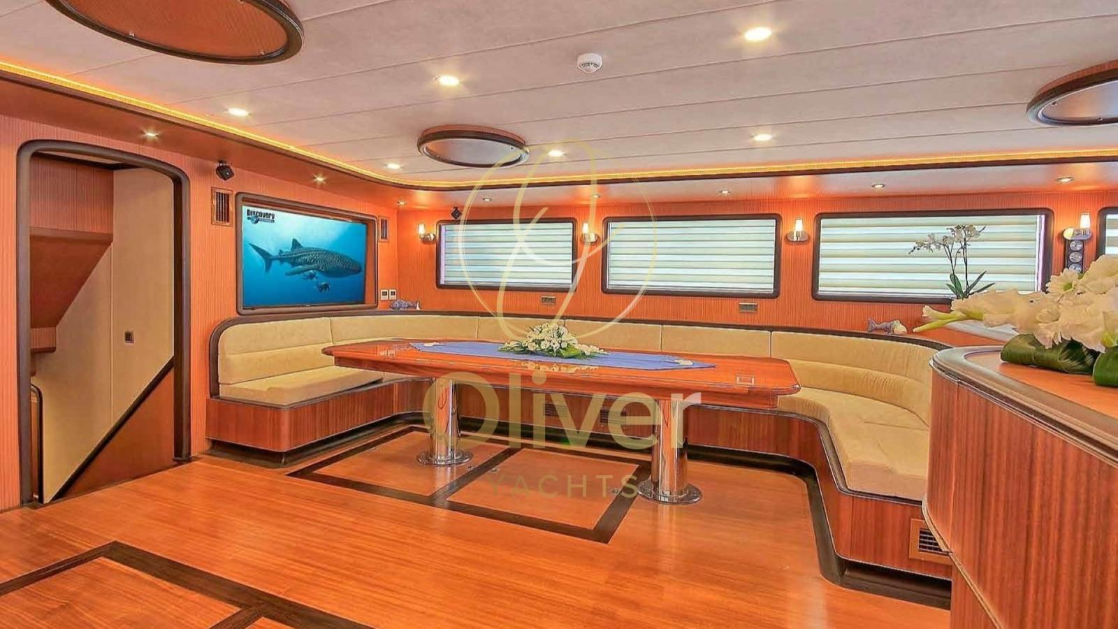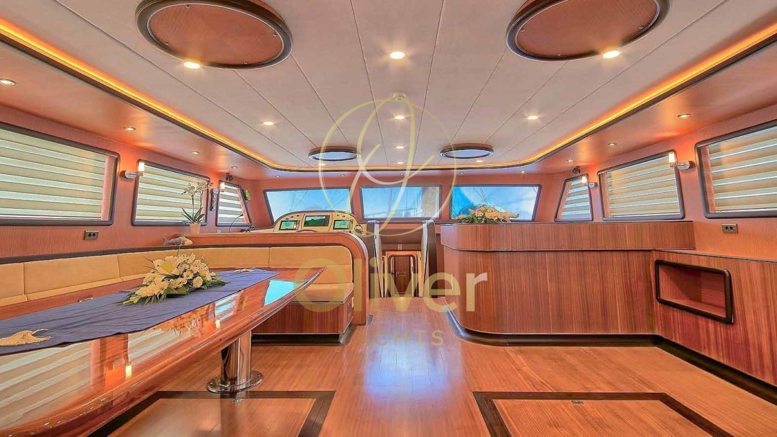 L’intérieur de ce bateau reflète un équilibre parfait entre élégance, confort et fonctionnalité, offrant un environnement raffiné et accueillant pour les clients. Conçues avec des matériaux de haute qualité, elles combinent du bois noble, des détails en acier et des tissus luxueux, créant une atmosphère sophistiquée et relaxante.