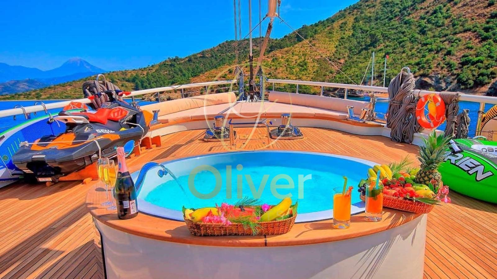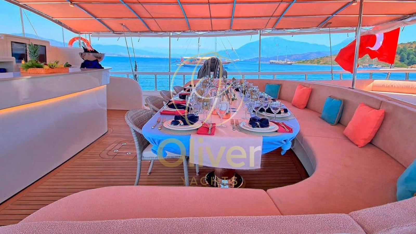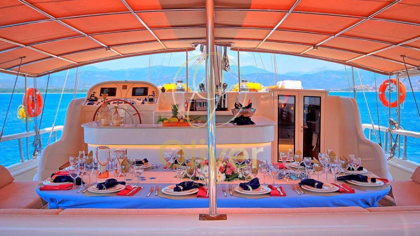 D’une largeur de 8,5 mètres, il offre des espaces généreux tant à l’intérieur qu’à l’extérieur. Le pont avant, avec un grand bain de soleil et un jacuzzi, est parfait pour se détendre tout en profitant de la vue sur la mer. À l’arrière, une grande salle à manger extérieure vous permet de dîner dans un confort total, entouré de l’atmosphère unique de la vie en mer.
