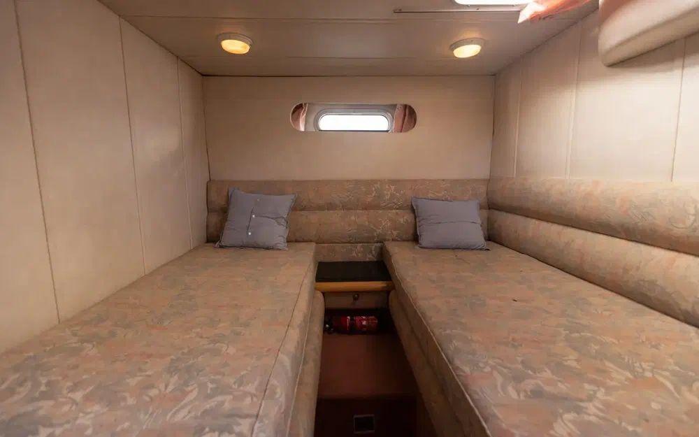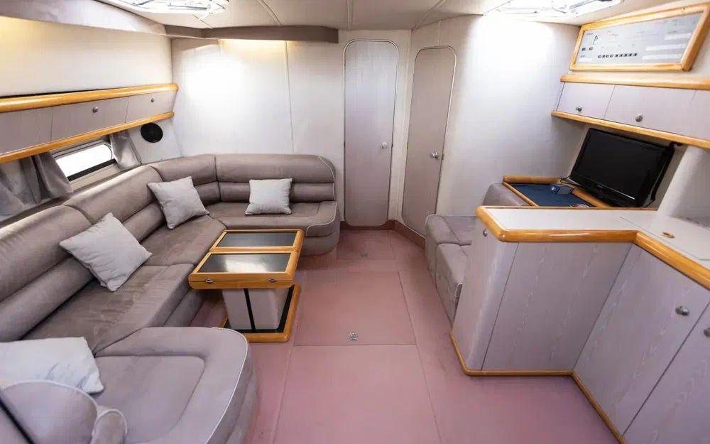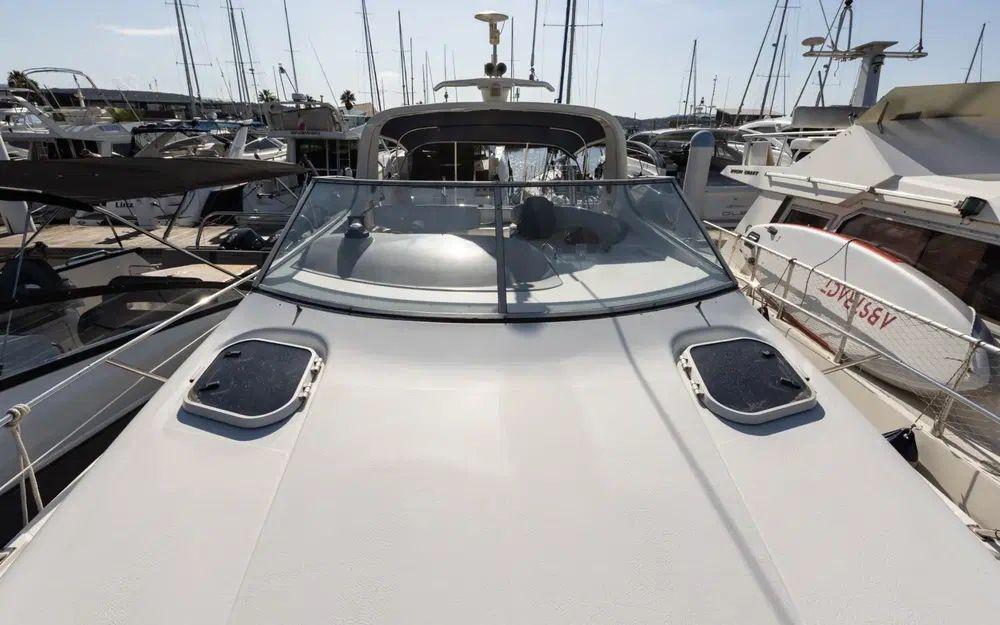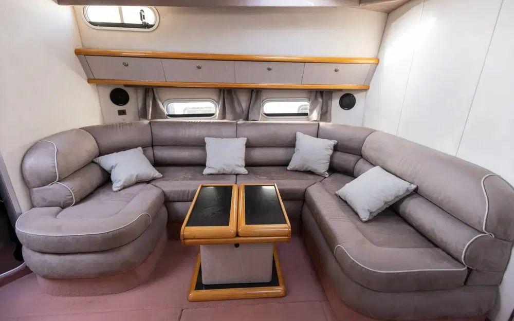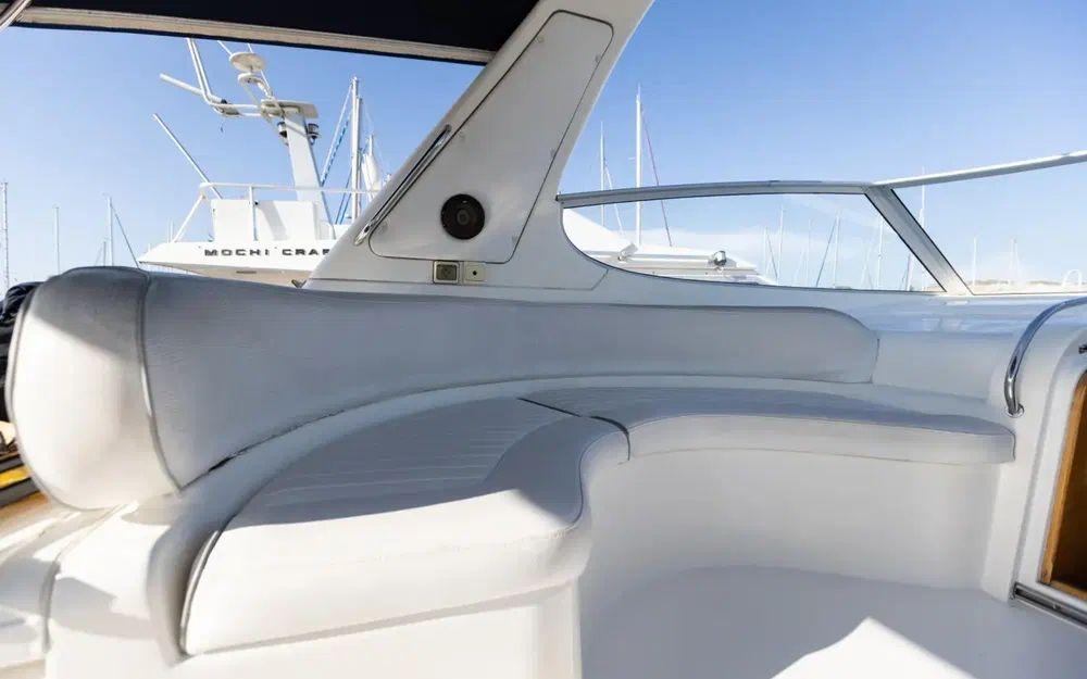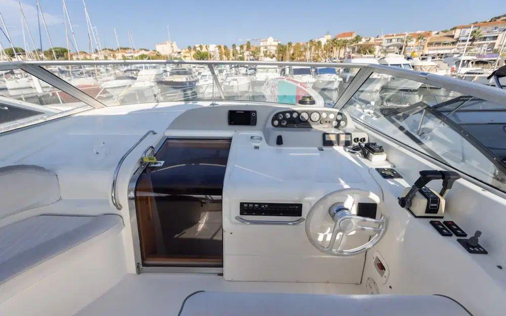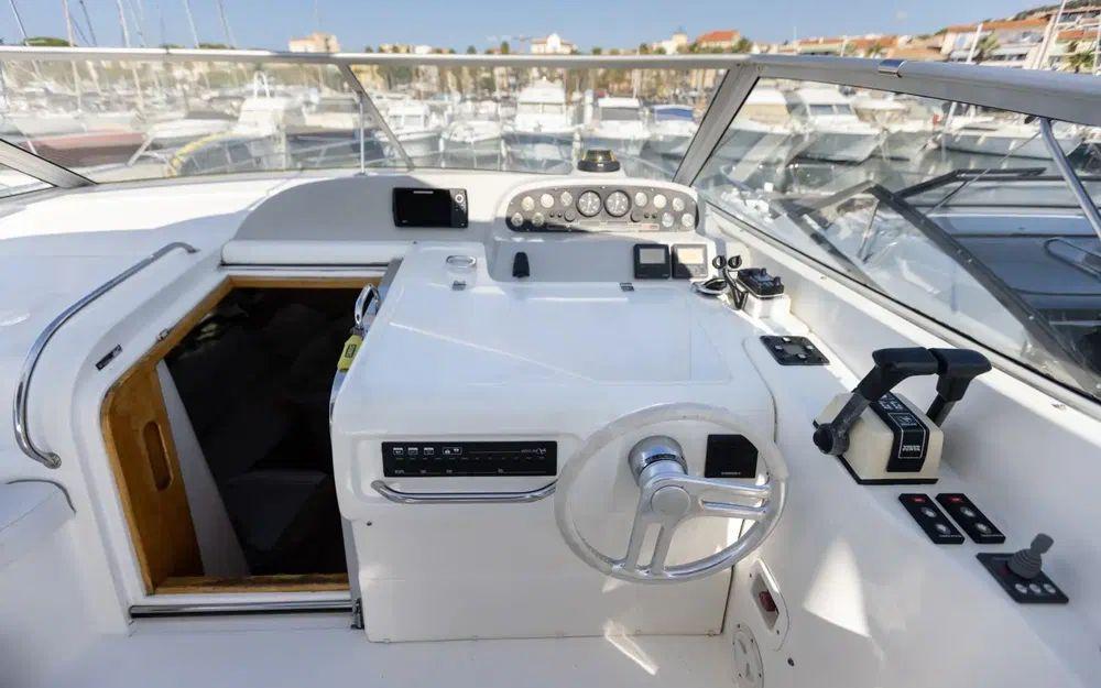 Esthétiquement cette unité présente quelques éclats de gelcoat et points de faïençage à divers endroits mais ce ne sont globalement que des défauts mineurs. Les selleries du carré intérieur ont été refaites et sont dans un état neuf. Les selleries extérieures sont en moins bon état.