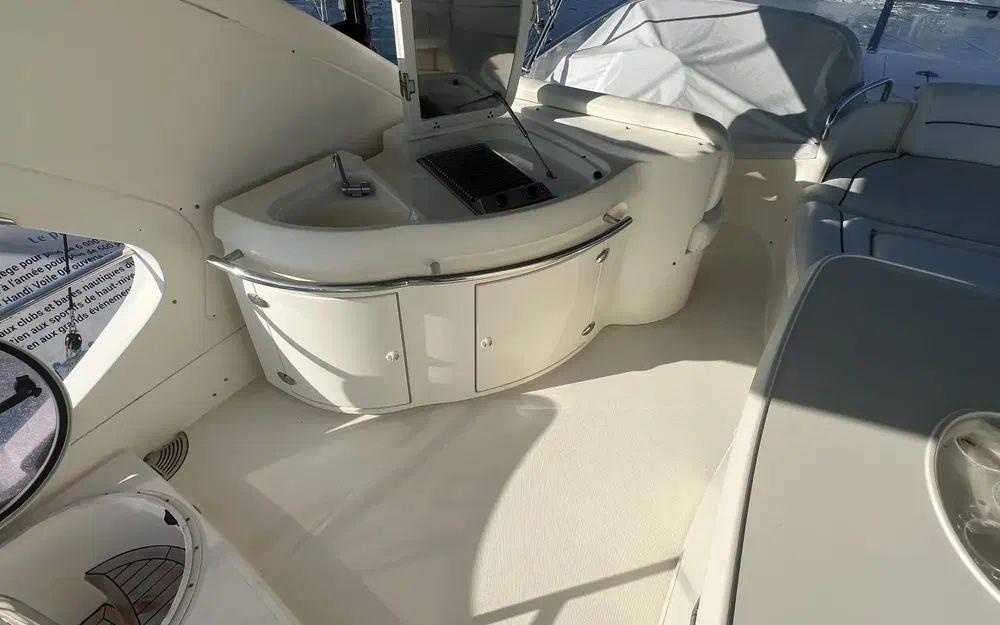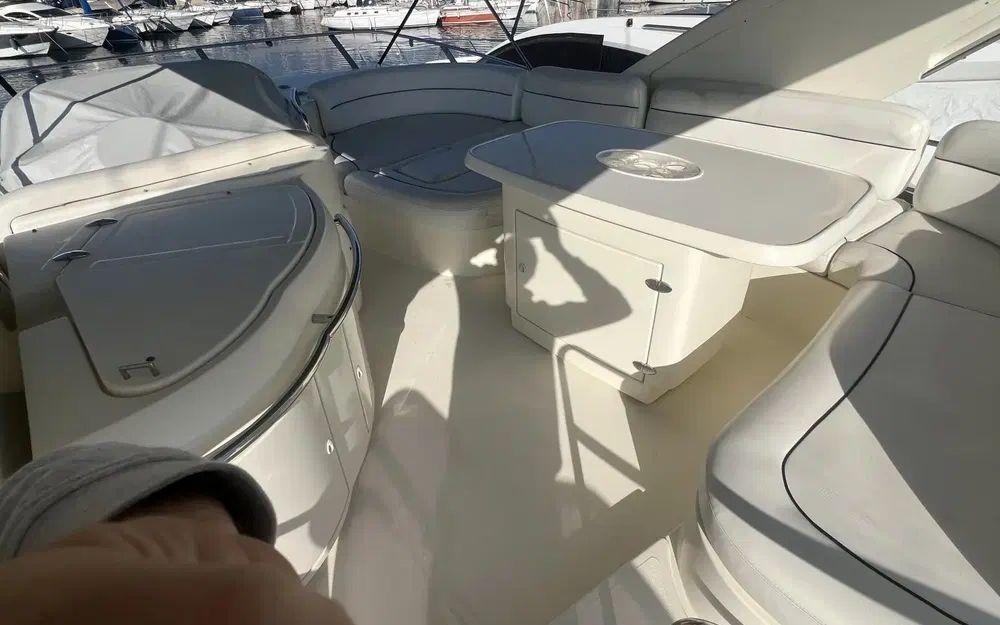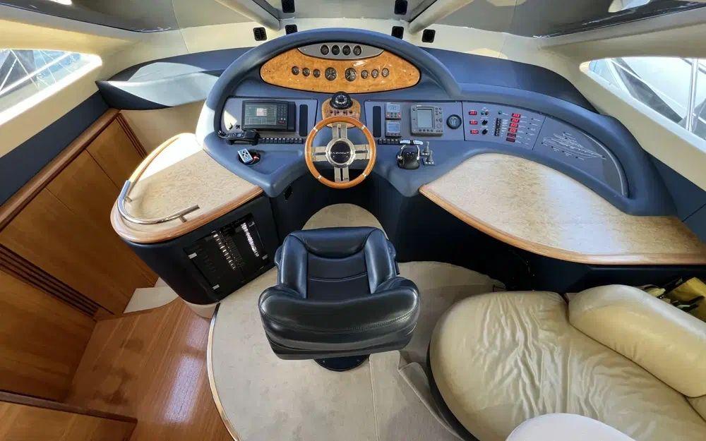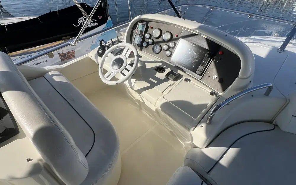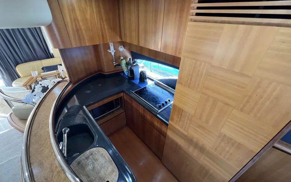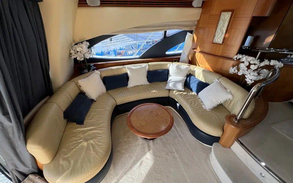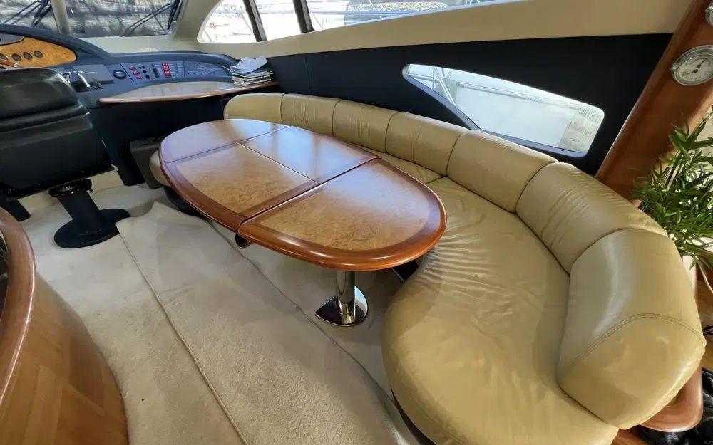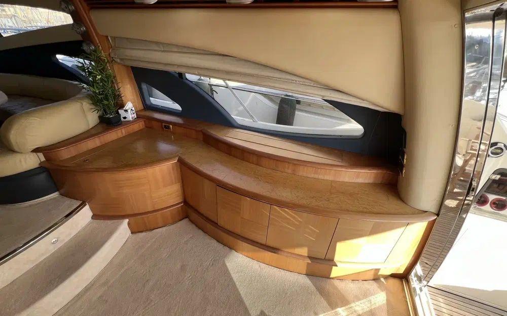 Lorsqu'on rentre depuis la porte coulissante, là encore, les espaces impressionnent. Un premier carré sur bâbord est idéalement situé pour profiter de la télévision rétractable et du home cinema. Dans un deuxième espace en position centrale une table de salle à manger est située à bâbord face à la cuisine ouverte et équipée d'une plaque à induction, d'un grand réfrigérateur avec congélateur, d'une machine à glaçon et d'un lave vaisselle. Cet espace est agrémenté de nombreux rangement y compris dans la descente d'escalier vers les cabines. Au poste de commande de la timonerie tout est en excellent état de présentation.