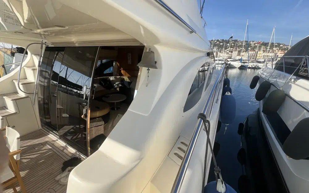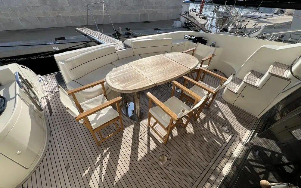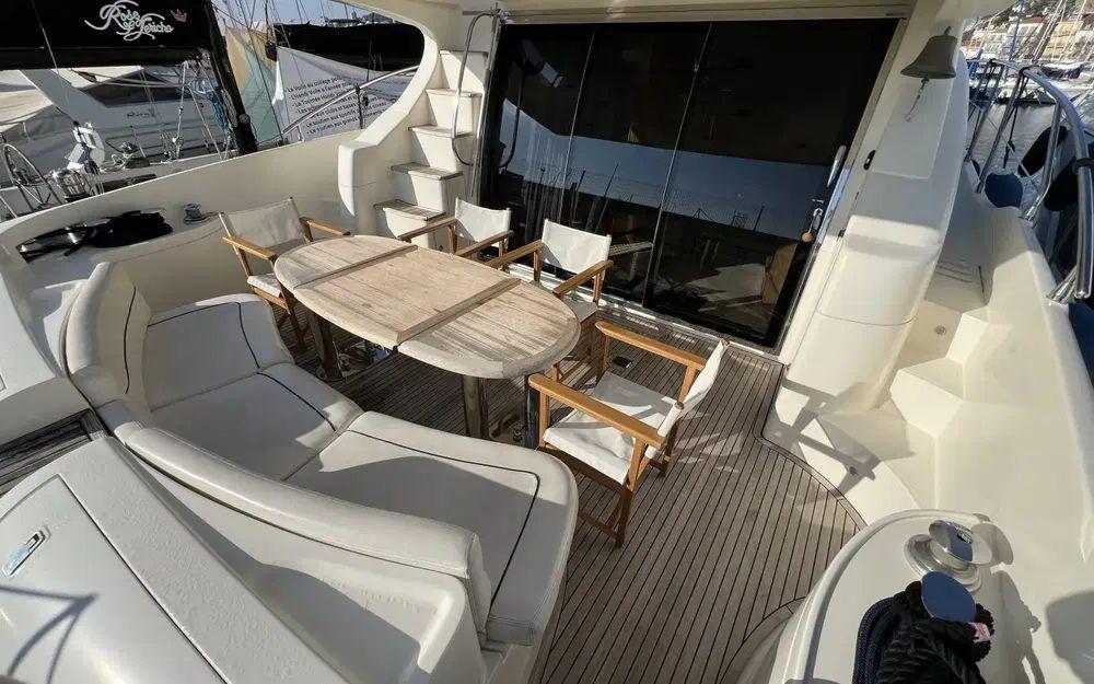 Au fly, tout est pensé pour passer des moments conviviaux. Un grand bain de soleil arrière, un grand carré avec une méridienne et un barbecue et un réfrigérateur et un évier. Le poste de commande à bâbord en position avancée est idéalement placé, a un encombrement réduit et permet une vue à 360° du bateau. Le pont accueille un grand bain de soleil et ici encore tout est en excellent état. Nous n'observons pas d'irrégularités. Les encadrements de fenêtres sont en très bon état et aucun point d'infiltration n'a été constaté.