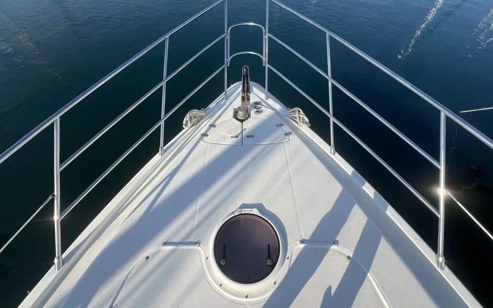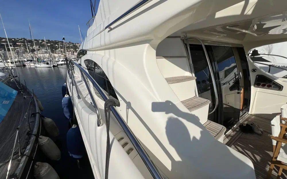 Dès l'arrivée à la poupe du bateau, nous observons clairement que le bateau est suivie avec attention. Le gelcoat est bien brillant et bien blanc sur l'ensemble du bateau. Lorsqu'on monte à bord les 5 m de largeur en imposent. La descente dans le cockpit depuis la passerelle hydraulique se fait avec une facilité déconcertante. Nous constatons d'emblée que toutes les superstructures sont dans un état proche de la sortie d'usine. Le teck présente quelques irrégularités en lien avec son âge qui restent mineures. Tous les équipements sont en ordre de marche.