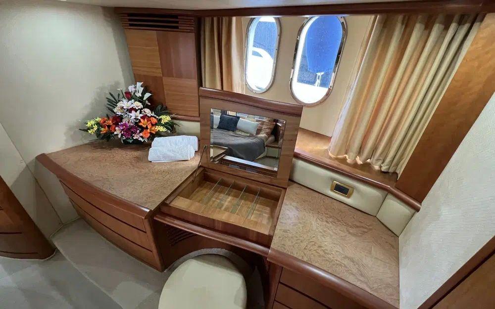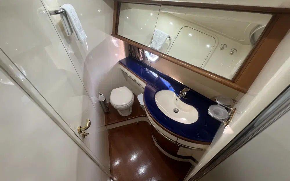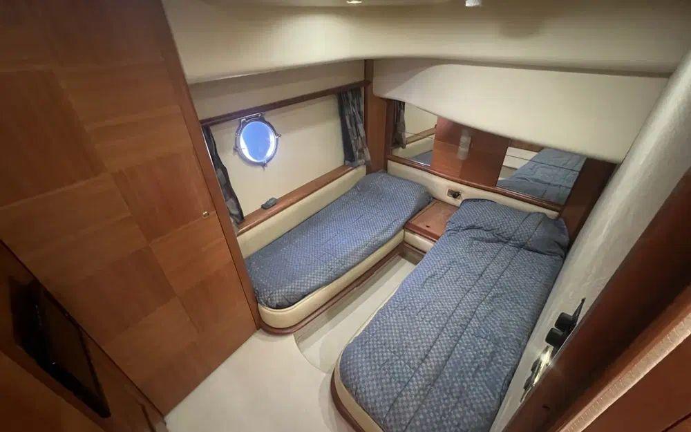 La cabine master traversante avec sa salle de bain attenante, un grand dressing et une hauteur sous barreau d'environ 2m est particulièrement spacieuse. Cette cabine est pensée pour une optimisation totale du confort de ses occupants. À l'avant la cabine VIP est elle aussi très spacieuse, bénéficie d'une salle de bain attenante ainsi que d'un grand dressing.