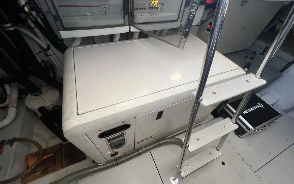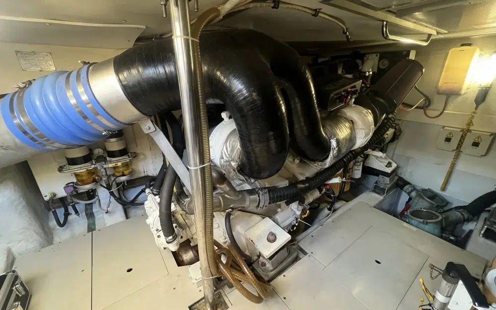 Une fois dans la cale moteur, nous observons une fois encore que l'unité est entretenue avec attention. Pas de traces de fuites ni de traces de gras sur les deux moteurs Caterpillar de 1015cv et en dessous. Dans la cale tout est méticuleusement organisé et identifié. Nous n'observons pas de traces de corrosions sur les moteurs et inverseurs. Bateau suivi et révisé annuellement. La dernière intervention sur les échangeurs remonte à 2021.