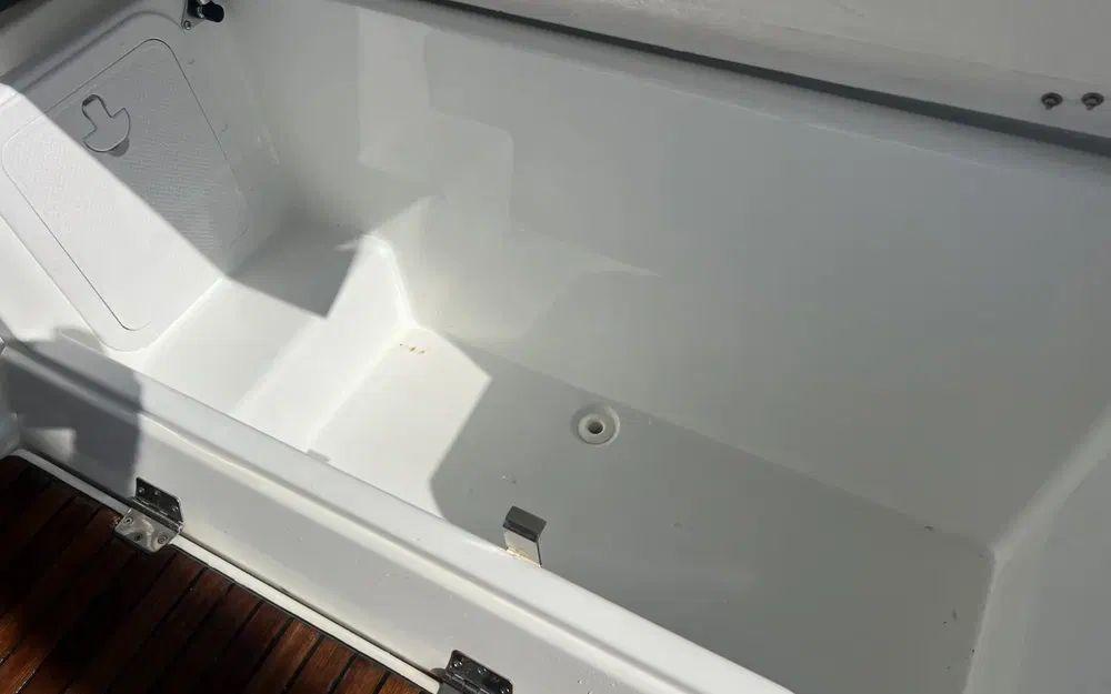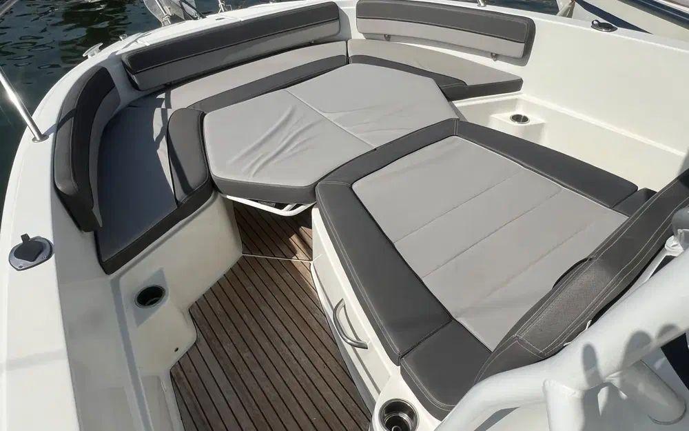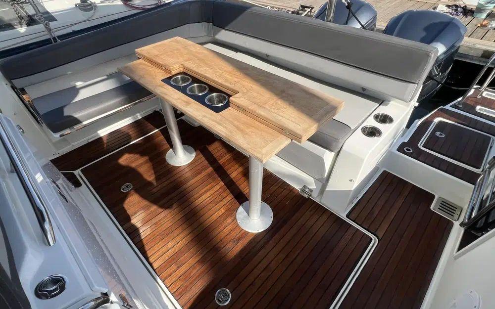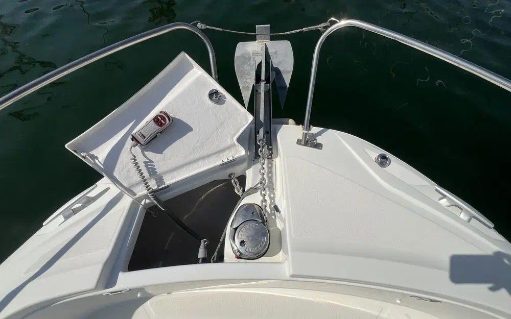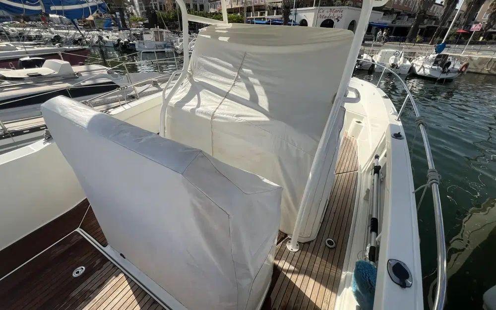 Les photos sont parlantes! Le bateau est dans un bel état de présentation, peu sollicité. À l'exception d'un éclat de sur le gelcoat de la plate forme arrière bâbord et de quelques points de faïençage de surface autour des points d'arrimage du T-Top sur le haut de la console il n'y a rien à signaler que ce soit sur la coque, le liston et les superstructures. Toutes les selleries extèrieures sont en excellent état de présentation. Le teck est en bon état avec une patine en lien avec l'âge du bateau sans aucun point de décollement. Tous les équipements on été testés et sont en ordre de marche.