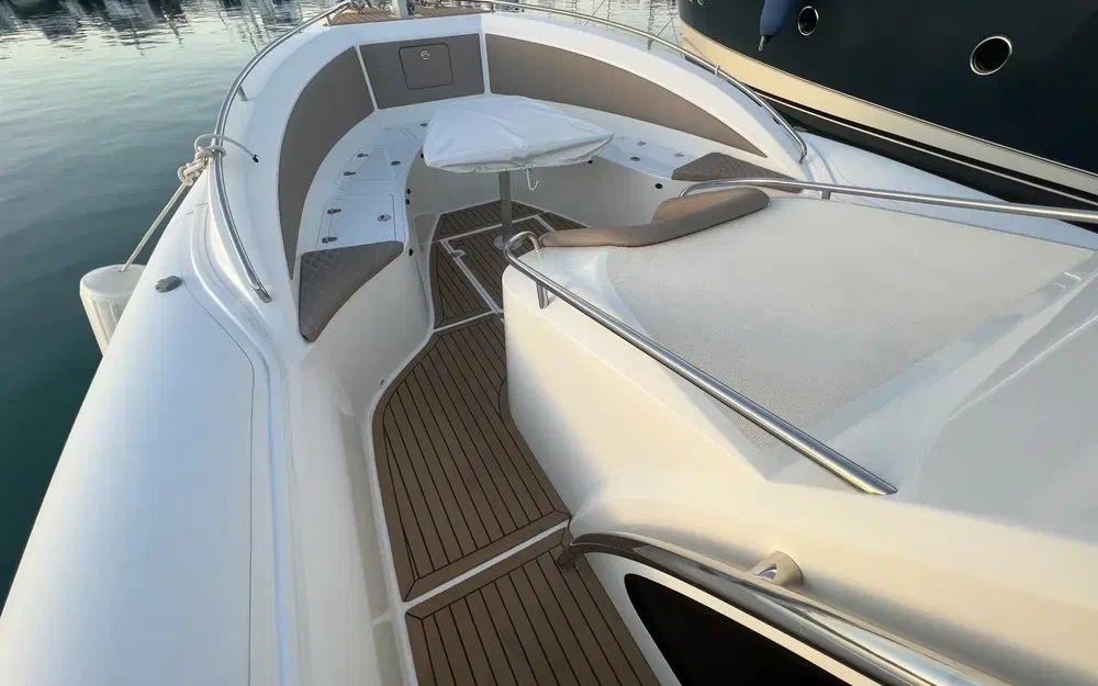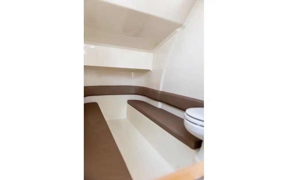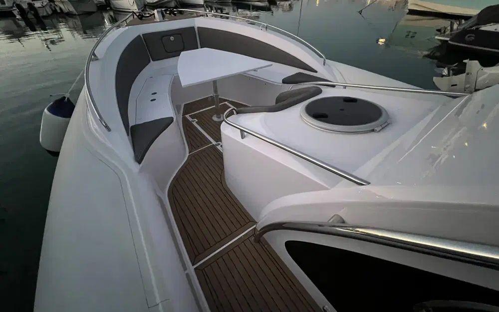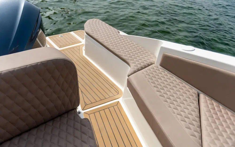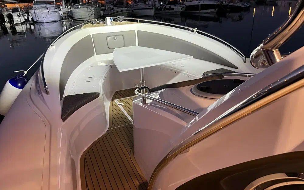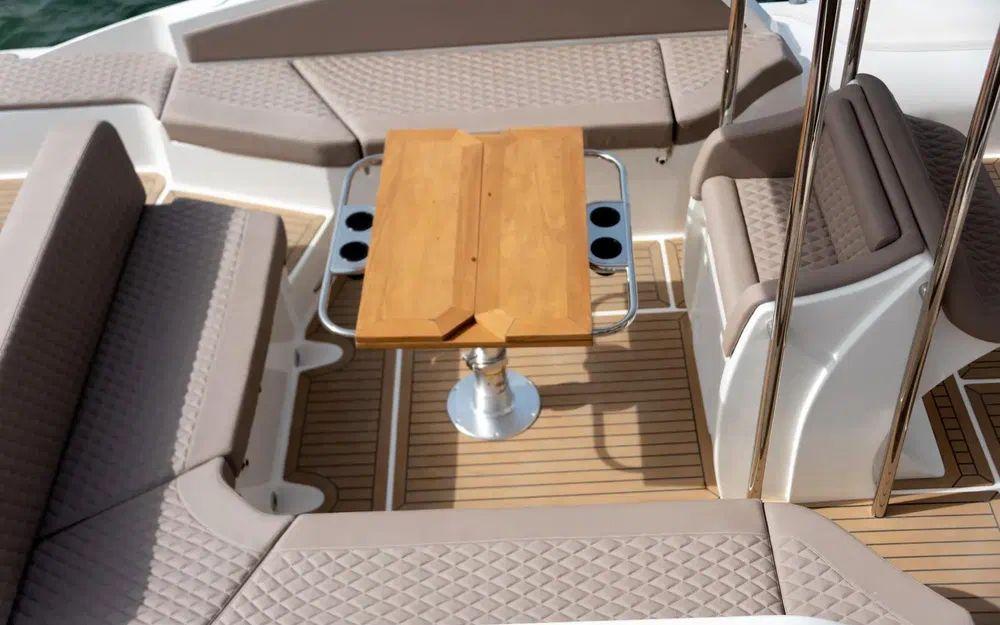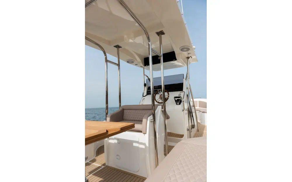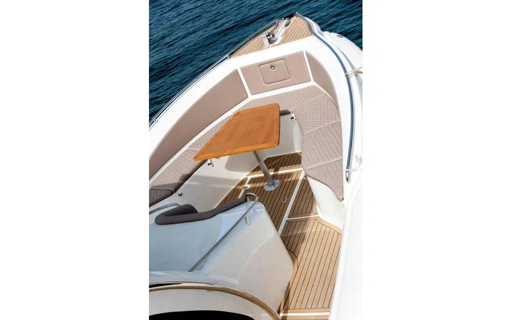 Le Espadon 1000 est très attrayant et remarquablement bien aménagé. Il offre un imposant salon en U à l'arrière ainsi qu'à l'avant transformable en grand bain de soleil. Le parti pris du T-top fixe sur cette unité renforce le sentiment de sécurité à bord et permet également d'intégrer aussi bien des rangements que de l'électronique.