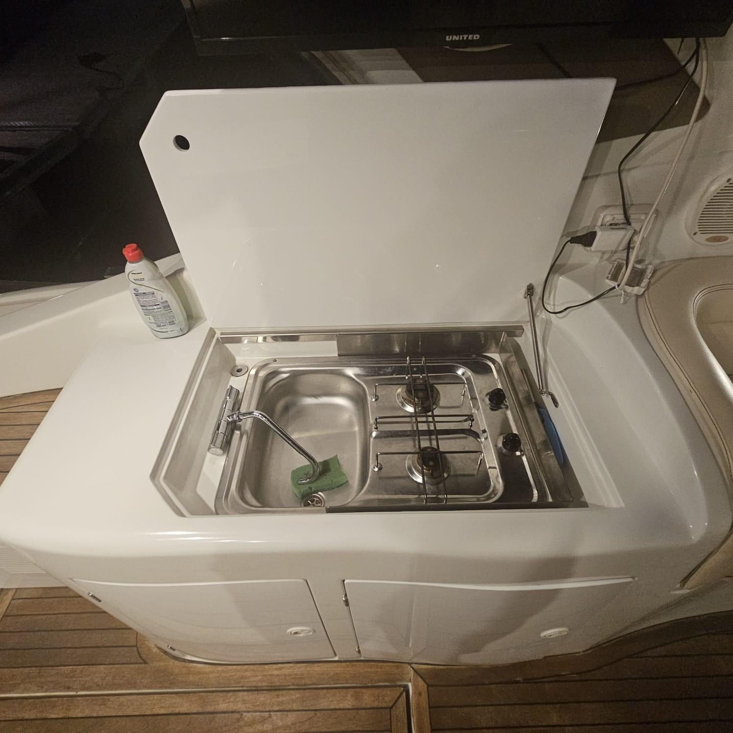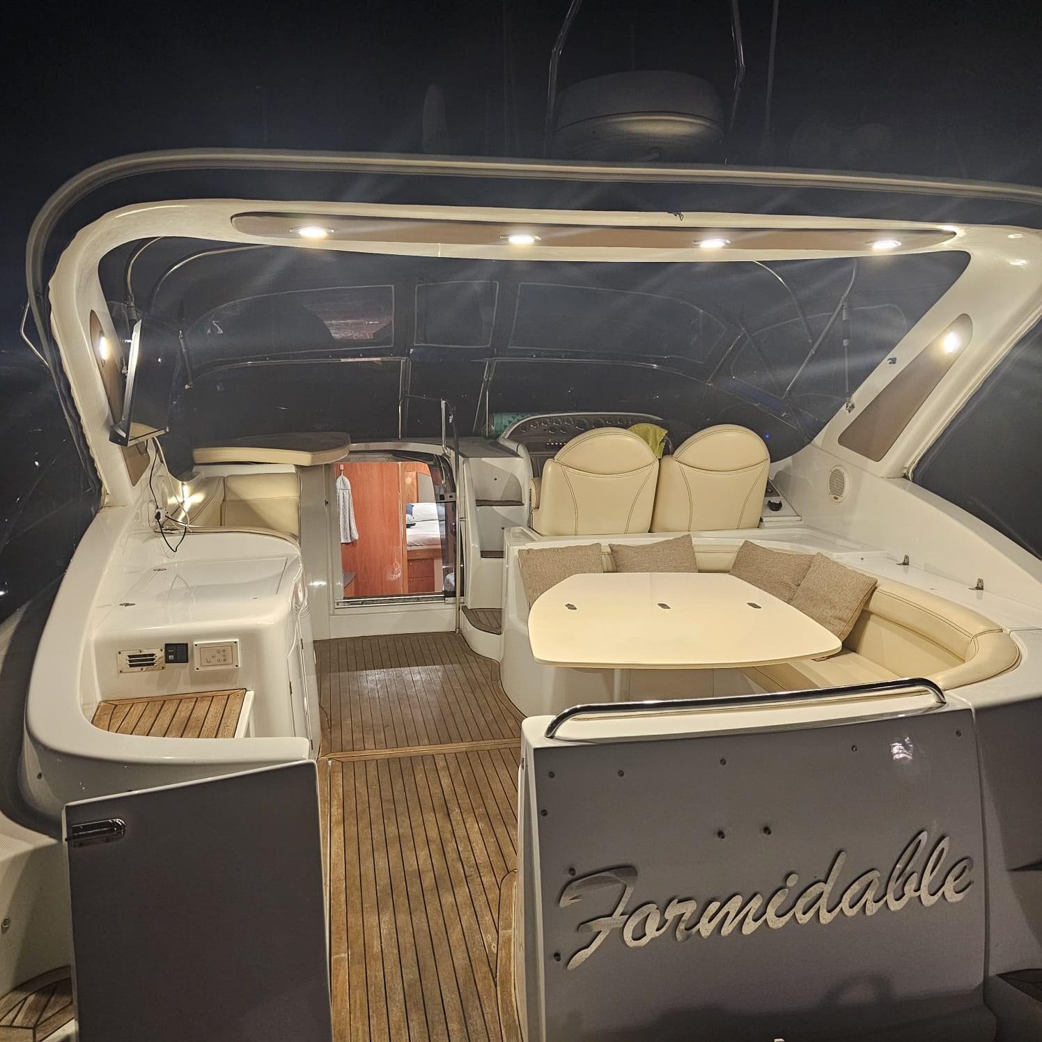 Eau sous pression, Passavant en teck, Douche de cockpit, Flaps hydrauliques (N°2), Passerelle, Plateforme arrière, Pompe de cale automatique, Cockpit en teck, Prise de quai, Rollbar, Guindeau électrique, Echelle de bain, table de cockpit.
