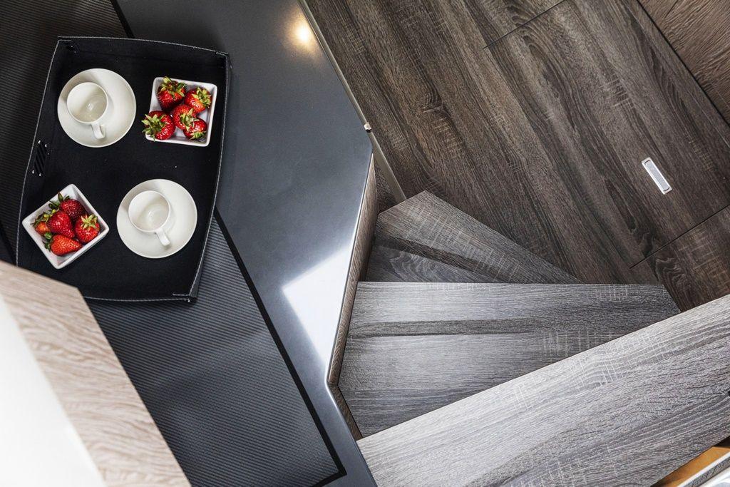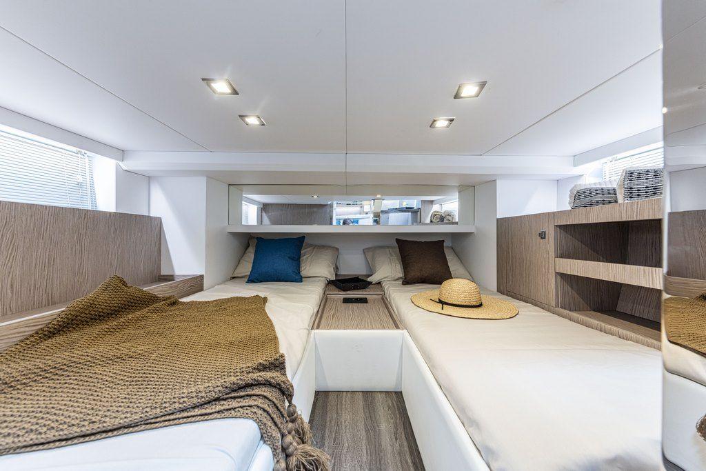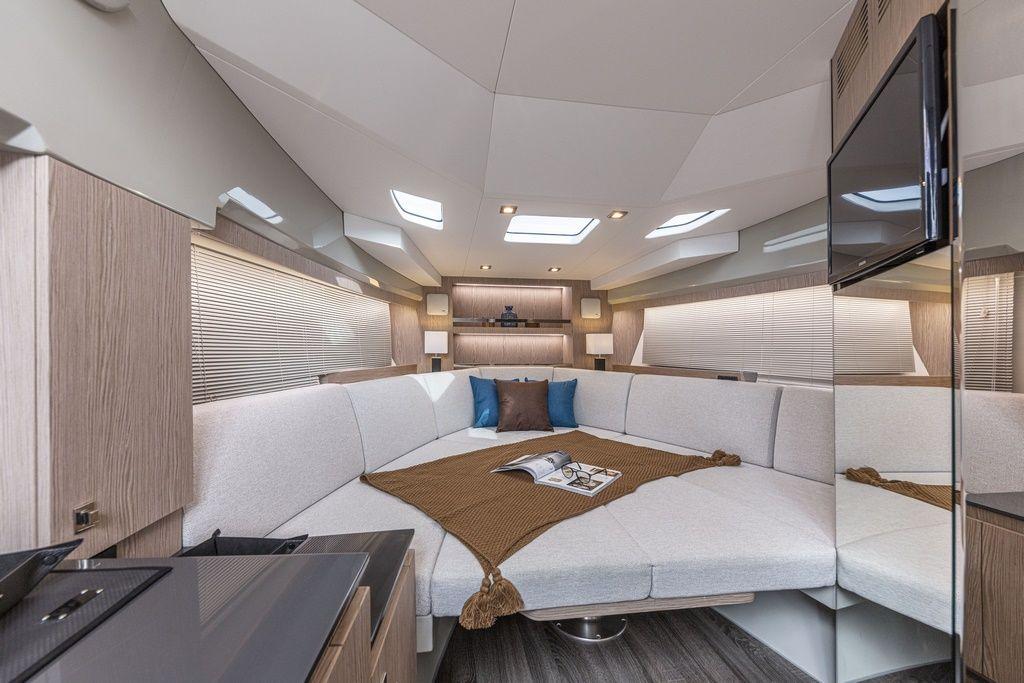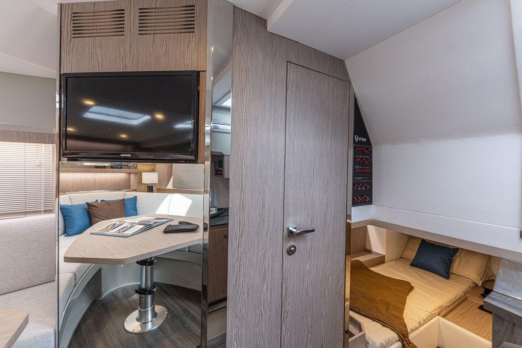 Le FIM 340 Regina ne se contente pas de séduire par ses espaces extérieurs. Son intérieur est une véritable invitation à l’élégance. Descendez dans les quartiers de nuit, où chaque détail a été optimisé pour offrir un espace fonctionnel et luxueux. La hauteur sous barrot impressionne, créant une sensation de volume et de liberté.