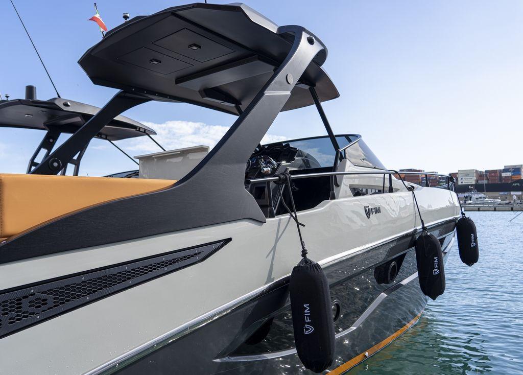 Le FIM 340 Regina se distingue par ses lignes fluides et audacieuses. Son hardtop en carbone recyclé est une des innovations majeures de ce modèle. Inspiré de l'aéronautique, ce hardtop est ajustable et permet de moduler l'ombre et la lumière à bord grâce à un système de lames ouvrantes type pergola. Cela permet aux propriétaires de profiter du soleil tout en restant protégés de la chaleur, créant ainsi un confort optimal.