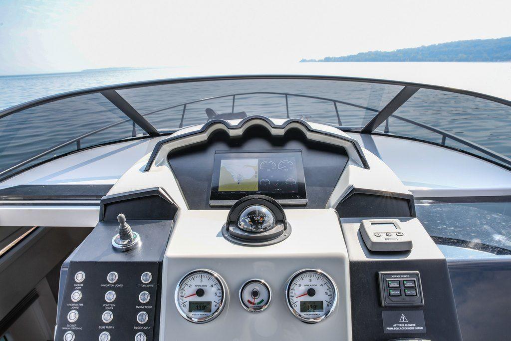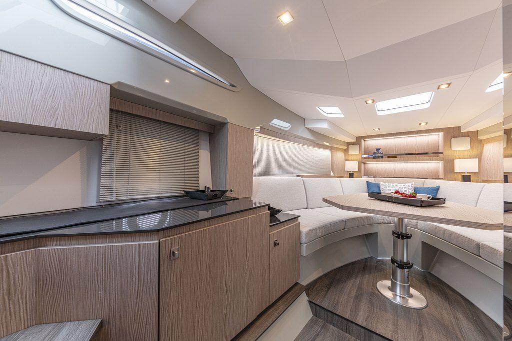 La coque sculptée, disponible en gelcoat ou en peinture métallisée, peut être personnalisée selon les préférences du propriétaire. Ce yacht coupé allie performance et esthétique grâce à son design moderne qui combine sportivité et raffinement. Ce yacht offre également un garage sous le bain de soleil arrière, permettant d'accueillir une annexe jusqu'à 2,80 mètres, ainsi que des pavois basculants et un bain de soleil modulable, transformant le pont en un espace de détente exceptionnel.