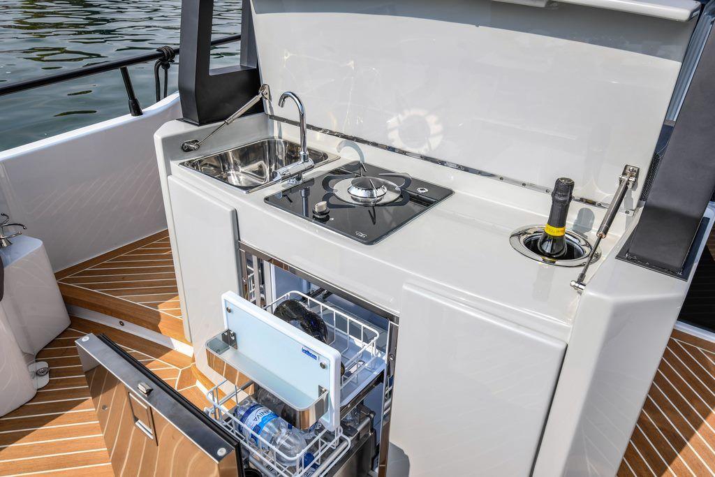 À l’arrière, le FIM 340 Regina dispose d’un espace extérieur généreux, parfait pour se détendre ou organiser des repas en plein air. Le cockpit est équipé d’une kitchenette, d’un réfrigérateur, d’un grill, d’une plaque à induction, et d’un ice maker, permettant de profiter pleinement des moments conviviaux. Les pavois basculants augmentent l’espace de détente, créant une ambiance chaleureuse pour les invités.