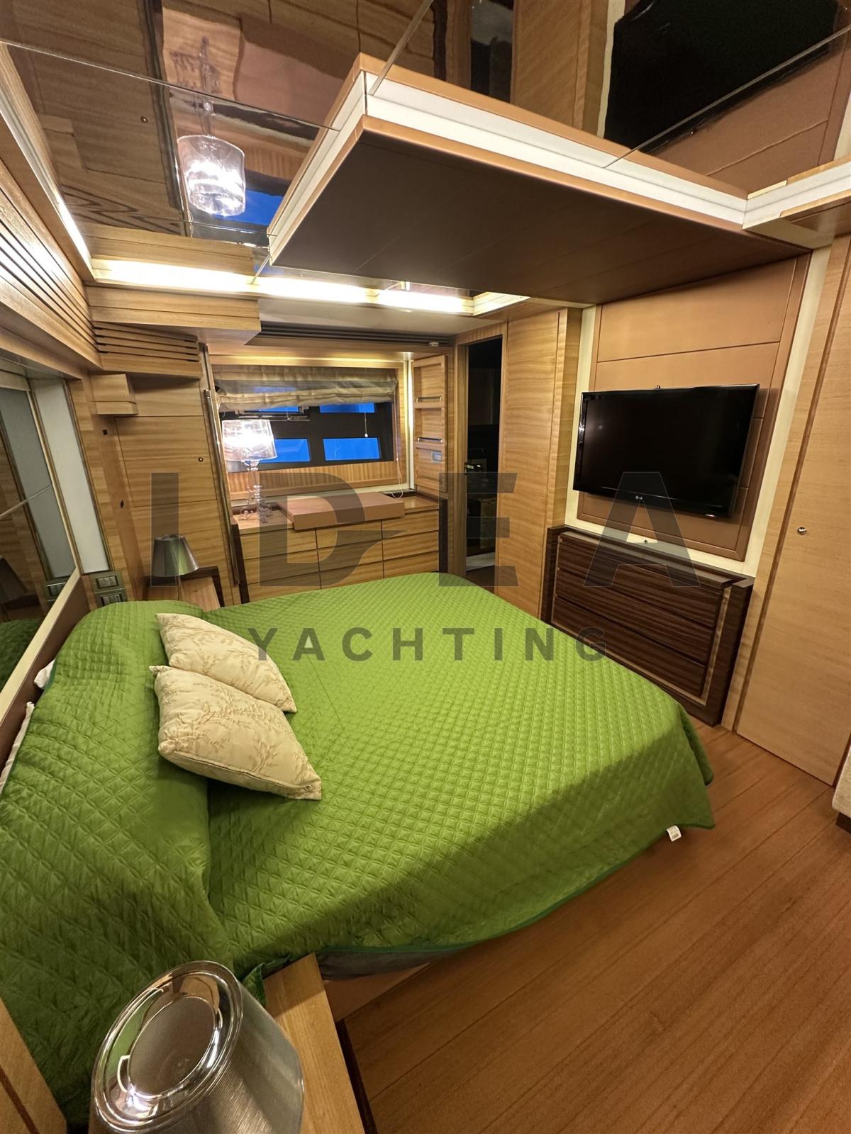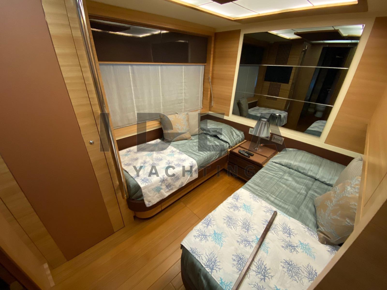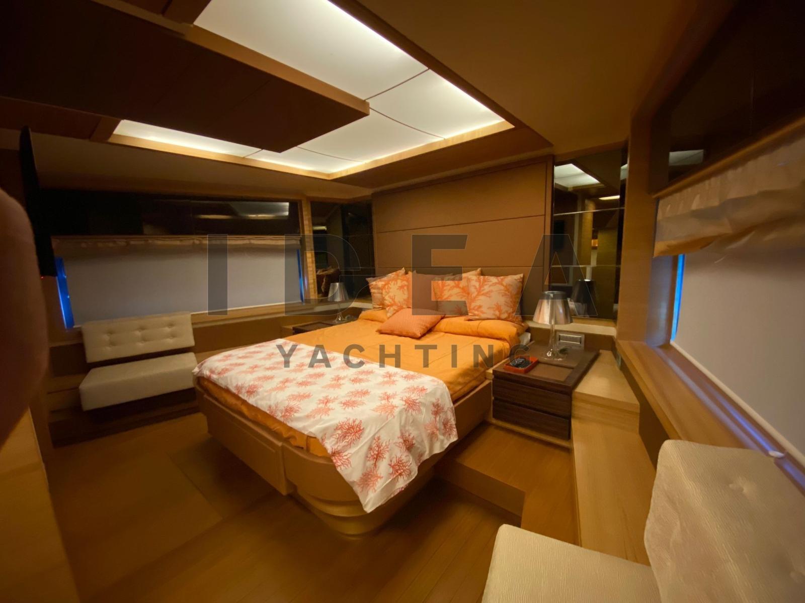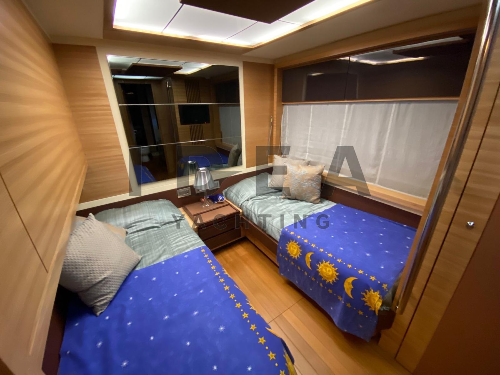 La cabine principale est située au milieu du navire vers la proue, de pleine largeur, et dispose d’un grand lit double et de deux bureaux, un de chaque côté ; dans la même zone, nous trouvons deux cabines en miroir avec des lits jumeaux et la cabine VIP, toutes avec salle de bain privée.