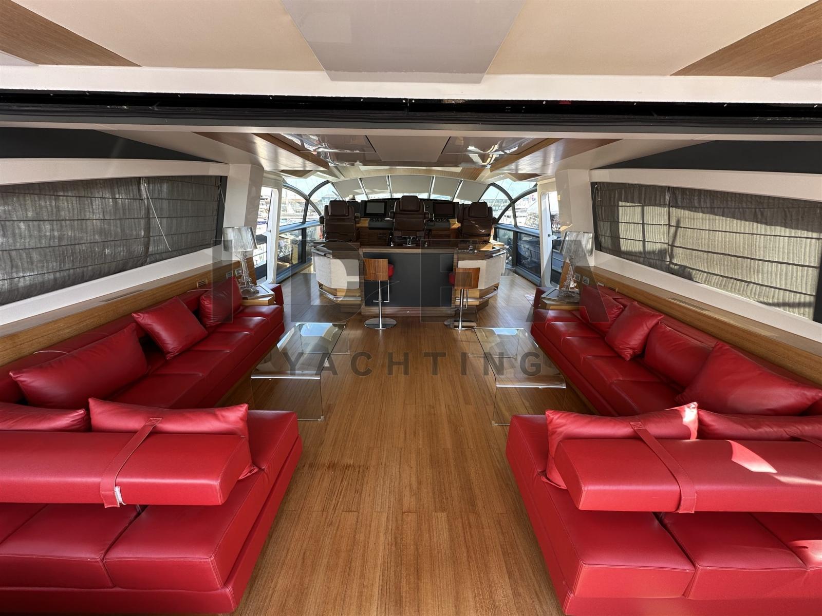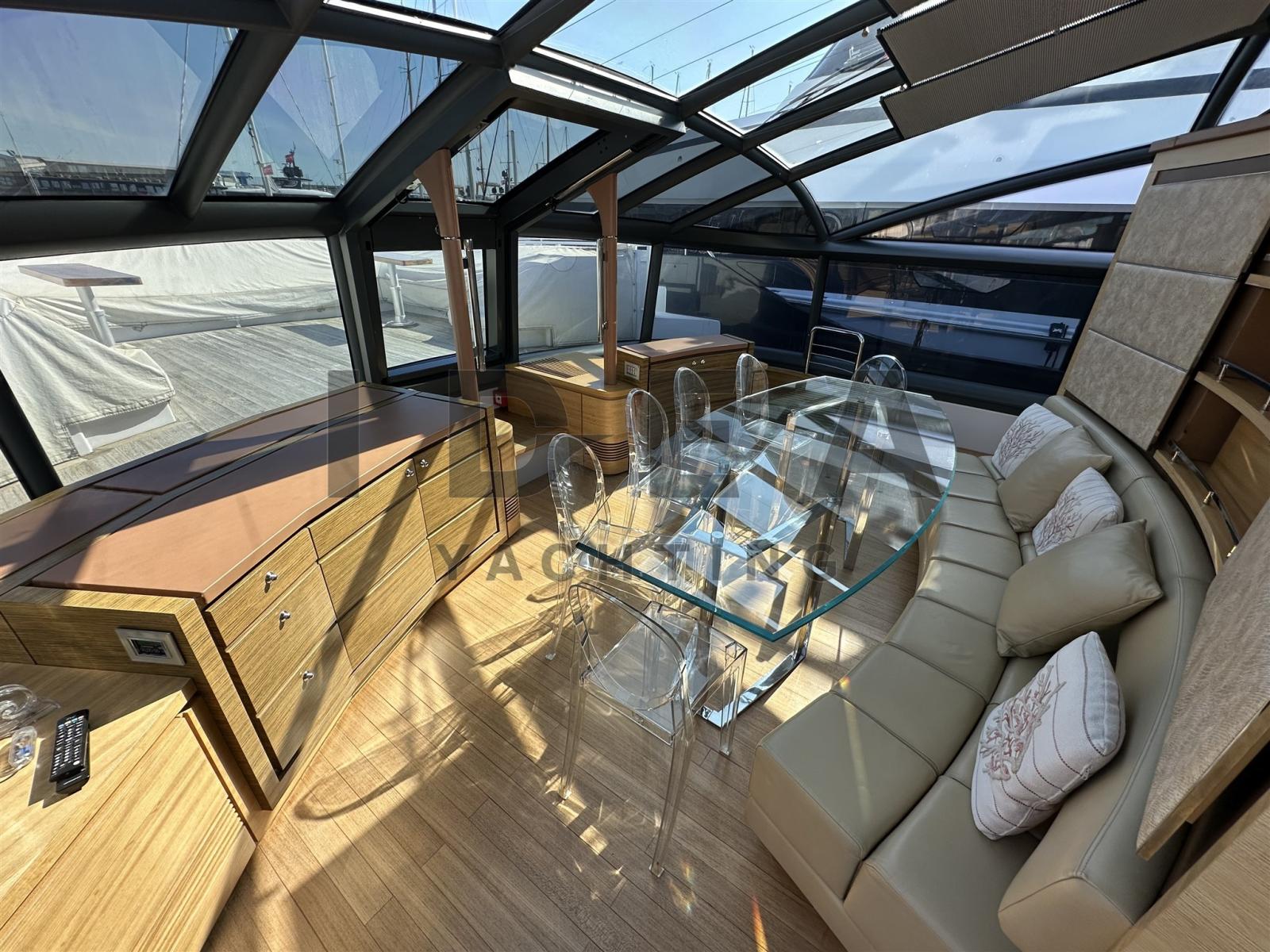 La spécificité est sans aucun doute la lumière, qui inonde tous les angles du bateau, mais il y a beaucoup de détails qui font du Baia One Hundred un modèle certainement innovant. À l’avant, il y a un véritable salon extérieur ; tandis qu’à l’arrière, le cockpit ne fait qu’un avec les espaces intérieurs. La porte arrière est le moyen d’accéder à la grande superstructure vitrée : elle disparaît complètement dans le plafond et, lorsqu’elle est ouverte, crée un seul grand espace qui combine l’espace de vie et le cockpit.