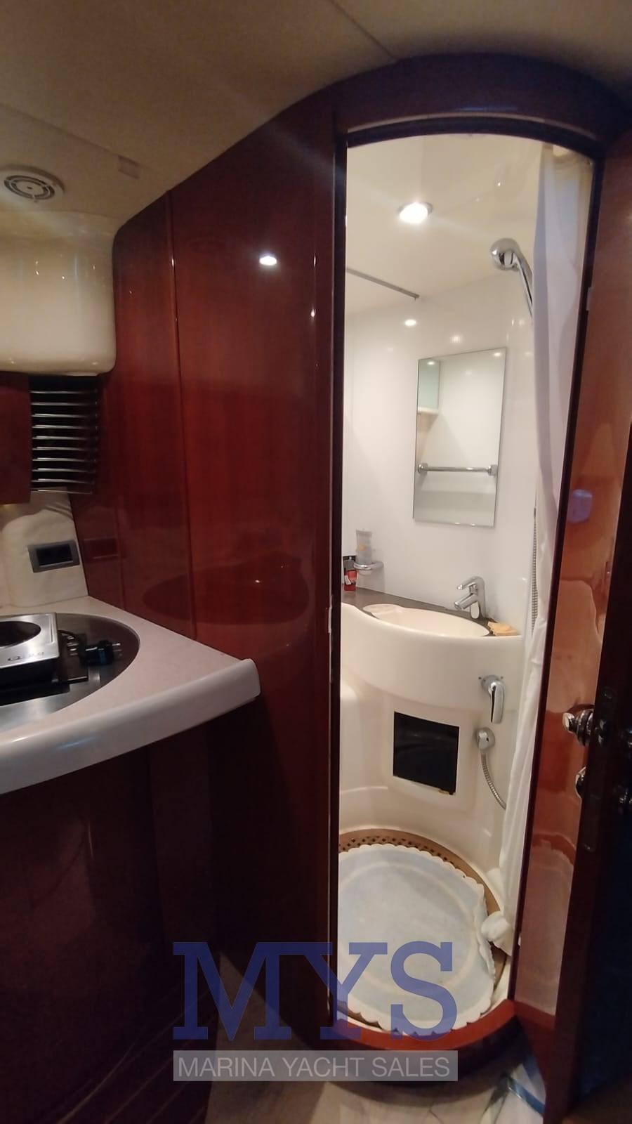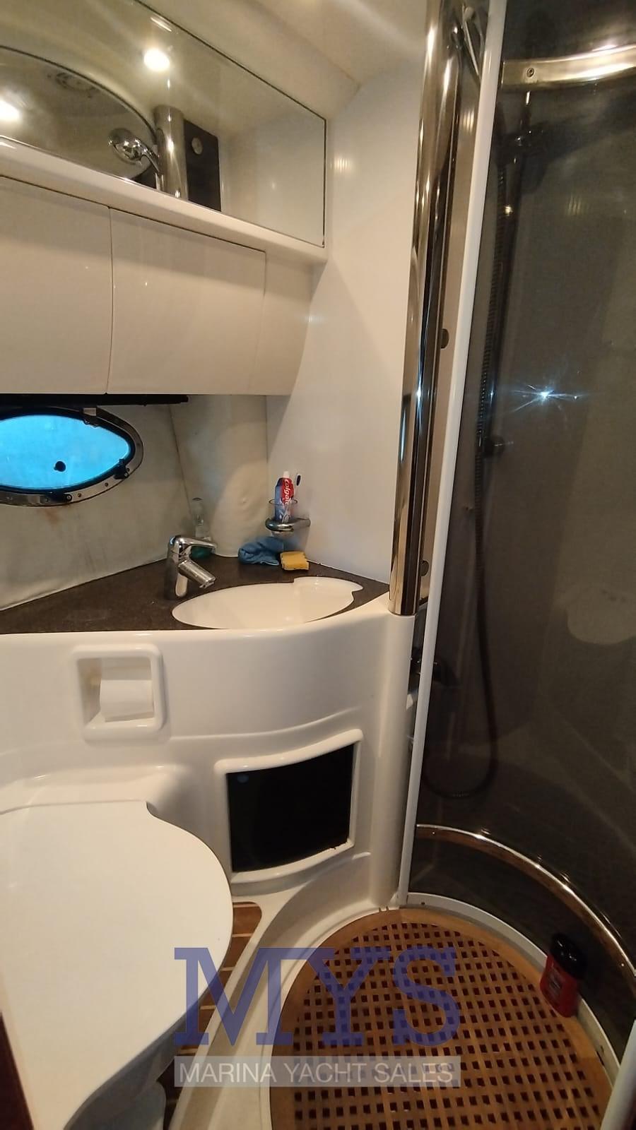 1 cabine double principale avant avec salle de bain privée équipée de lavabo, douche et toilettes marines électriques