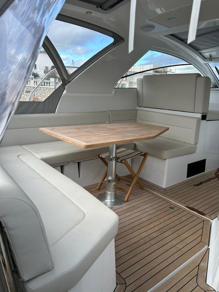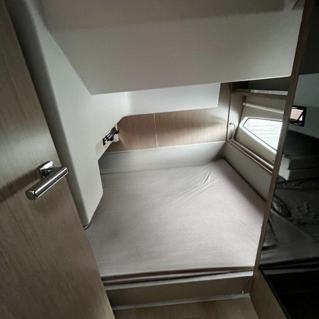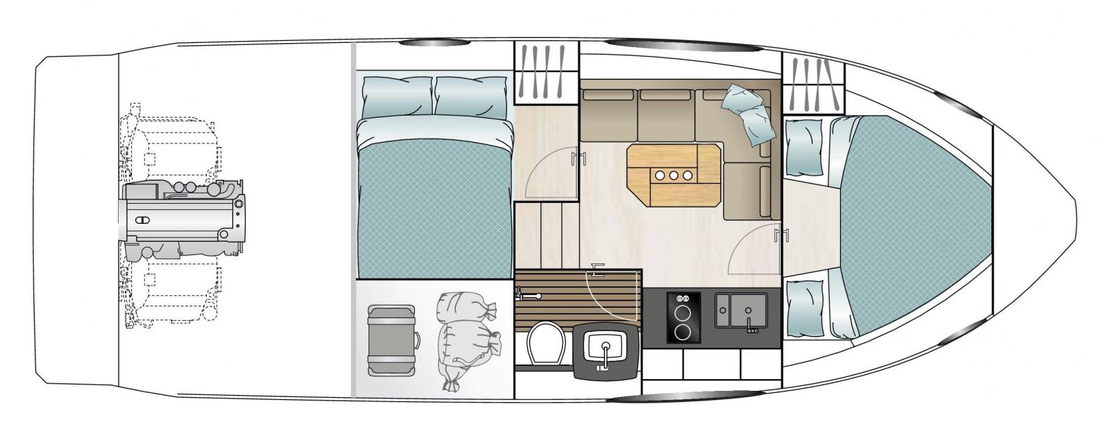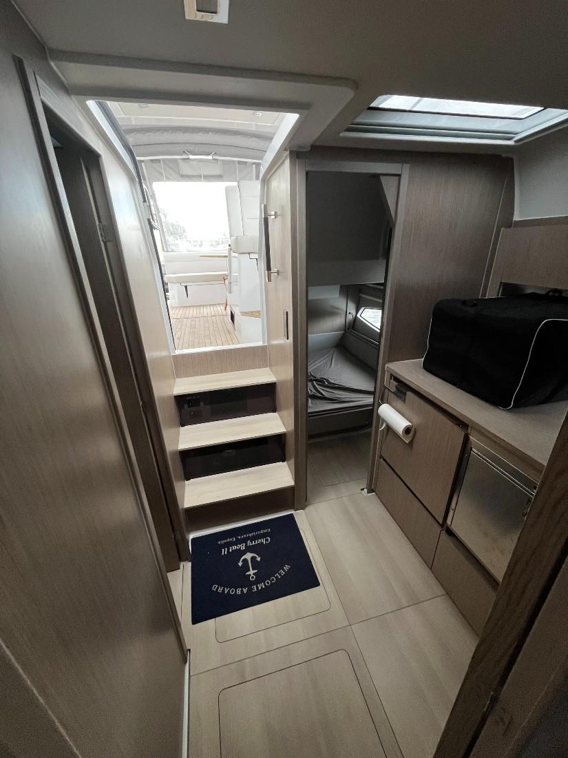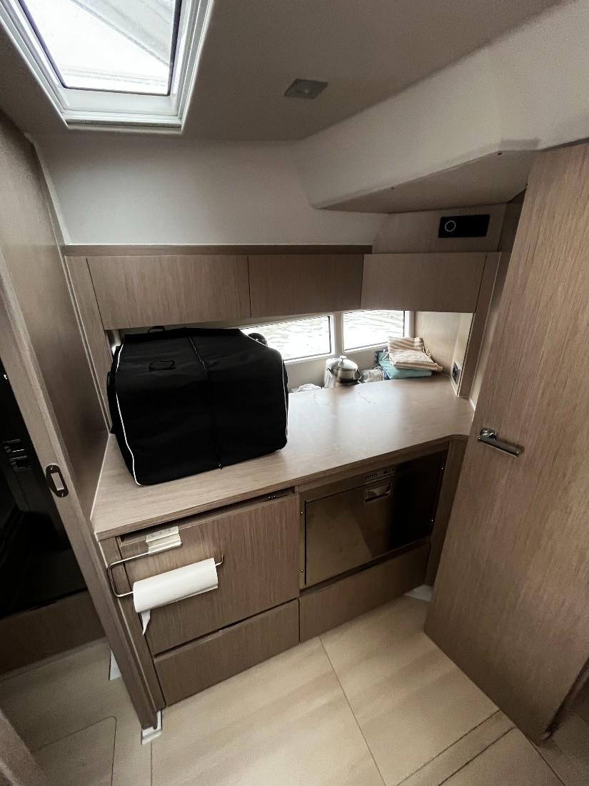 A l’intérieur, profitez de la hauteur sous barrot (2,7m), la surface des fenêtres et la taille des couchettes sont inégalées dans cette catégorie de bateaux. Sa salle de bain double zone, le plus de Sealine, Douche et WC sont séparés. Son carré intñerieur est convertible en une couchette d’apoint.