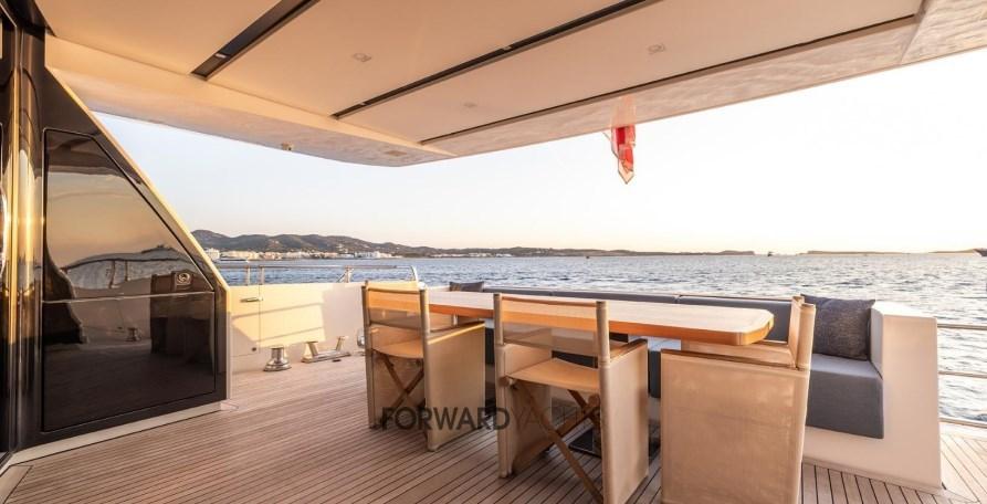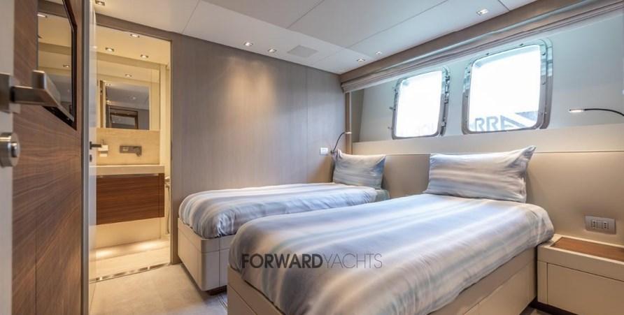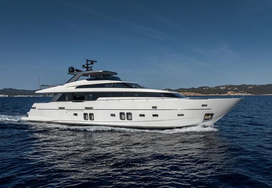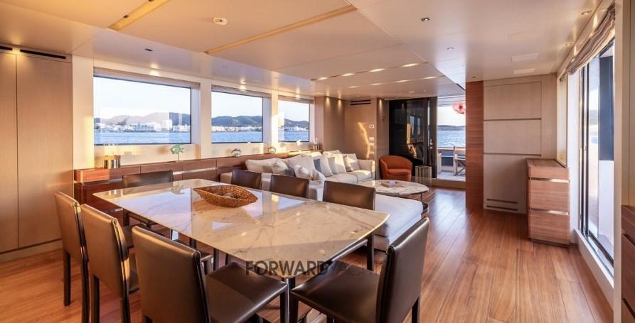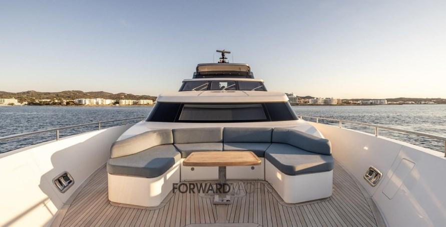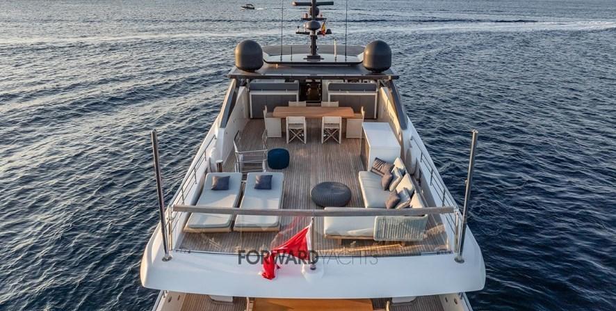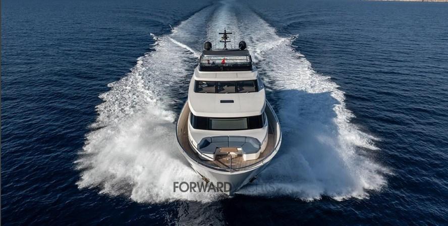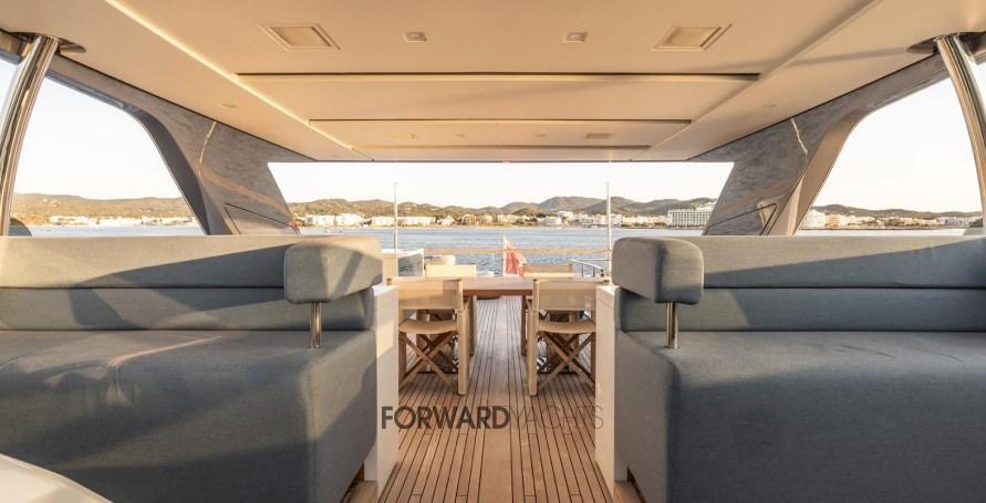 Caractérisé par de grands espaces intérieurs et extérieurs élégants et confortables, le bateau propose 5 cabines spacieuses avec suite propriétaire sur le pont principal. Équipé de 2 moteurs MTU avec quelques heures d’autonomie et équipé de nombreux accessoires supplémentaires intégrés à son équipement déjà complet, y compris des stabilisateurs à vitesse zéro, une plate-forme hydraulique, une terrasse qui peut être fermée du salon principal et la climatisation tropicale.