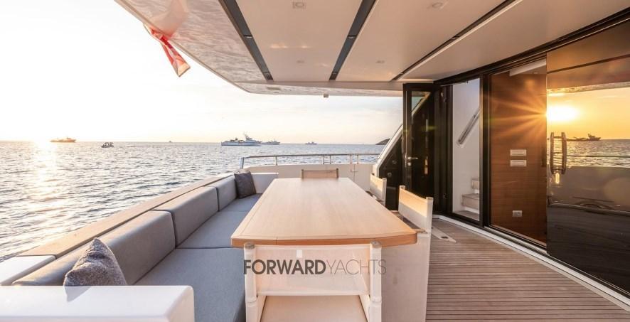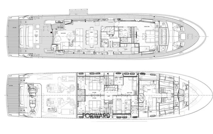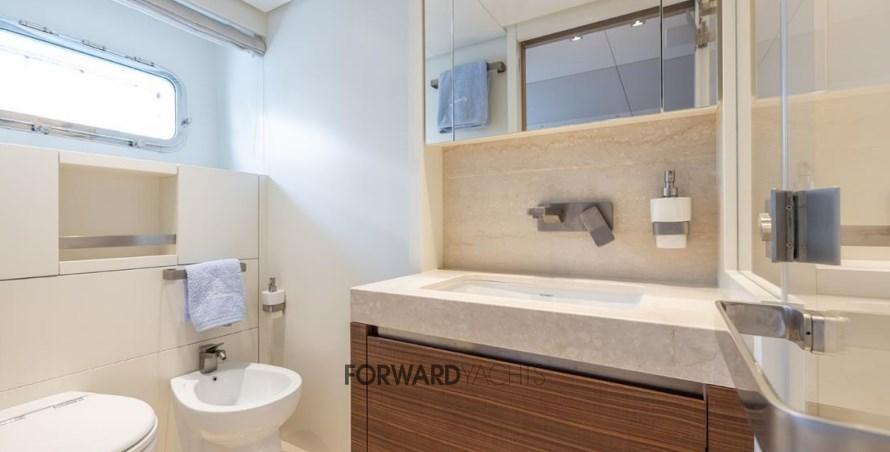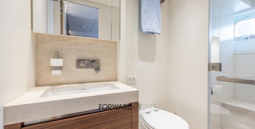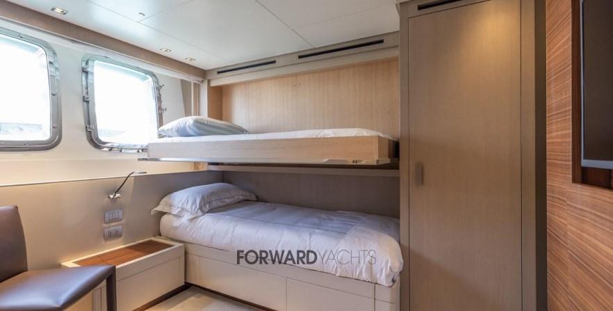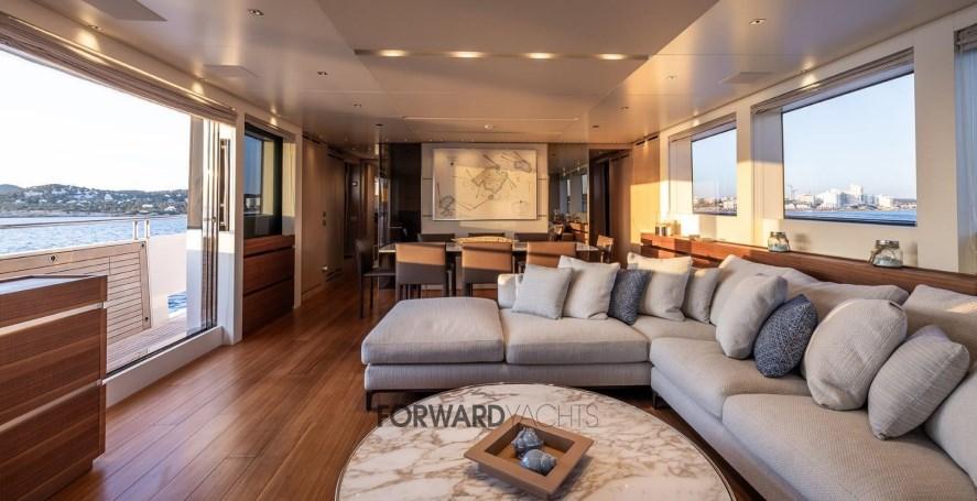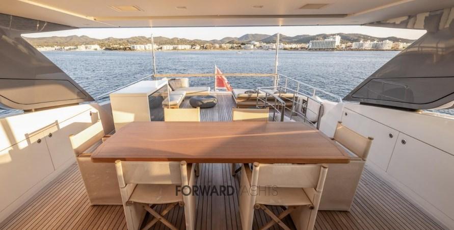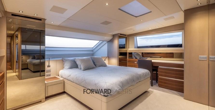 Caractérisé par de grands espaces intérieurs et extérieurs élégants et confortables, le bateau propose 5 cabines spacieuses avec suite propriétaire sur le pont principal. Équipé de 2 moteurs MTU avec quelques heures d’autonomie et équipé de nombreux accessoires supplémentaires intégrés à son équipement déjà complet, y compris des stabilisateurs à vitesse zéro, une plate-forme hydraulique, une terrasse qui peut être fermée du salon principal et la climatisation tropicale.