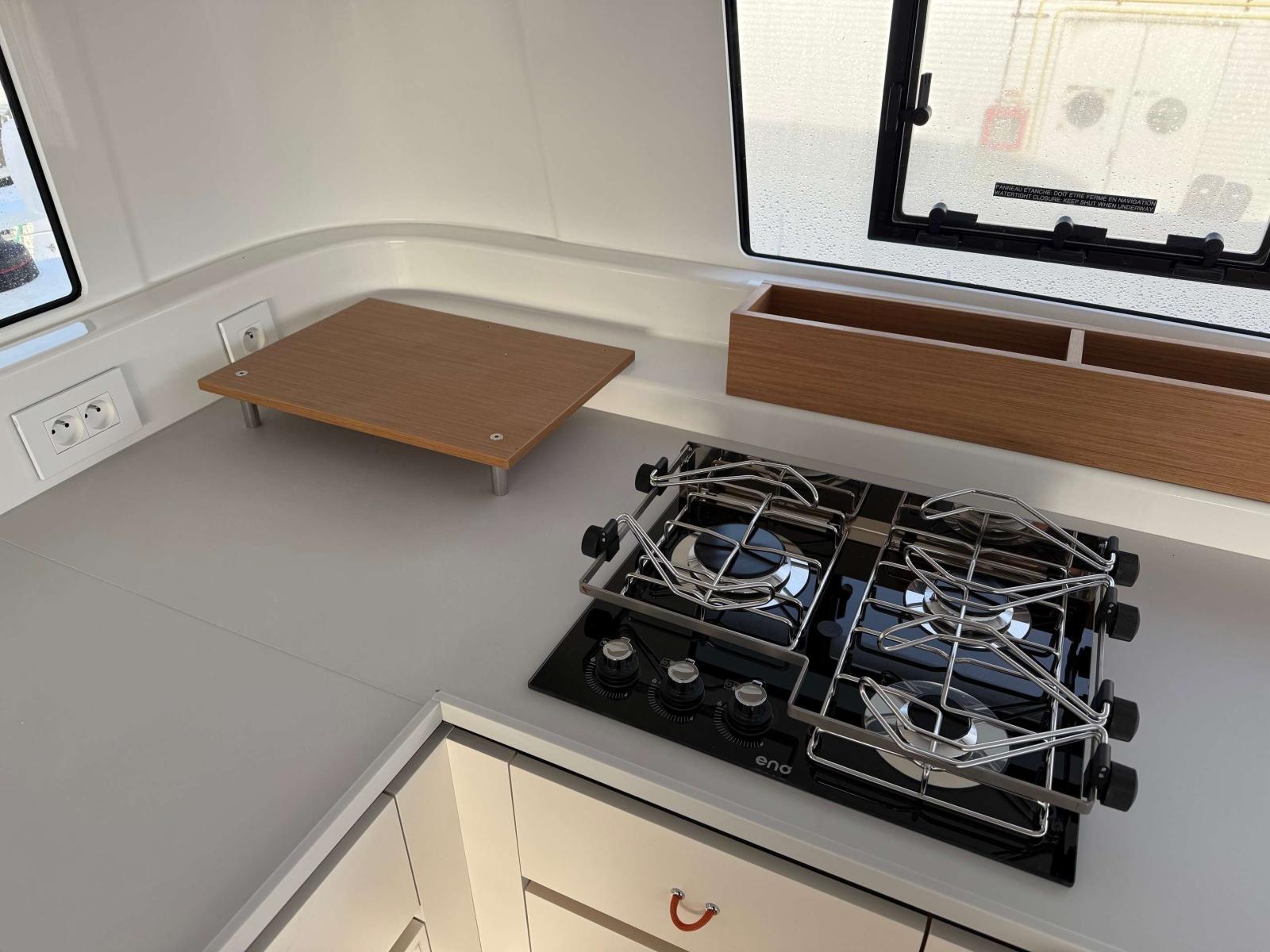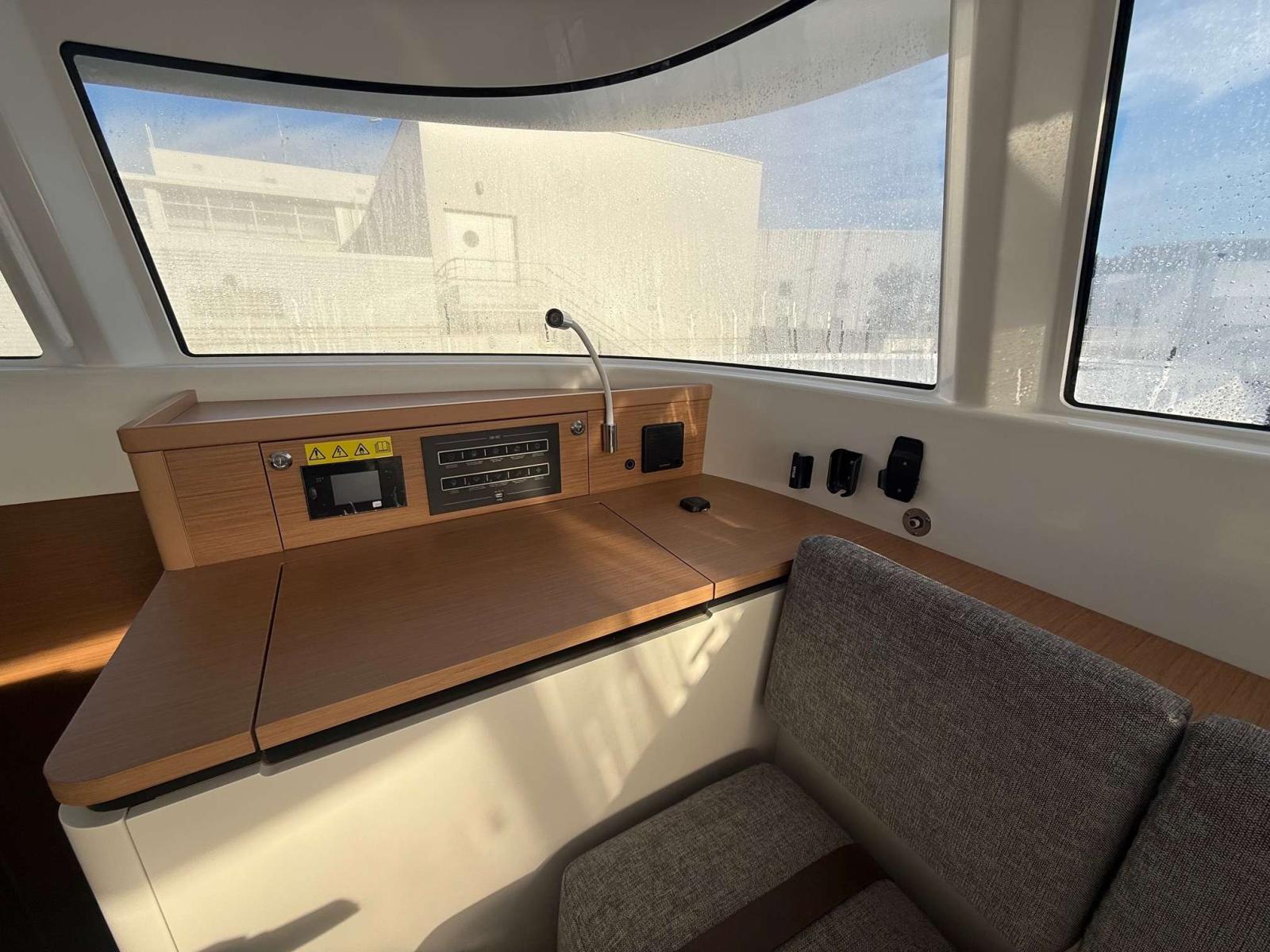 Options: Pack Sail Away, Selleries extérieures grises, 2ème siège de barre babord, Table de cockpit bois exotique avec rallonge de table, Flat winder de grand voile, Accastillage de Code 0 avec long bout-dehors gris et emmagasineur, Code 5 Stormlite (130m²) + Bande UV, Lazy-bag, Escalier d'accès au roof, Panneaux solaires sur bossoirs (3*300W), 4 batteries lithium 200 Ah, Bossoirs d'annexe, Support de moteur HB, Dessalinisateur 100L/H, Commande à distance guindeau électrique, Convertisseur 12-220V 3Kva, réservoir eau douce supplémentaire 300L, Pompe de lavage de pont eau douce et eau de mer, Plans de travail Kerroch dans cuisine et salle de bain, Sommiers à lattes, WC électriques eau de mer, Pré-dispo micro-onde et Lave-linge, Réfrigerateur - Conservateur optionnel dans le carré 155L, Ecran Garmin 12 pouces à babord et tribord, Télécommande de pilote Garmin, Radar GARMIN et AIS 800, 2 taquets sur étraves, paintcoat dans pointes avant, balcon avant et fillière assises composite, toiles de tour.