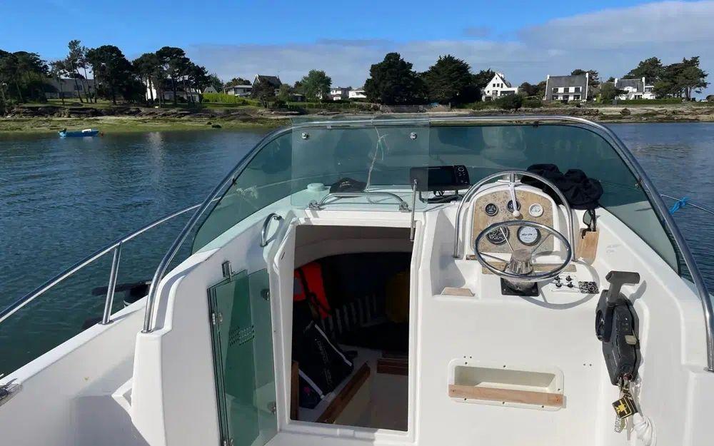 Avec ses formes arrondies et quelques touches de teck dans le cockpit, il adopte une ligne élégante et ses aménagements le rendent parfait pour la petite croisière en couple. Son cockpit est vaste et accueille une grande banquette arrière en U, modulable en bain de soleil. En dessous de celle-ci, trois coffres permettent de recevoir aussières et pare-battages. Un peu plus sur l'avant, derrière les deux sièges baquets, on trouve le poste de pilotage à tribord, protégé par un parebrise ceinturé d'une main courante en inox. Cette dernière est très fonctionnelle pour accéder à la plage avant.