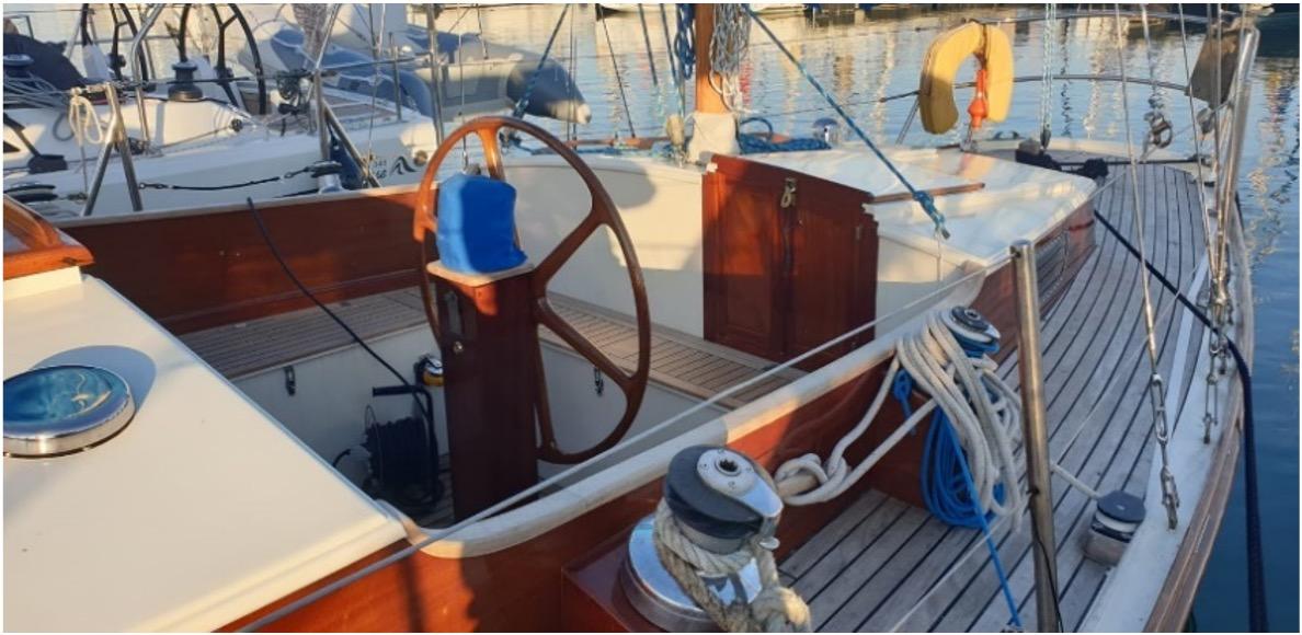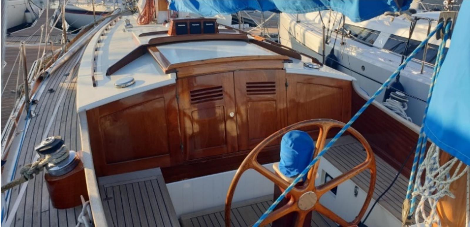 Pont et superstructures : Pont latté teck sur contreplaqué marine, restauré en 2023 sur barrotage d'origine en acajou.