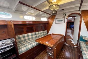 Carré repeint et revernis, avec couchette double sur bâbord et une couchette simple sur tribord. Sellerie neuve dans cabine avant et cabine arrière, mousse neuve dans le carré.