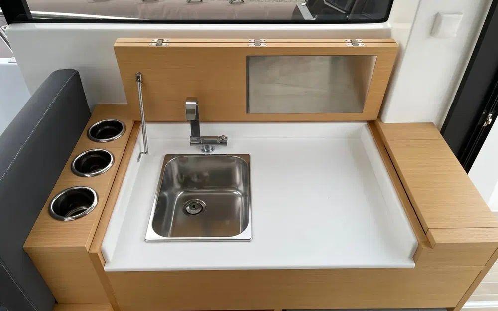 Détails haut de gamme : Pont en teck synthétique, douche de cockpit, banquette et tables extérieures