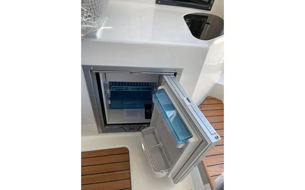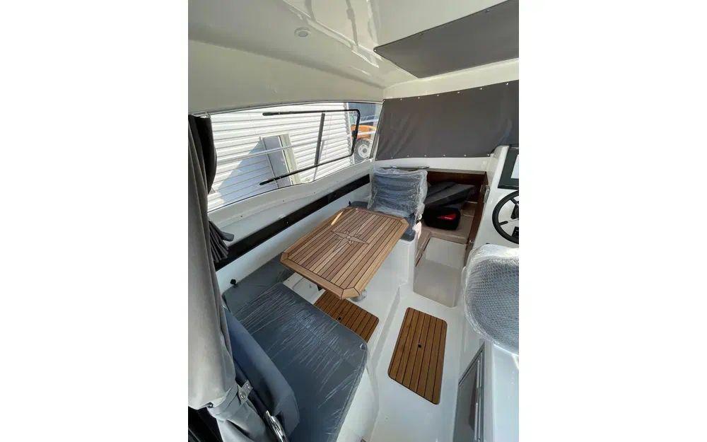 Feu de travail du pont arrière, douche de pont, rideau intérieur (pare-brise, arrière et latéraux), rouleau d’étrave, davier, échelle de bain, ventilation et éclairage LED de la cabine, essuie-glace, pompe de cale, réservoir d’eau douce 40 L, banquette arrière, table dans la cabine, toit panoramique, ouverture latérale des vitres, tube à cannes sous passavants.