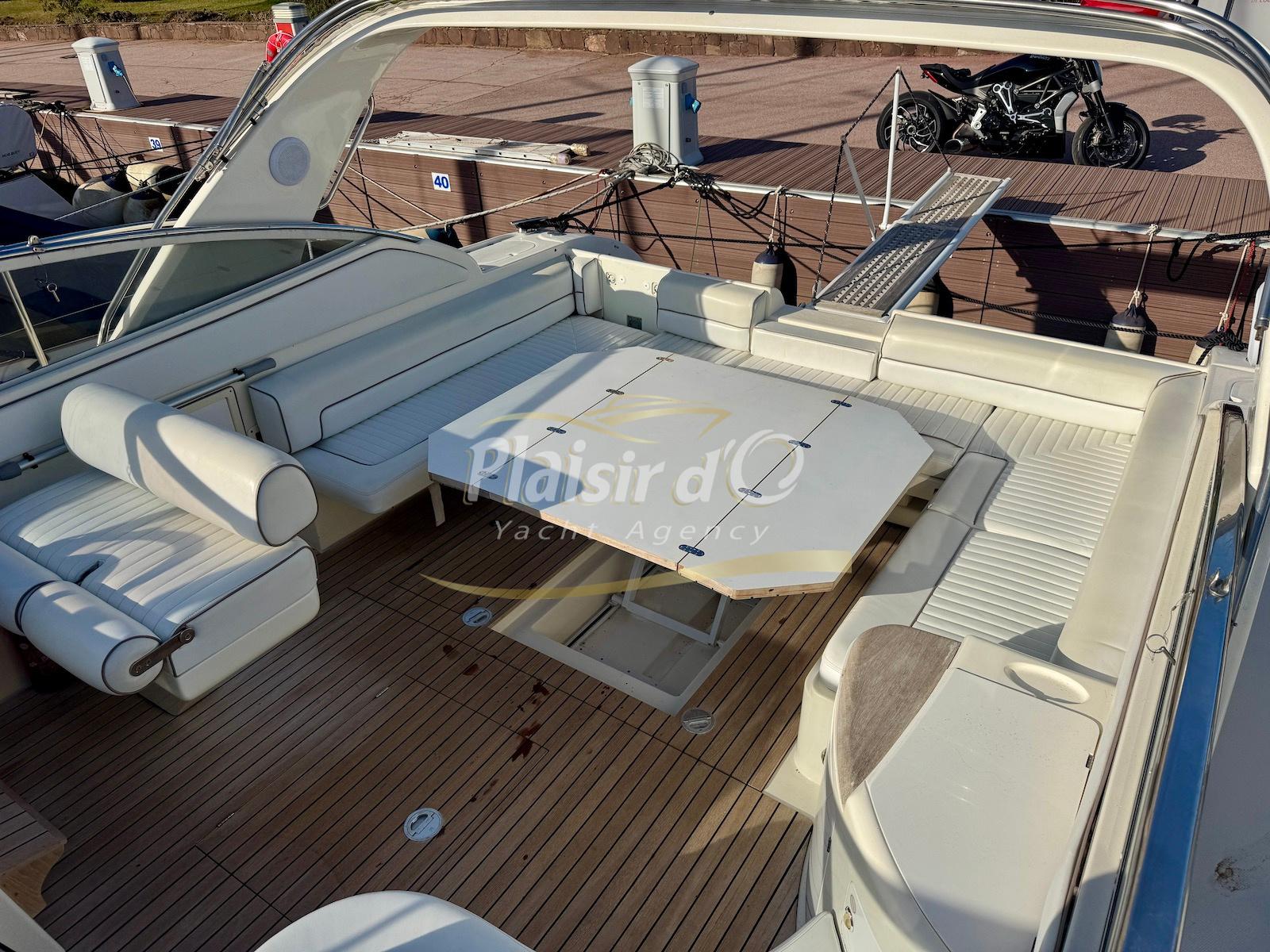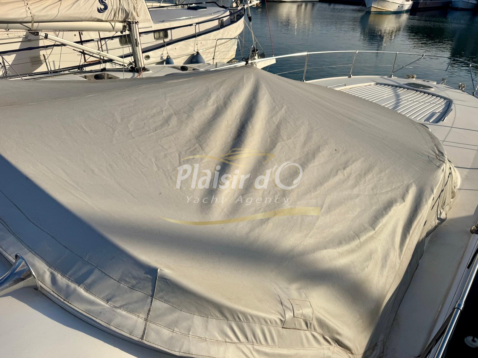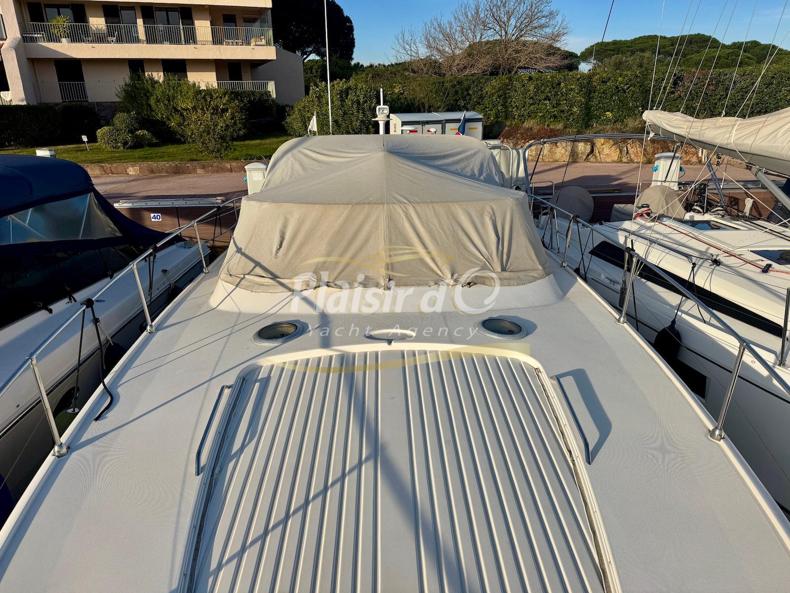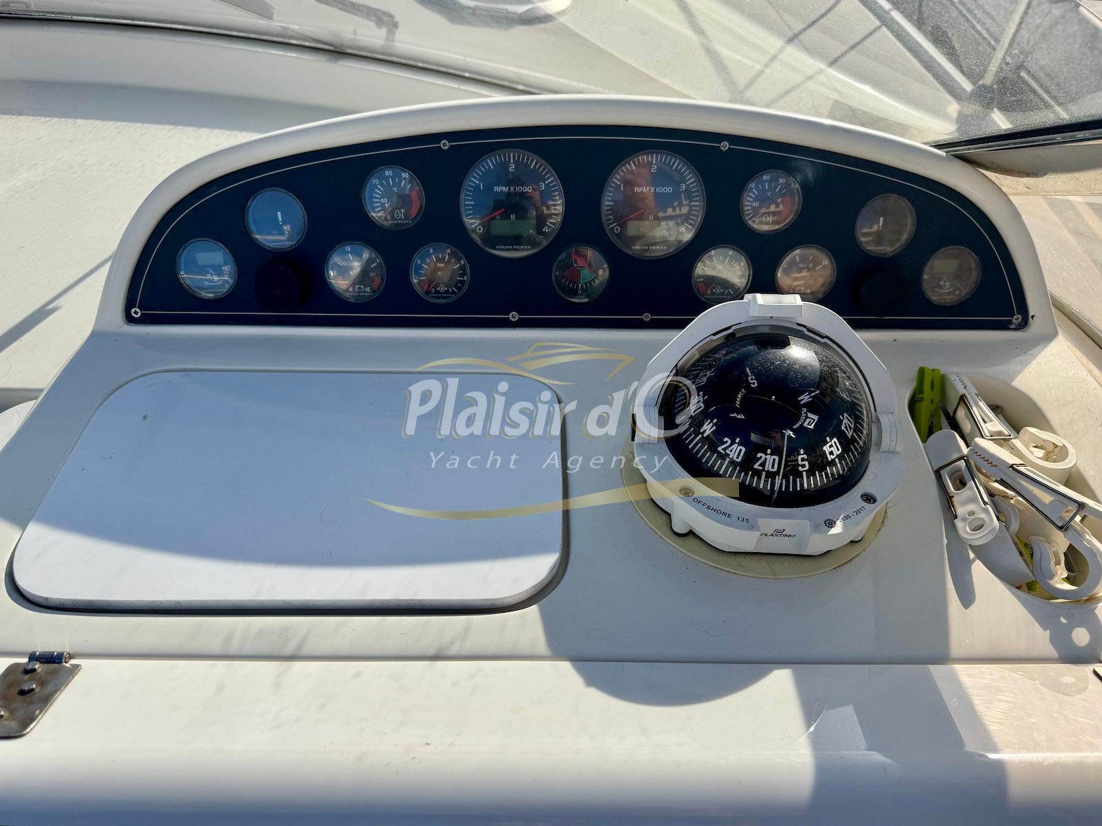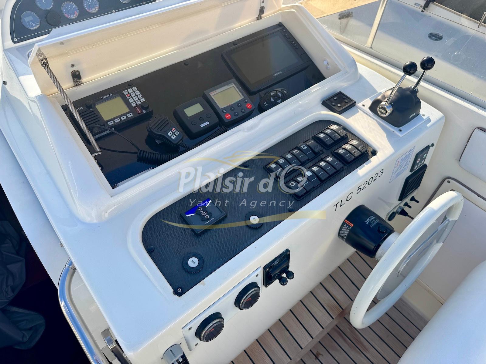 Nombreuses options : Volvo Penta D6-310; propulseur d’étrave, passerelle hydraulique, table de cockpit hydraulique, guindeau électrique, compteur de chaine, GPS Garmin récent, VHF Navicom, pilote automatique, TV, 2 réfrigérateurs, système fusion, sellerie complète récente, Bimini, taud de cockpit complet + taud de tableau de bord et siège pilote …
