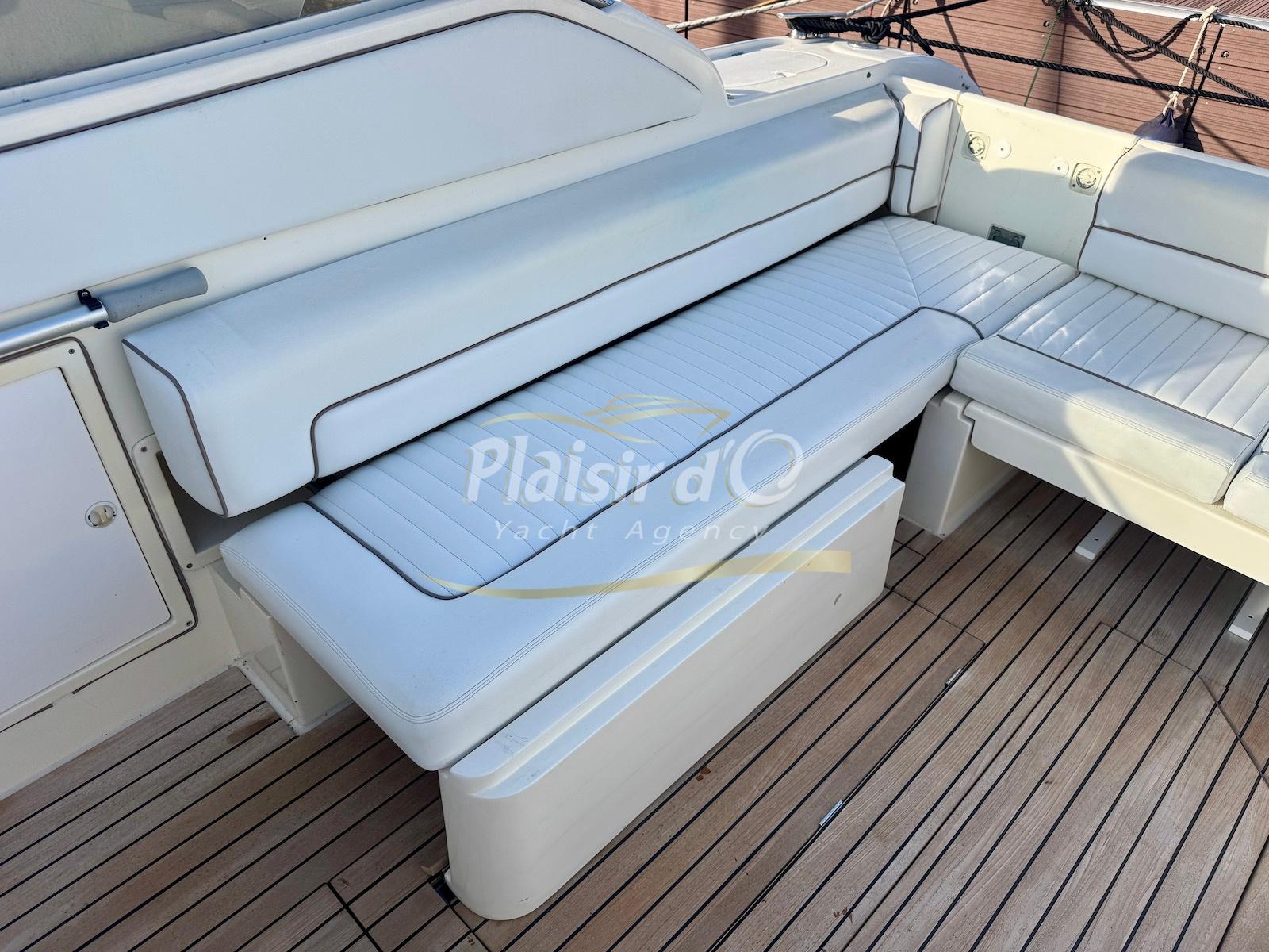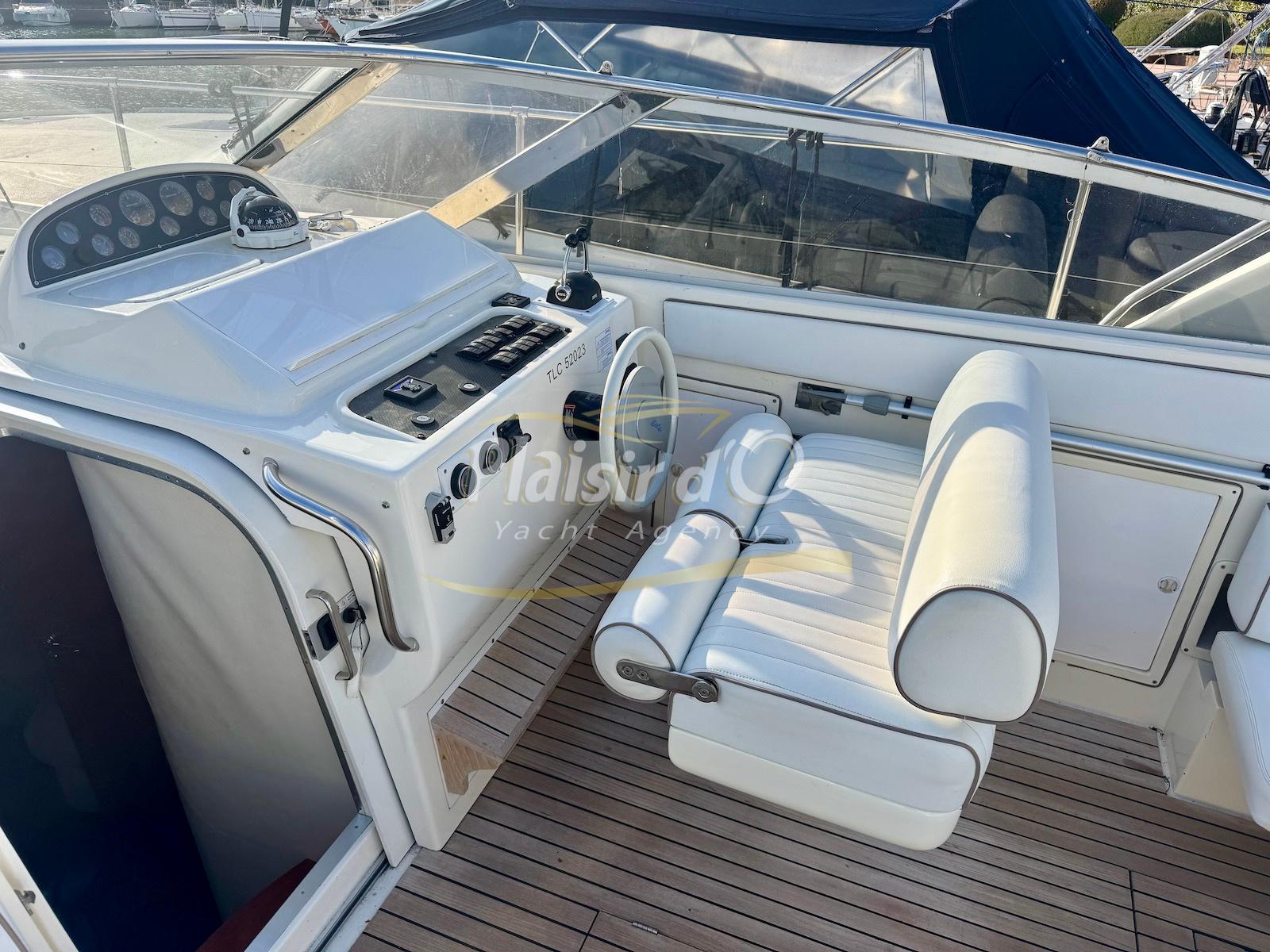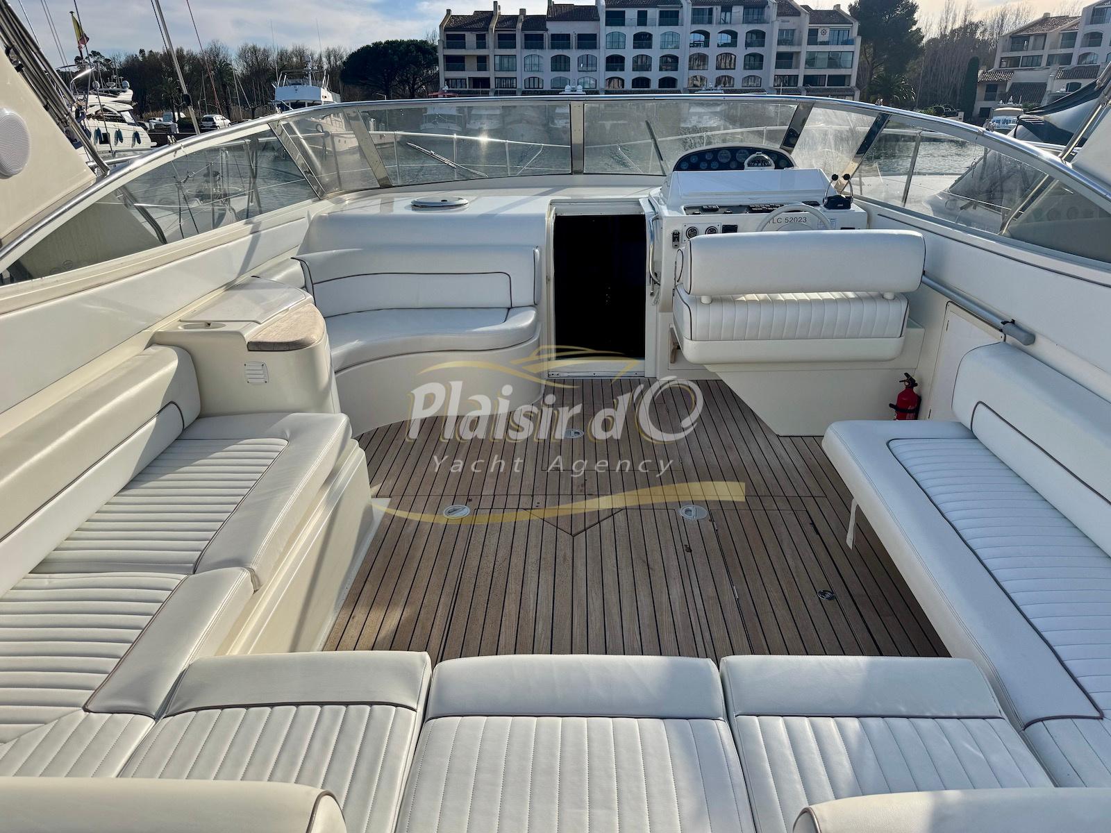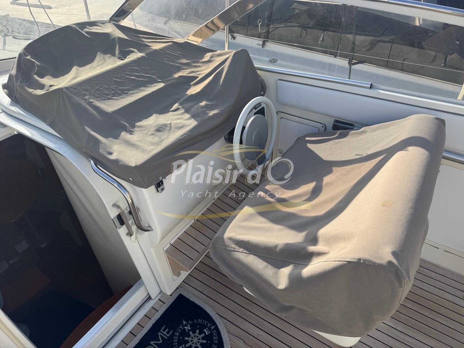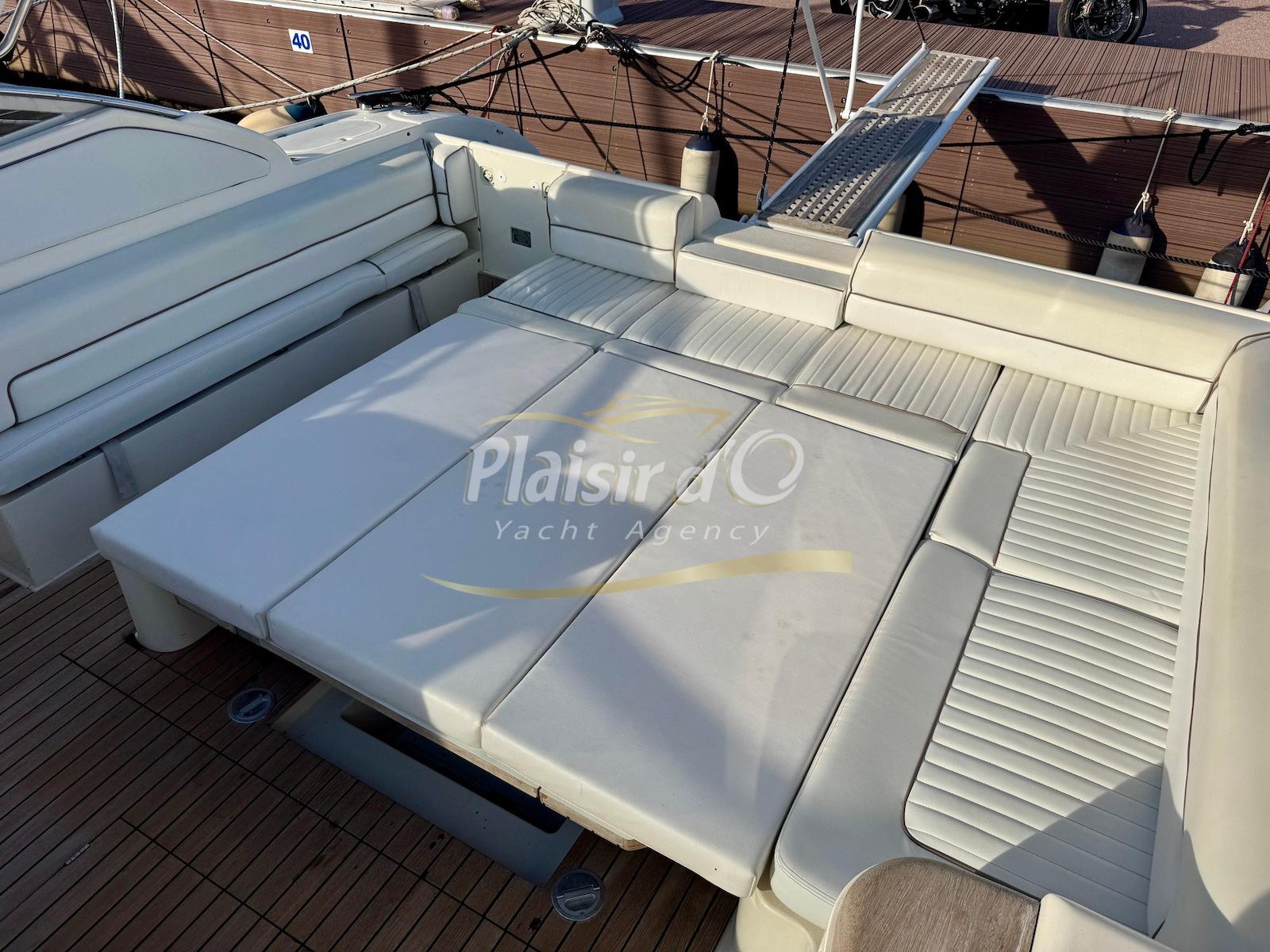 Nombreuses options : Volvo Penta D6-310; propulseur d’étrave, passerelle hydraulique, table de cockpit hydraulique, guindeau électrique, compteur de chaine, GPS Garmin récent, VHF Navicom, pilote automatique, TV, 2 réfrigérateurs, système fusion, sellerie complète récente, Bimini, taud de cockpit complet + taud de tableau de bord et siège pilote …